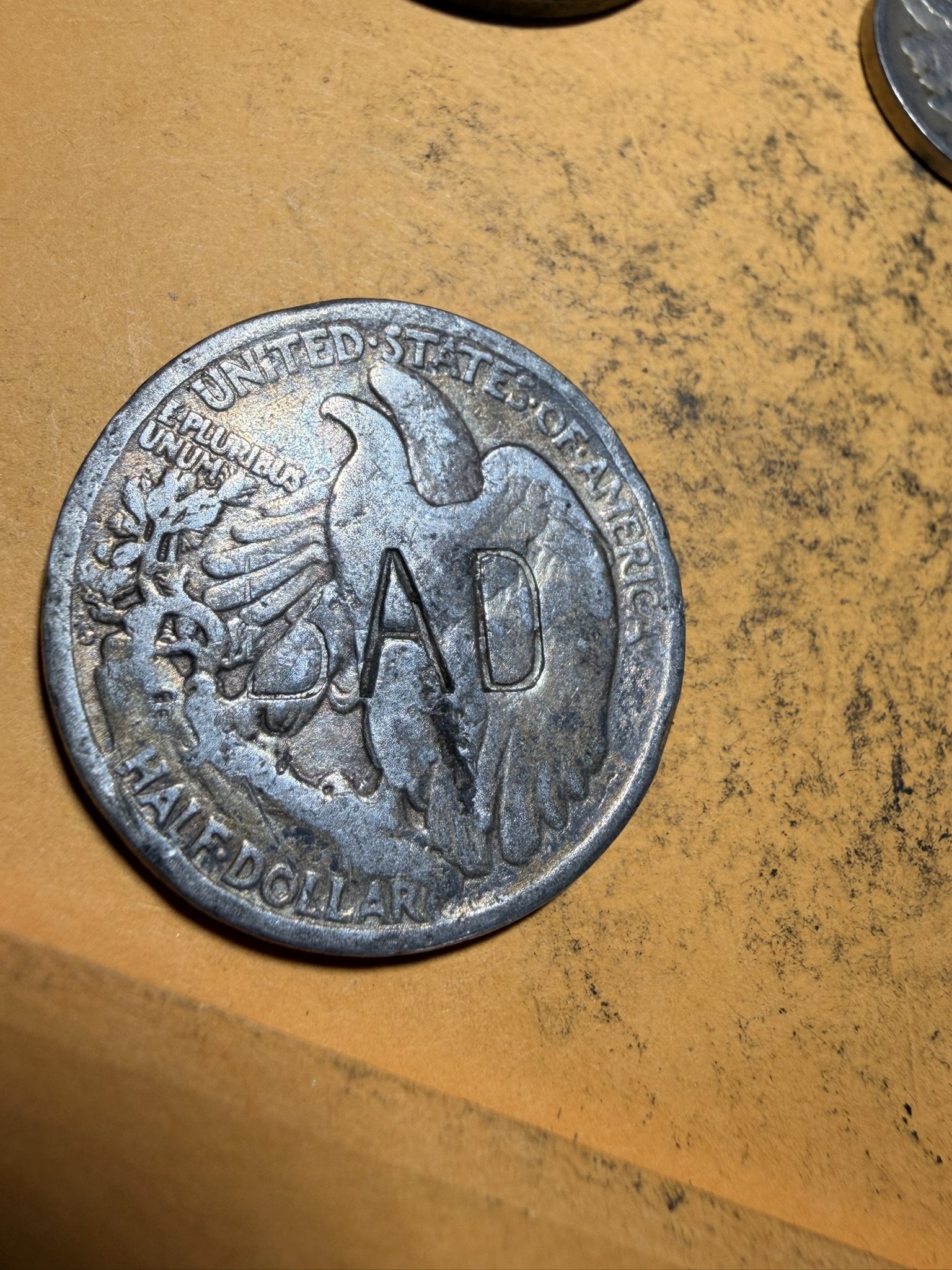 The first is this "walking half dollar." It's stamped "BAD" on both sides. Is this something the mint would have done prior to destroying it? Or who/why? Do you suppose it's worth anything as such?