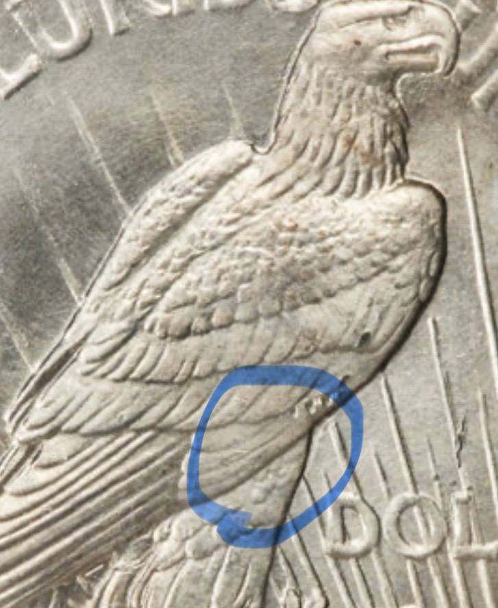 Here’s a coin listed in a Heritage sale from 1/12/23. It’s an NGC 1921 Satin Proof PR66. This is about as good as strike gets with these. Pay particular attention to the feathers in the blue circle. It’s unusual to be able to see the distinct separation in this area.