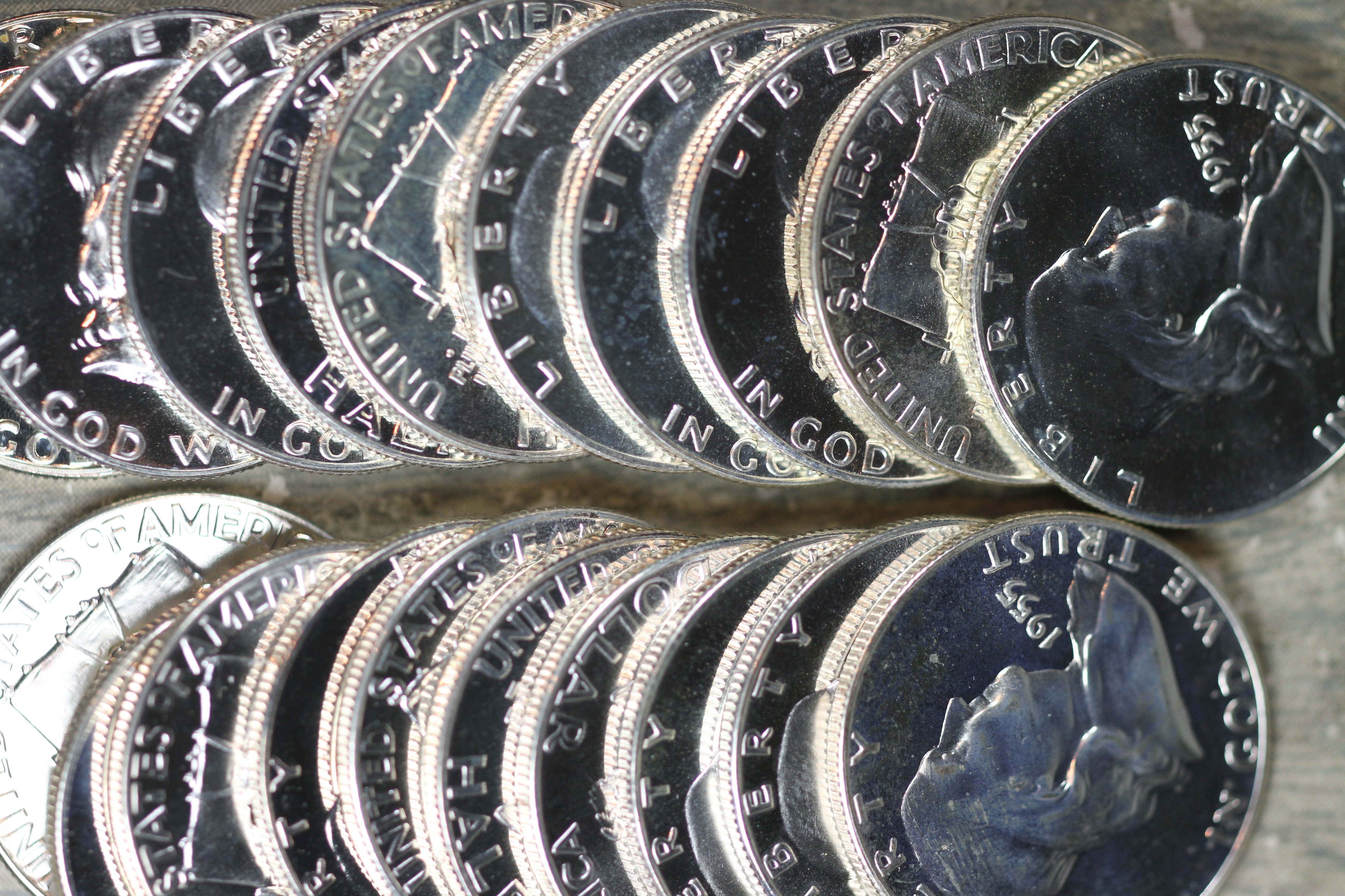 Three rolls of Proof Franklin Half Dollars 1954, 1955, 1956 $2000 (1954 roll has a few coins with hairlines - other rolls are very nice)