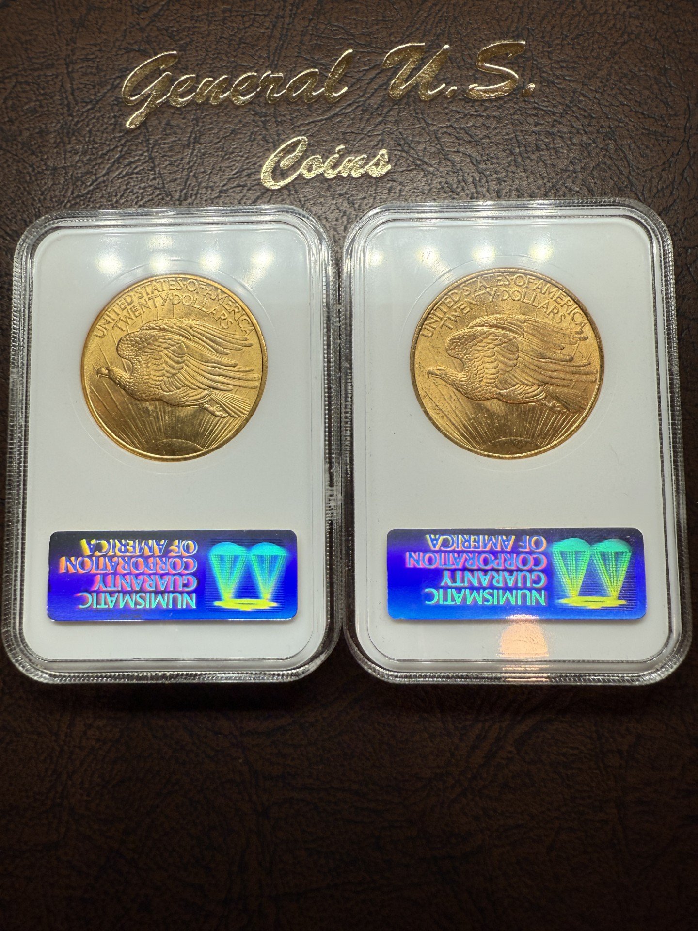 2 1908 $20 Saint Gauden's - MS 62 and MS64. Both holders are pristine with minimal scratches, if any, and complete holograms. I have not sent them to CAC.