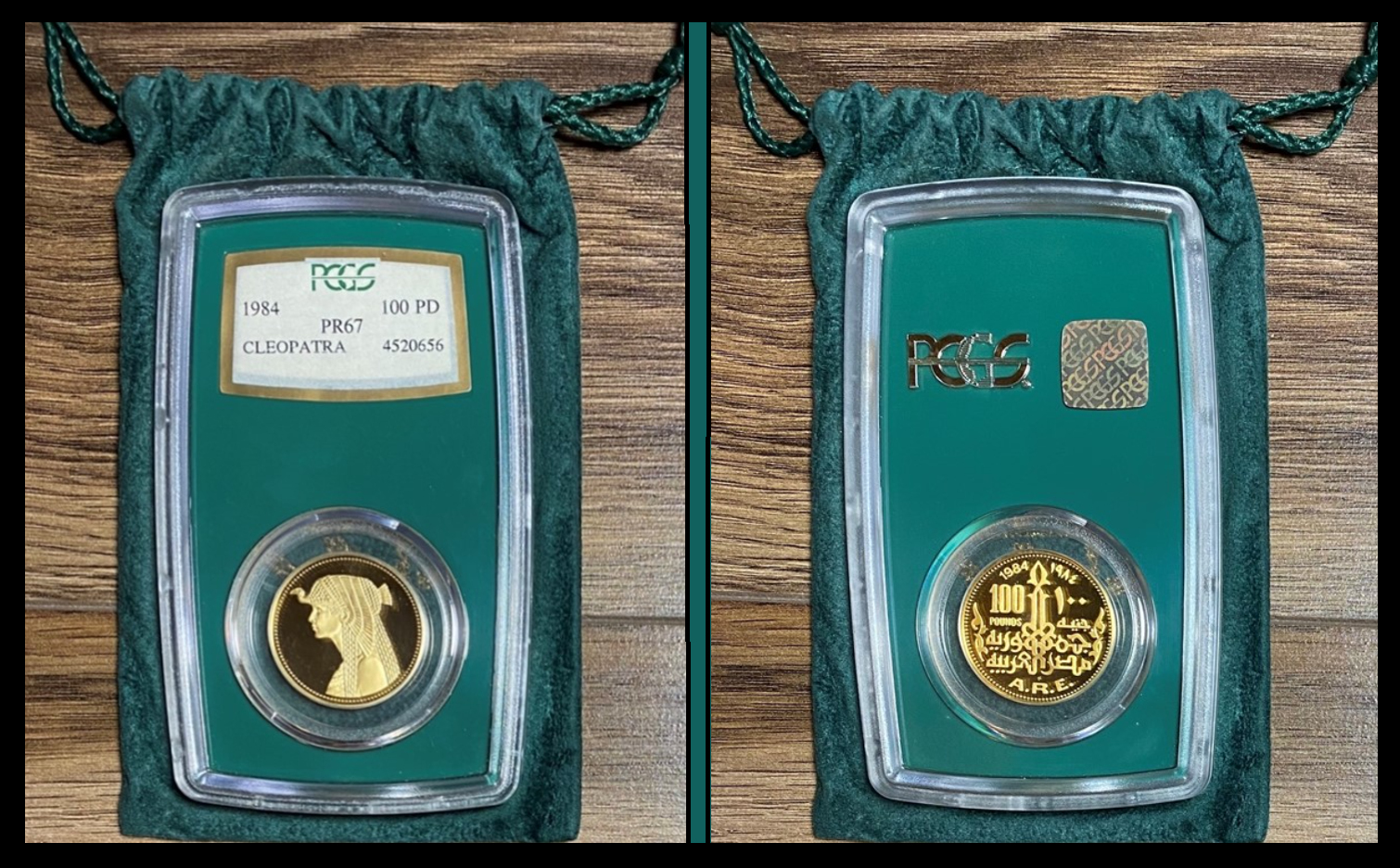 The Regency holder and green drawstring bag are in wonderful condition with only light hairlines on the slab and PCGS gold letters intact on the forest green satchel.