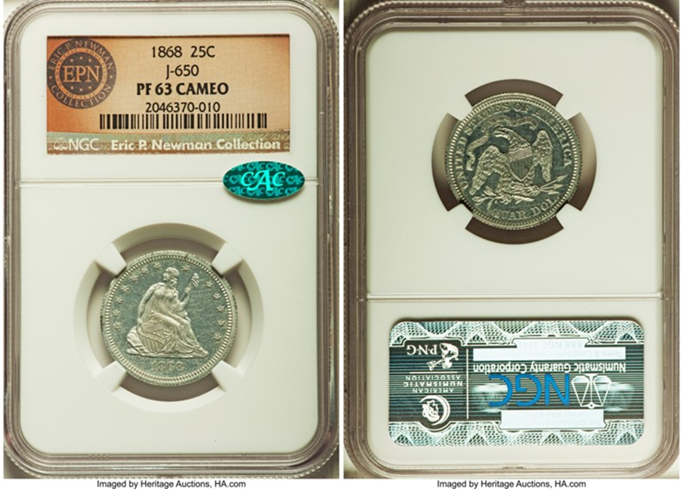 While I have several interesting pieces with numismatic history … a recent pick up that I think is a hoot is this J650. This piece was originally part of one of the few known 1868 Aluminum 16-piece Case Sets produced by the Philadelphia Mint. Its provenance is documented, beginning with Secretary of the Treasury Hugh McCulloch in 1868, passing through McCulloch's heirs, then to Eric Newman, and finally to the Eric P. Newman Educational Foundation and Museum where is was eventually broken up for the Heritage Nov. 2014 Auction - Selections from the Eric P. Newman Collection Part V - New York / Lot #3448