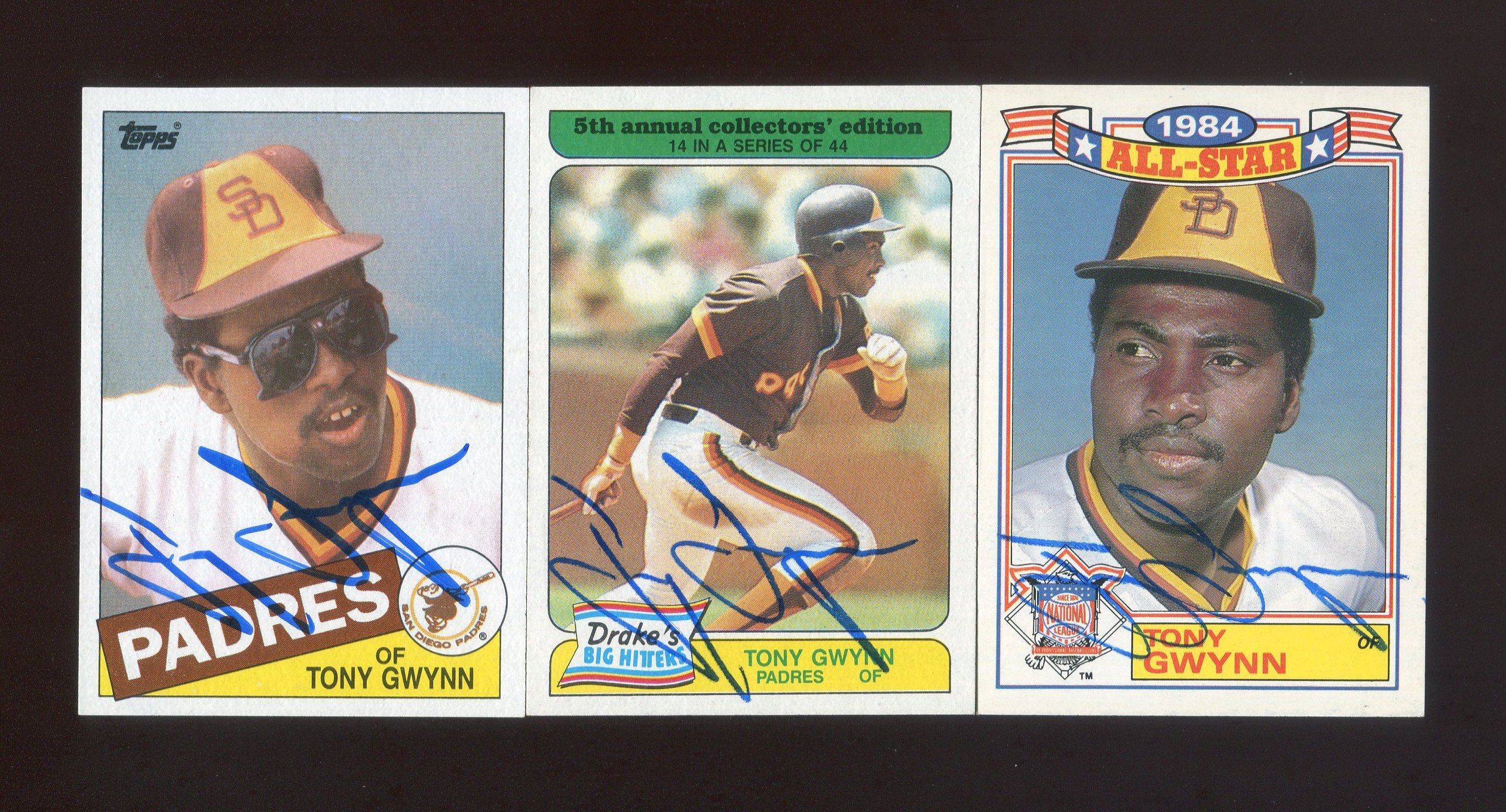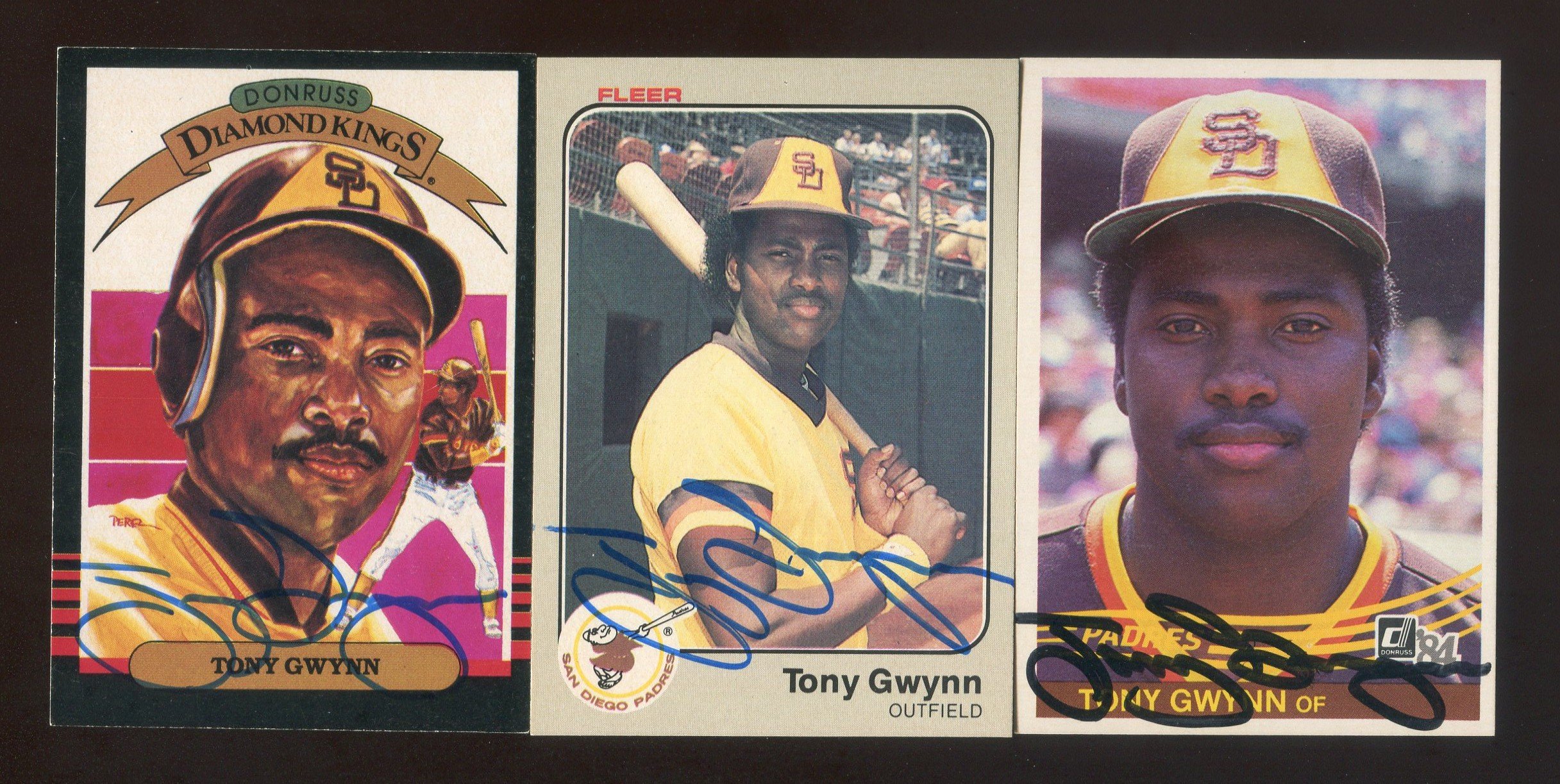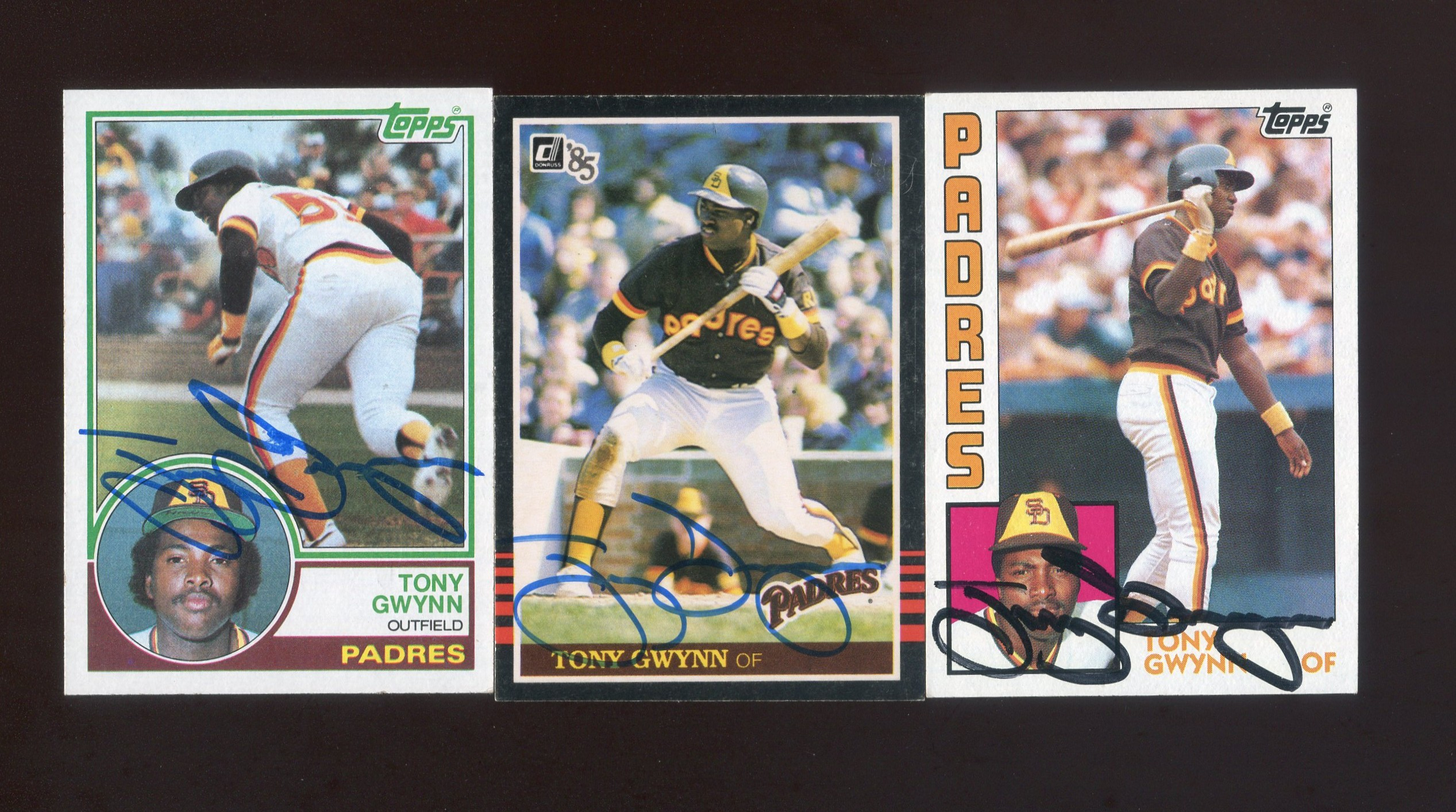 Tony Gwynn was a known signer and I sent all of these cards for him to sign (care of the Padres) over a time period. The signatures seem to be a few different styles: more of a round loopy signature and in the last picture, a group that is more sharp and angular. I have looked on eBay at PSA DNA examples and it seems there are many different looking signatures that are encapsulated. I saw some eye popping numbers under 'sold items' for his signed 1983 Topps card. This got me thinking of submitting some of these. What are your thoughts on the signatures and what would be the best PSA service to use (ie - 'authentic', grade the signature, grade both signature and card)? I have never sent a signed card to PSA before.