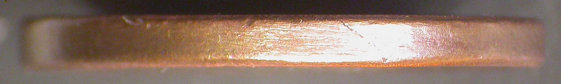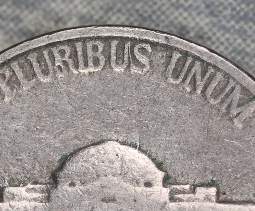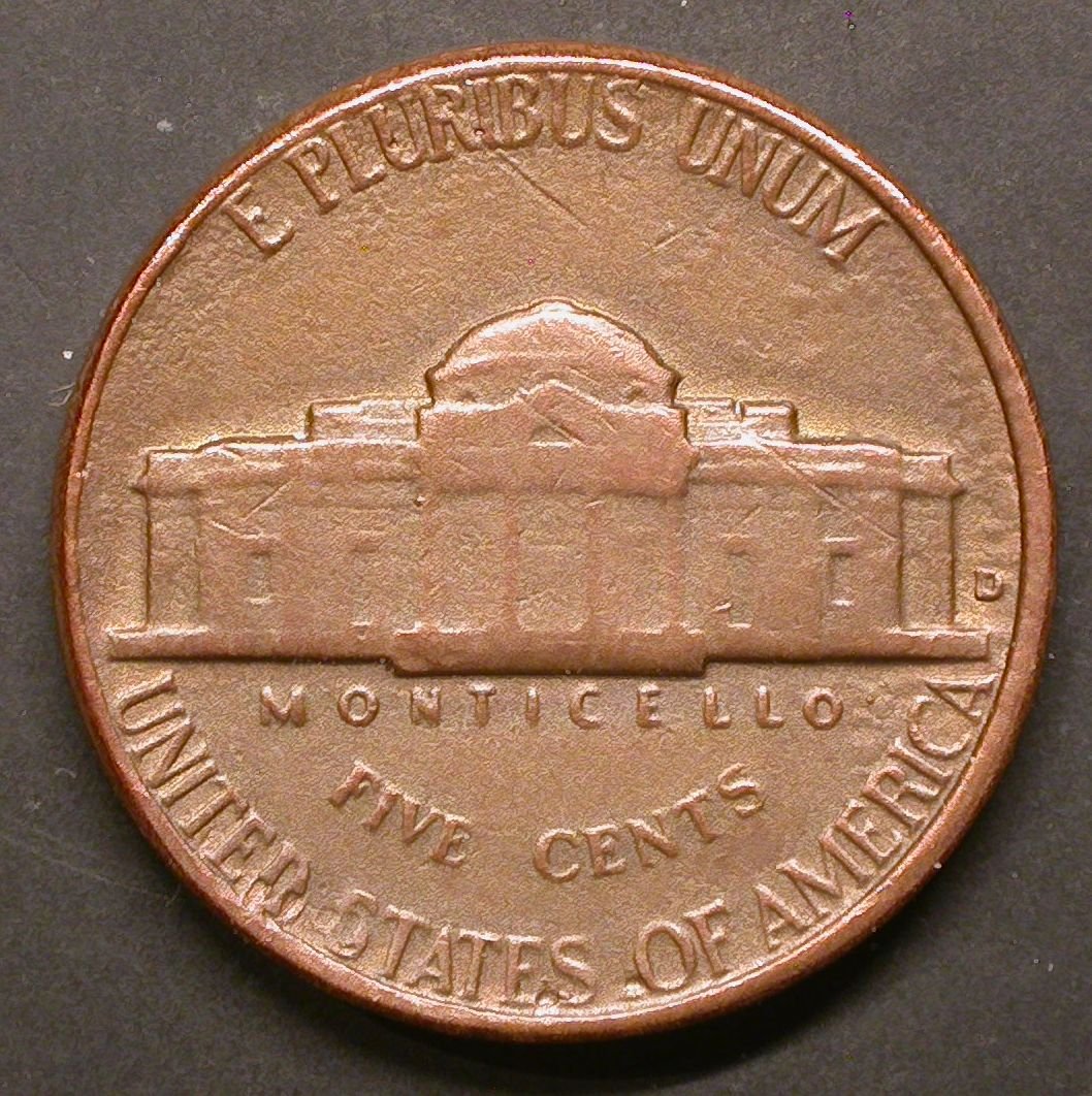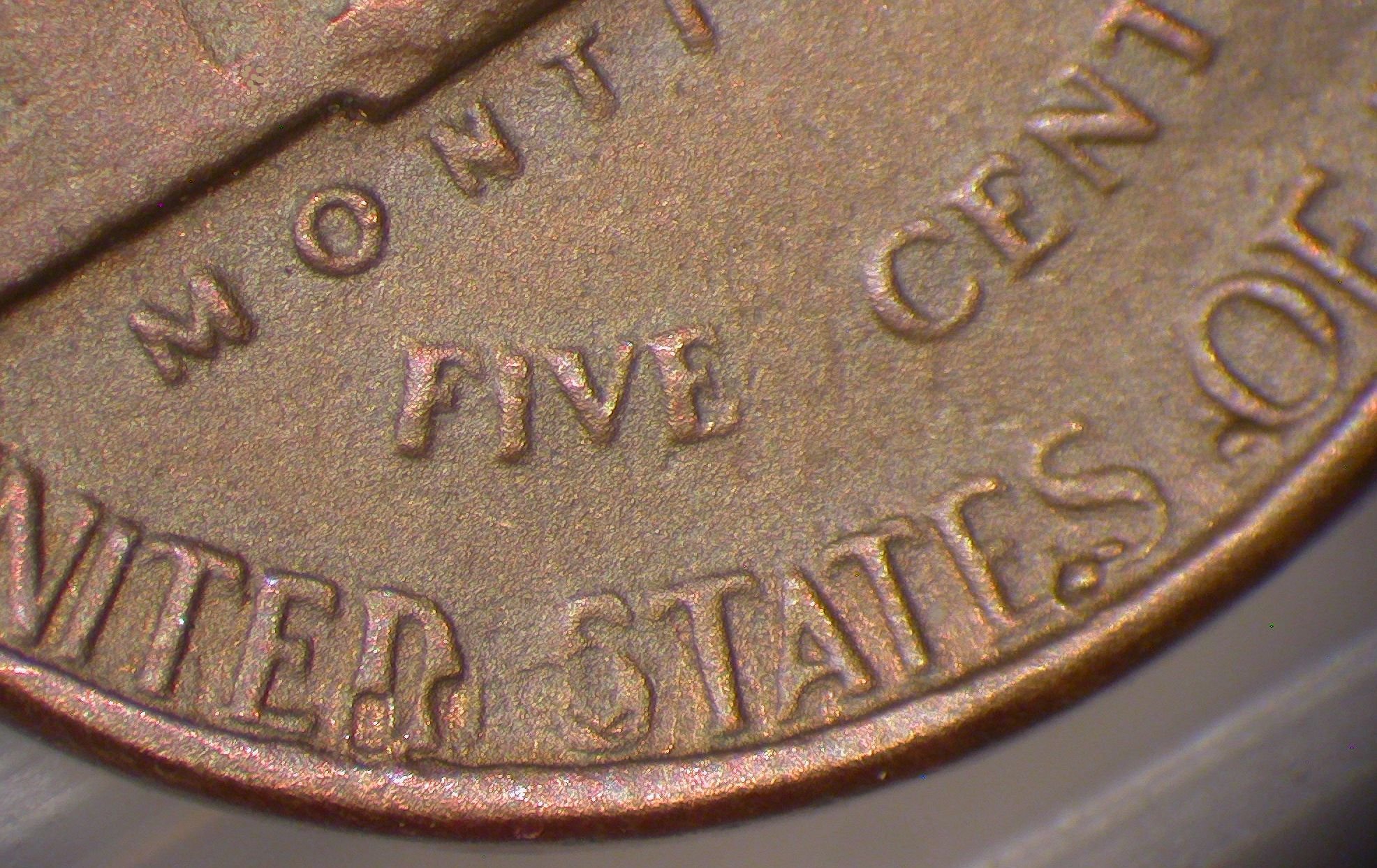 Here is a Jefferson 5-cent piece that was cast in solid copper (at 5.50 grams it is 10% too heavy compared to a genuine coin). Note the similar defects on the "D" of UNITED and near the second "S" in STATES: