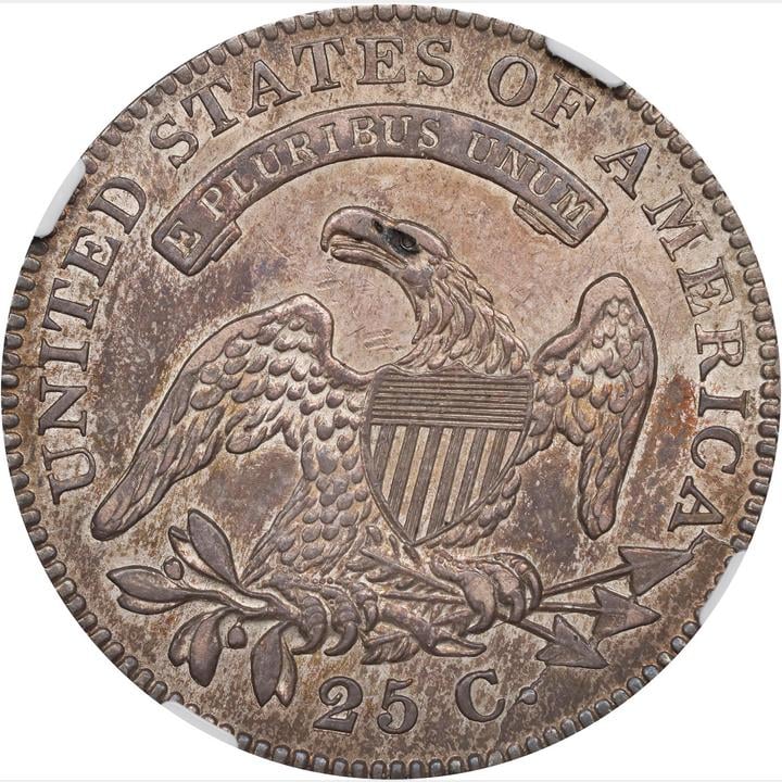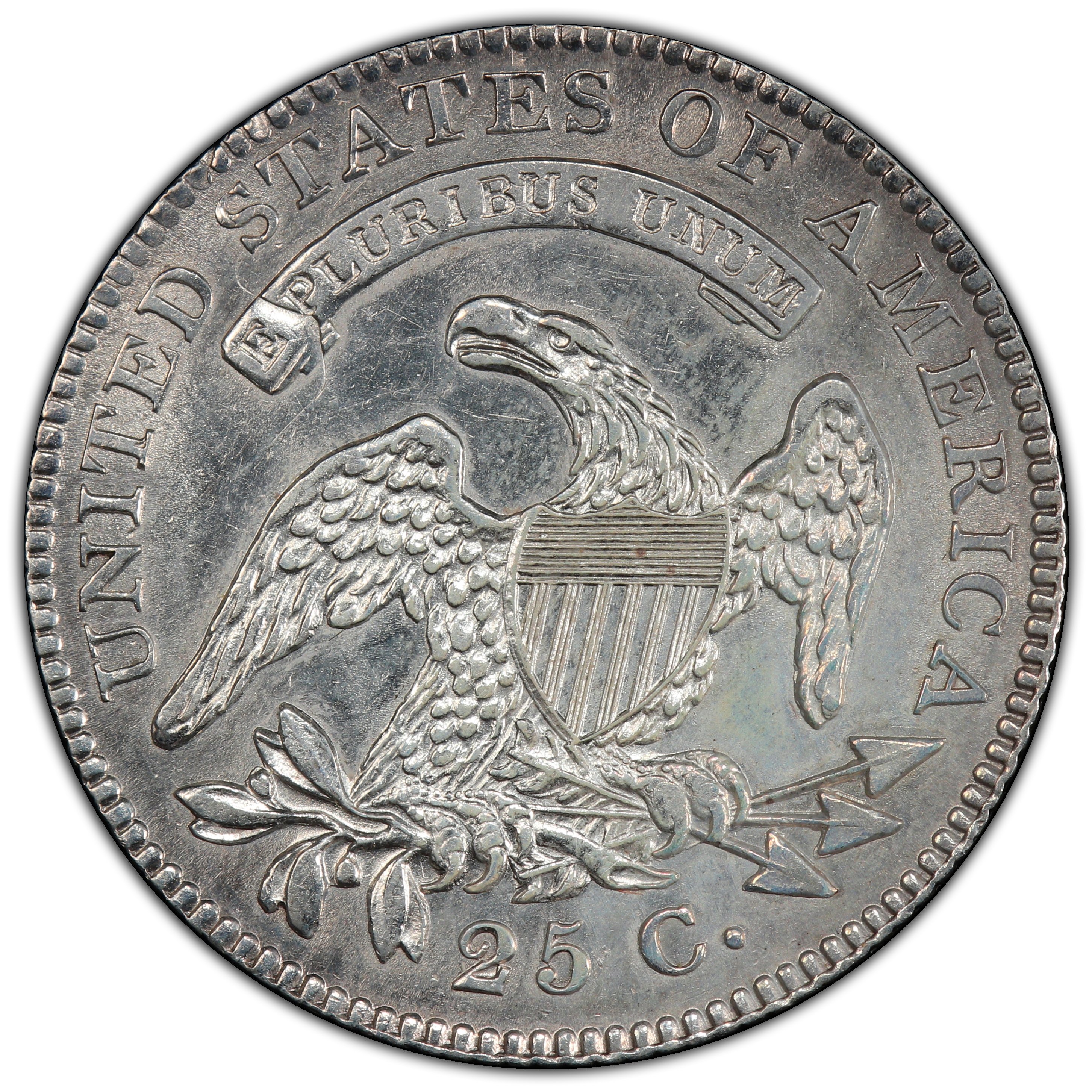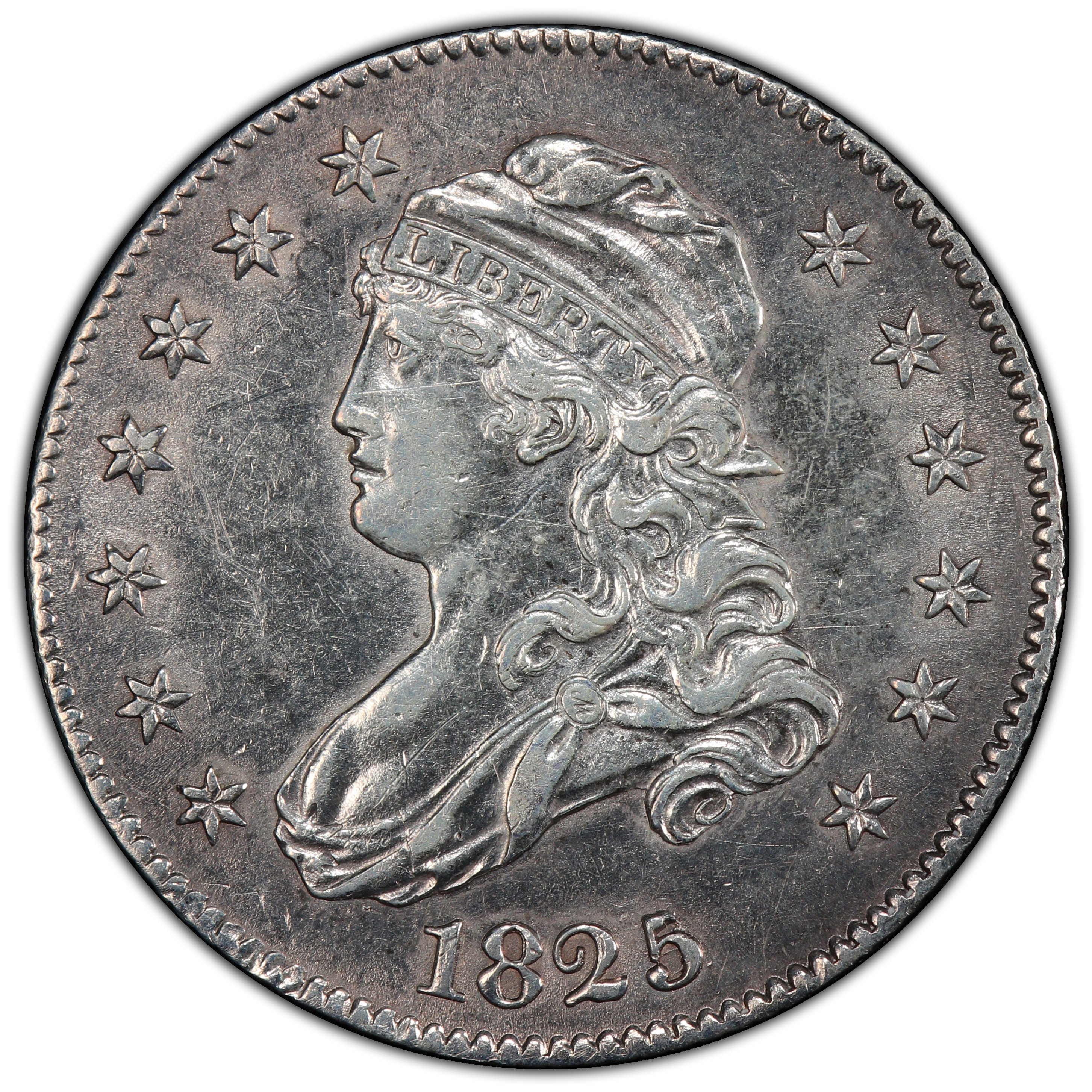 The obverse die for the 1825 B-2 marriage is used for both the 1825 B-2 and B-3.  The reverse die was only used for striking the 1825 B-2 die marriage and is popular among collectors for the die stages of the retained cud that forms around the arrowheads on the reverse. The late die stage is somewhat controversial, hinging on whether you believe there are full cud examples or not. Tompkins notes that things seem to point to the reverse being the anvil die, such that the collar would have held the broken piece of the die in place and not fall out as coins were being struck.