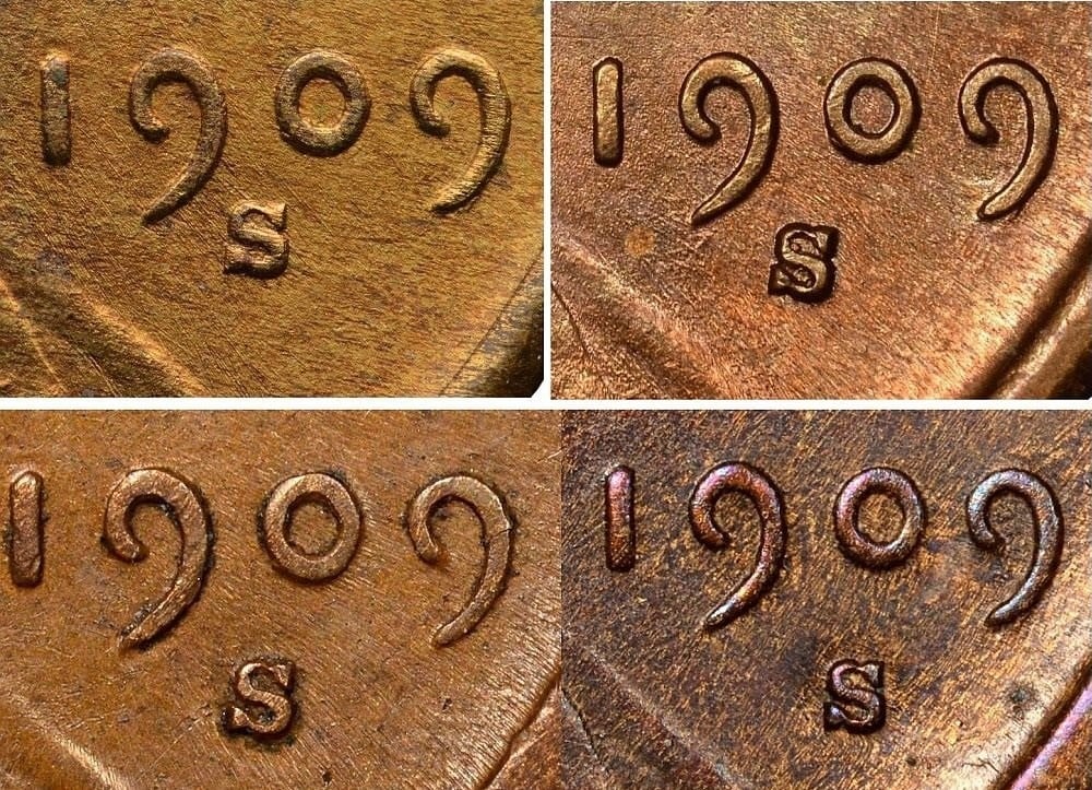Here's a close-up picture of date and 's' mintmark that purports to be of the four known 1909-S V.D.B. obverses. I found this picture several years ago and decided to save it. The image in the upper left corner troubles me. The 's' is showing in an even higher left position than ① as seen in the OP. Would like to hear your thoughts about the image in the upper left corner. lyu6