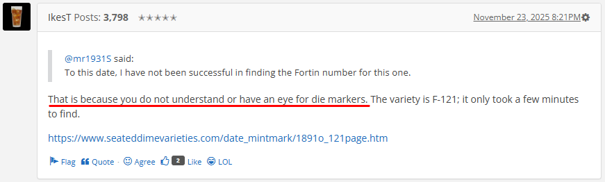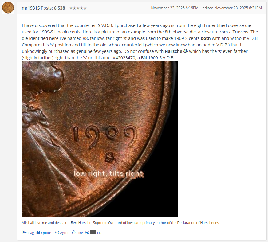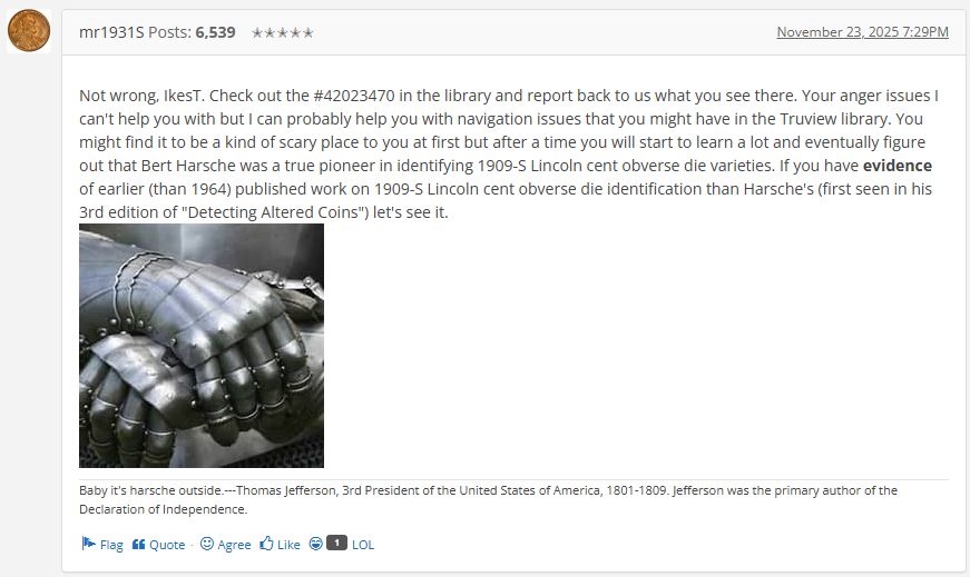 Not wrong, IkesT. Check out the #42023470 in the library and report back to us what you see there. Your anger issues I can't help you with but I can probably help you with navigation issues that you might have in the Truview library. You might find it to be a kind of scary place to you at first but after a time you will start to learn a lot and eventually figure out that Bert Harsche was a true pioneer in identifying 1909-S Lincoln cent obverse die varieties. If you have evidence of earlier (than 1964) published work on 1909-S Lincoln cent obverse die identification than Harsche's (first seen in his 3rd edition of "Detecting Altered Coins") let's see it.