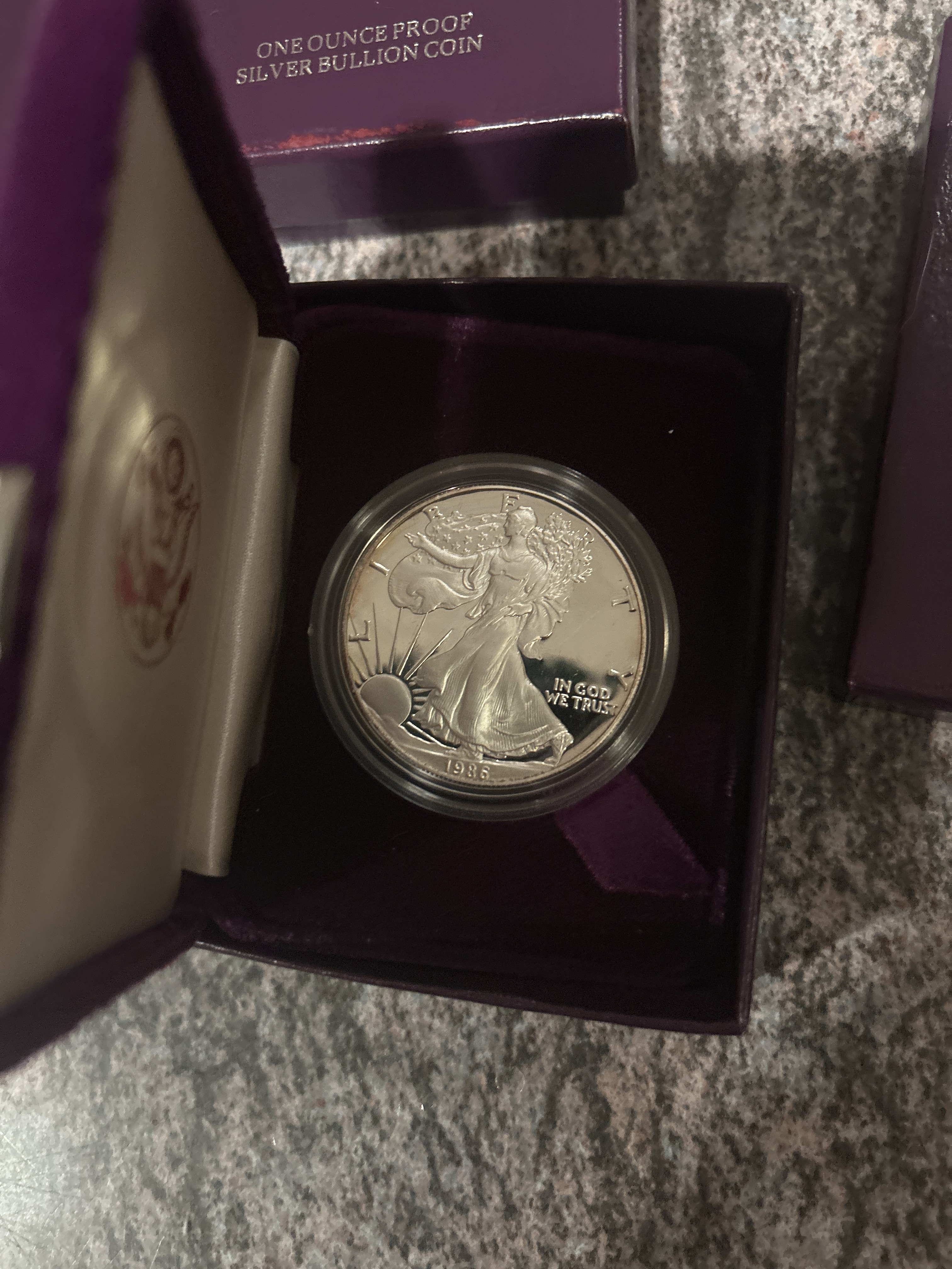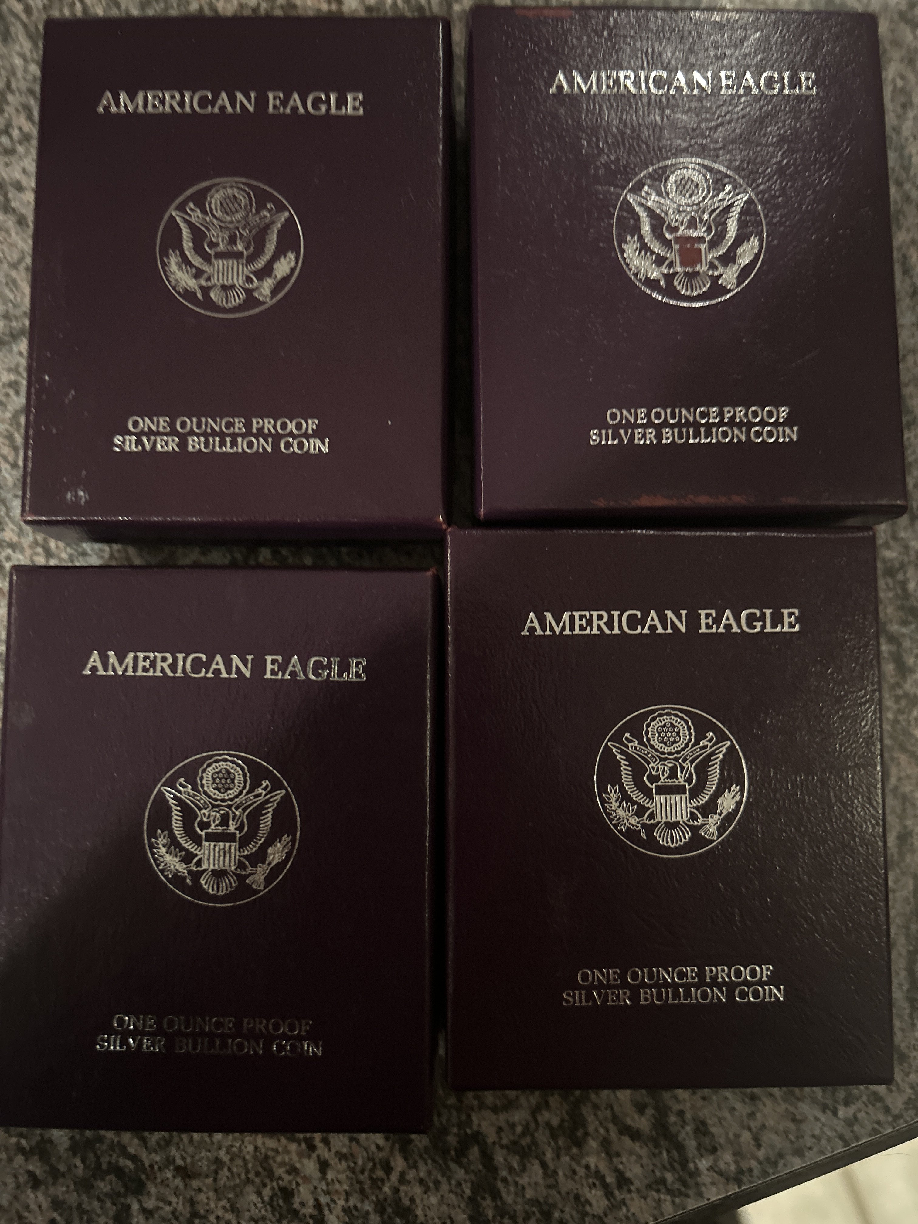 For sale 1986, 1987, 1989, 1990 Proof Silver Eagles in boxes with paperwork. $250 plus shipping. Check or money order