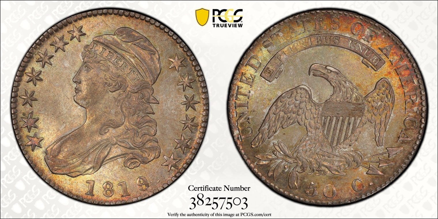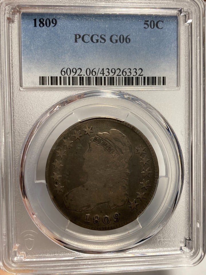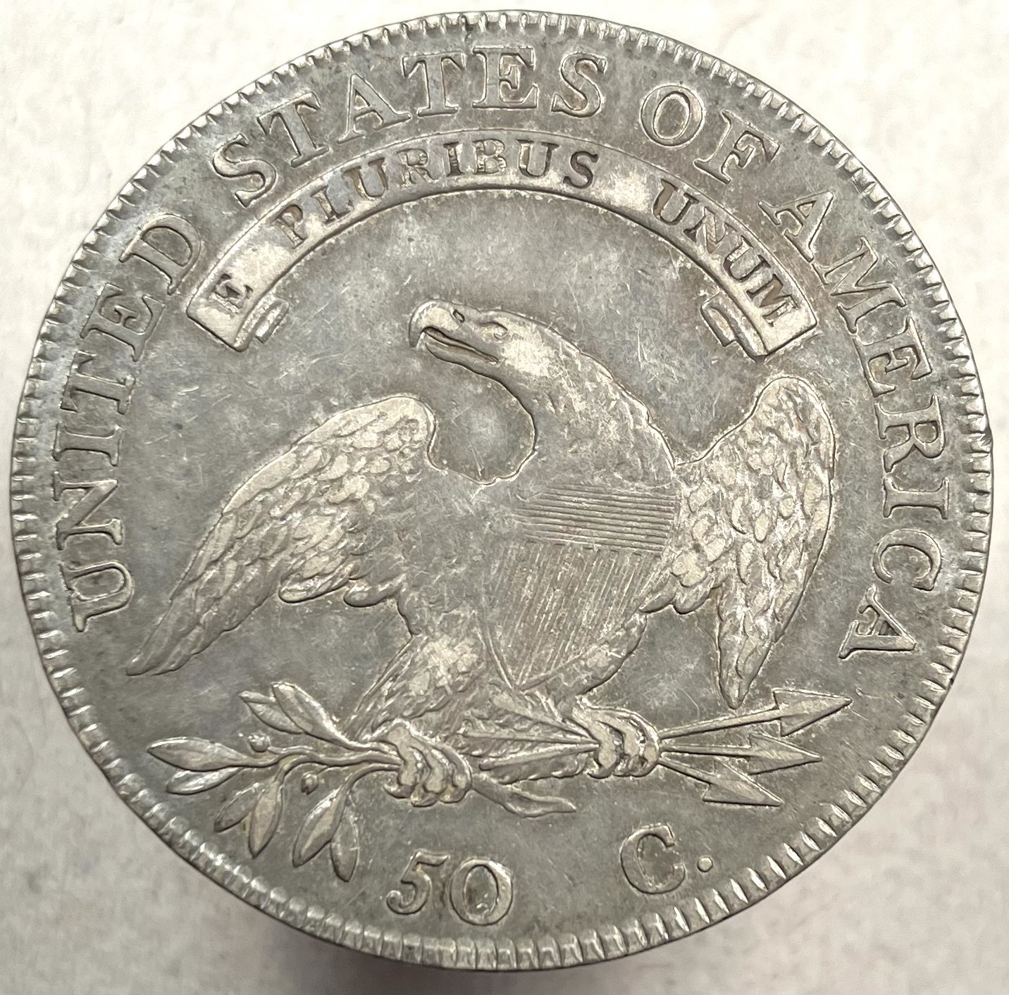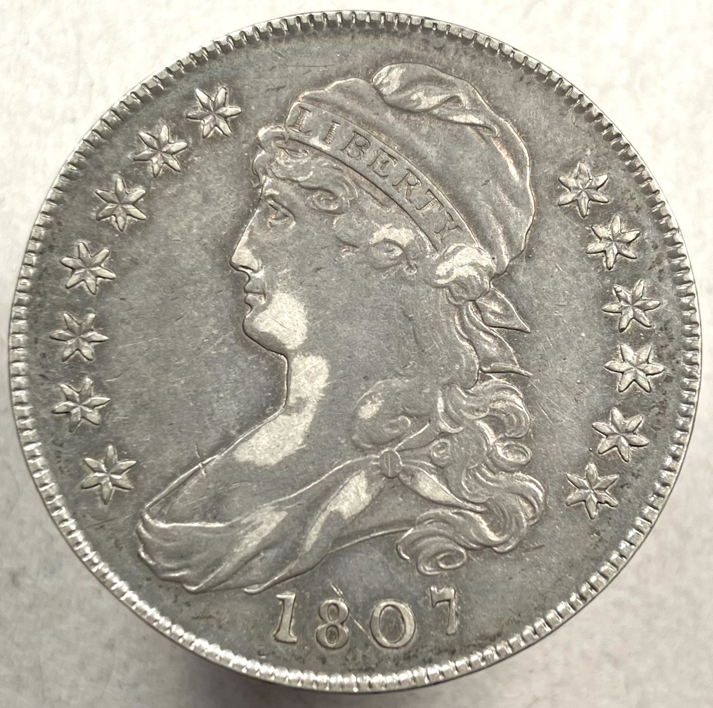 Weak central strike, but typical for this die marriage. Surfaces don’t look too bad, with a couple scratches here and there but nothing distracting IMO. Can’t tell much about the luster from the images, but I’ll say XF40 on a good day. Nice 1807 small stars, nonetheless.