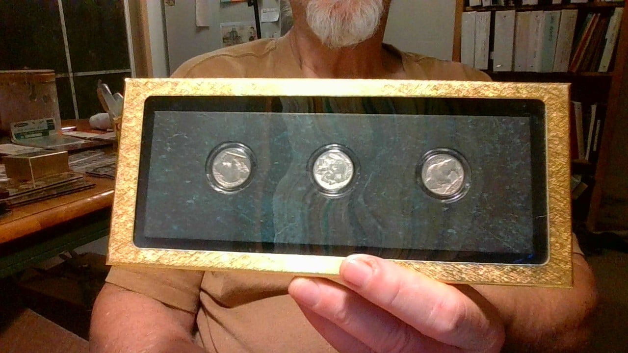Three crappy, cleaned buffalo nickels inlaid in fake marble in a fake gold foil cardboard box.