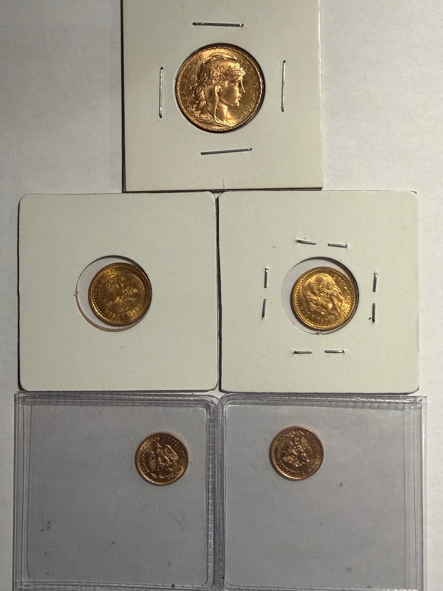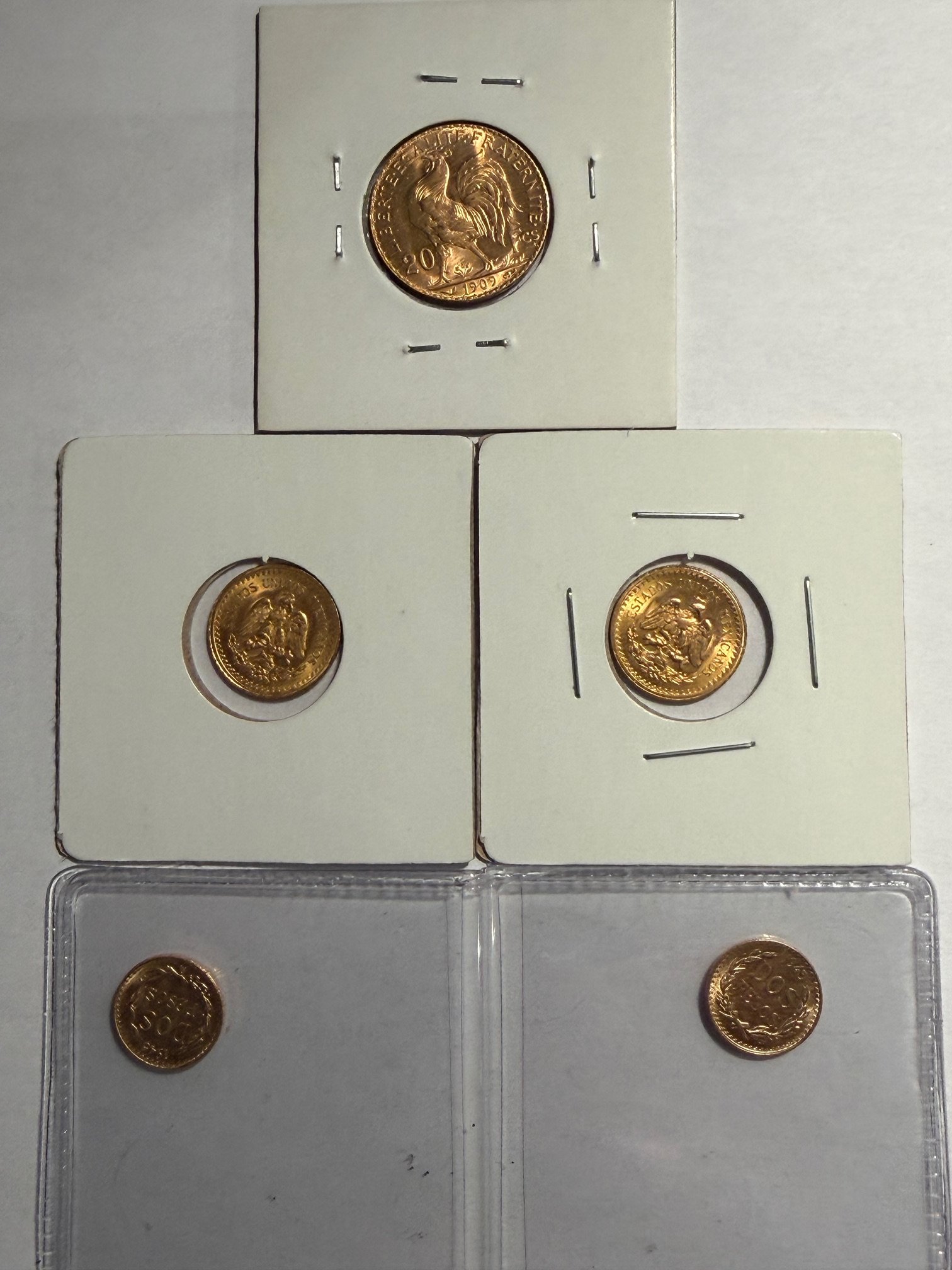 Gold Coin Lot: Two Mexico 2 Pesos + Two Mexico 2 1/2 Pesos + France 20 Francs Rooster: $1,750 postpaid.