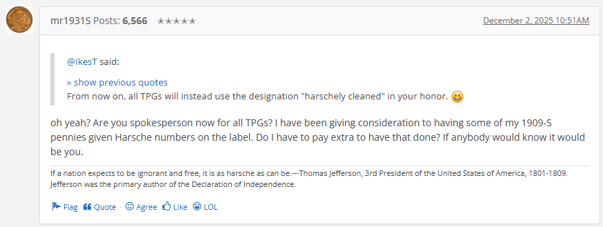 oh yeah? Are you spokesperson now for all TPGs? I have been giving consideration to having some of my 1909-S pennies given Harsche numbers on the label. Do I have to pay extra to have that done? If anybody would know it would be you.