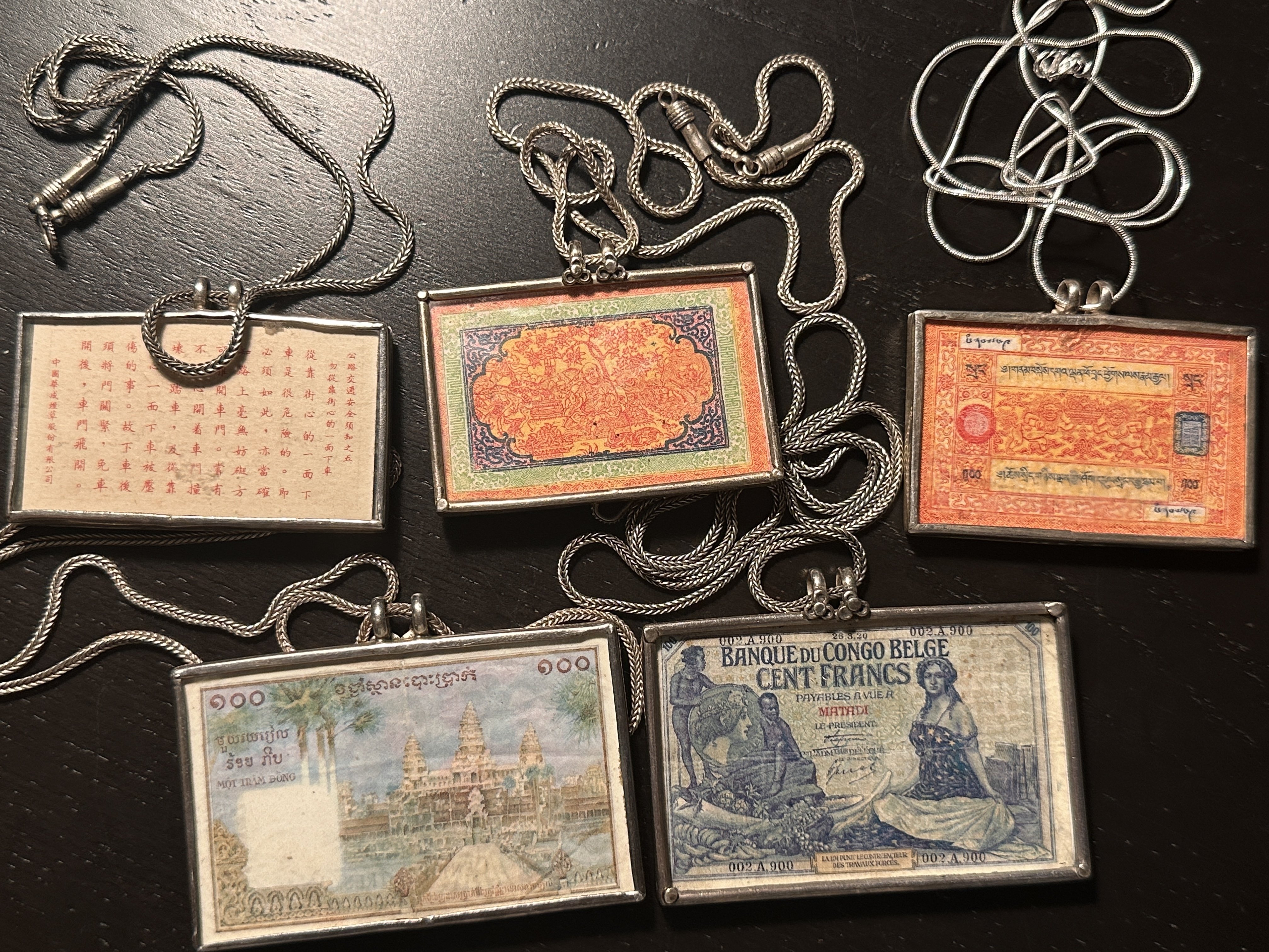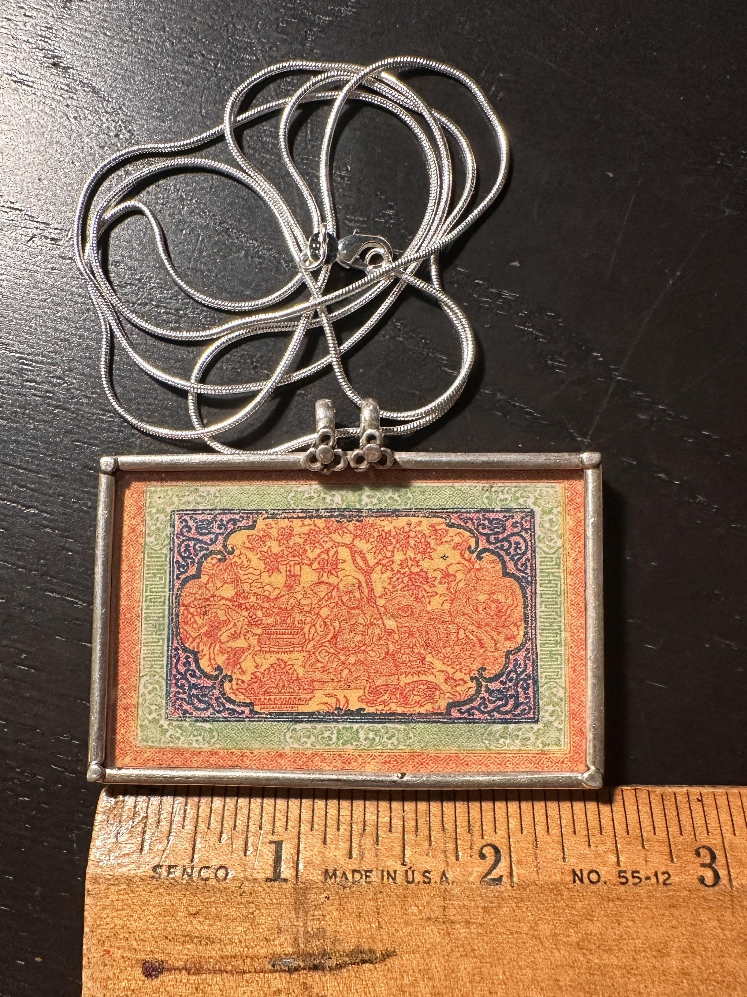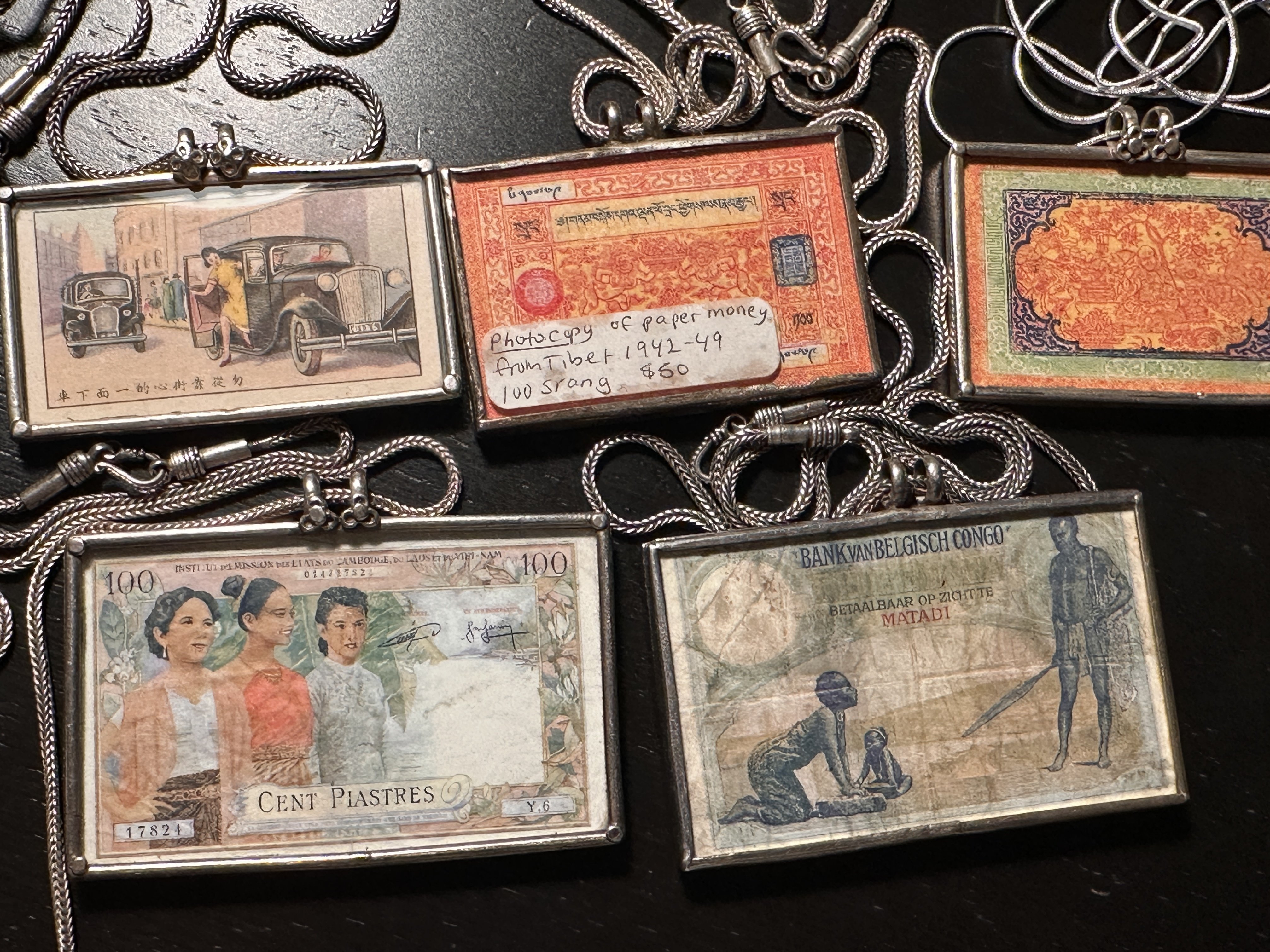 Cleaning out, I came across these 5 vintage necklaces. Each is a facsimile of currency in what I believe is an unmarked sterling silver frame. “Currency” is held between two panes of glass. The chains are .925 silver and marked as such.