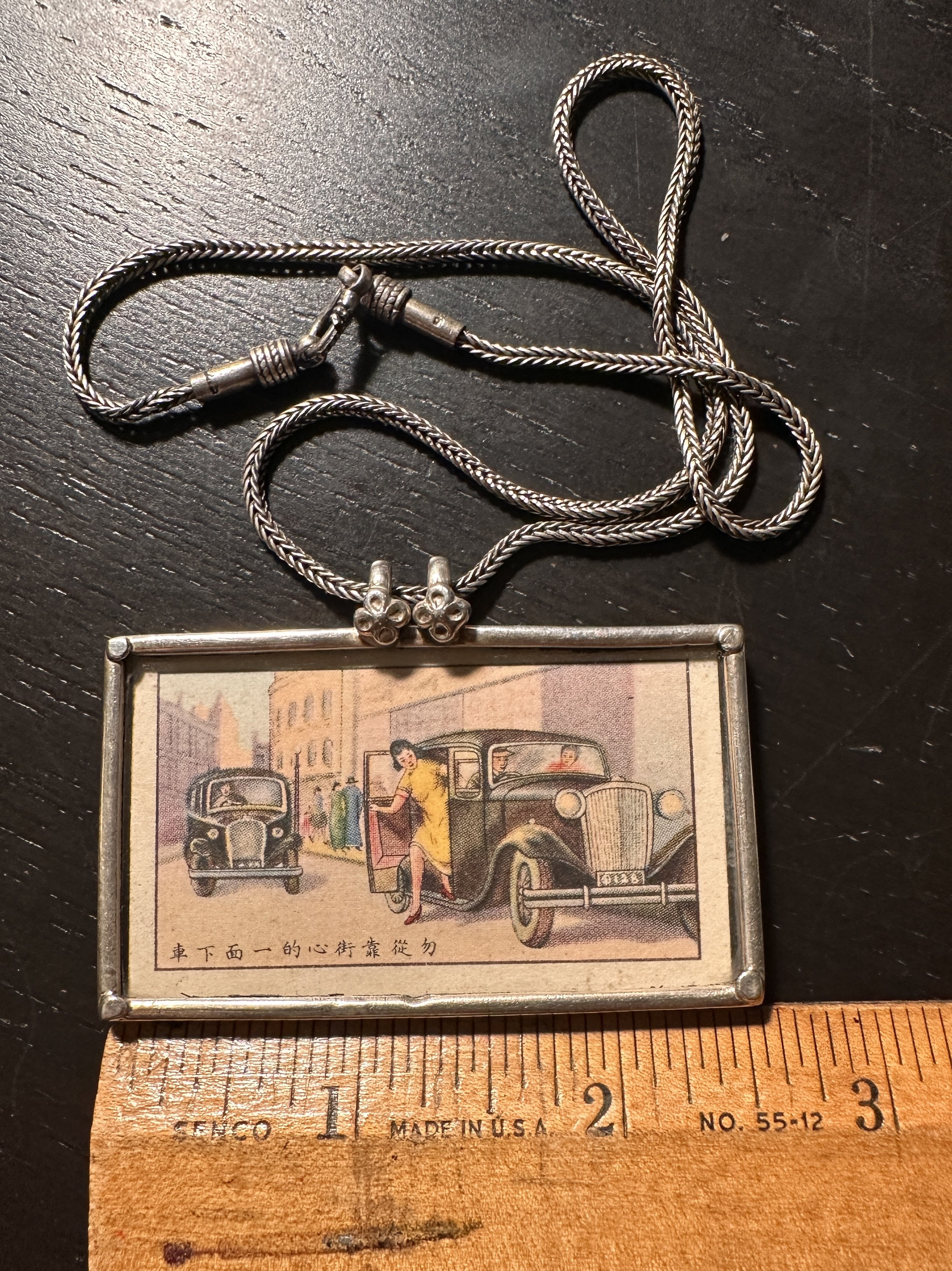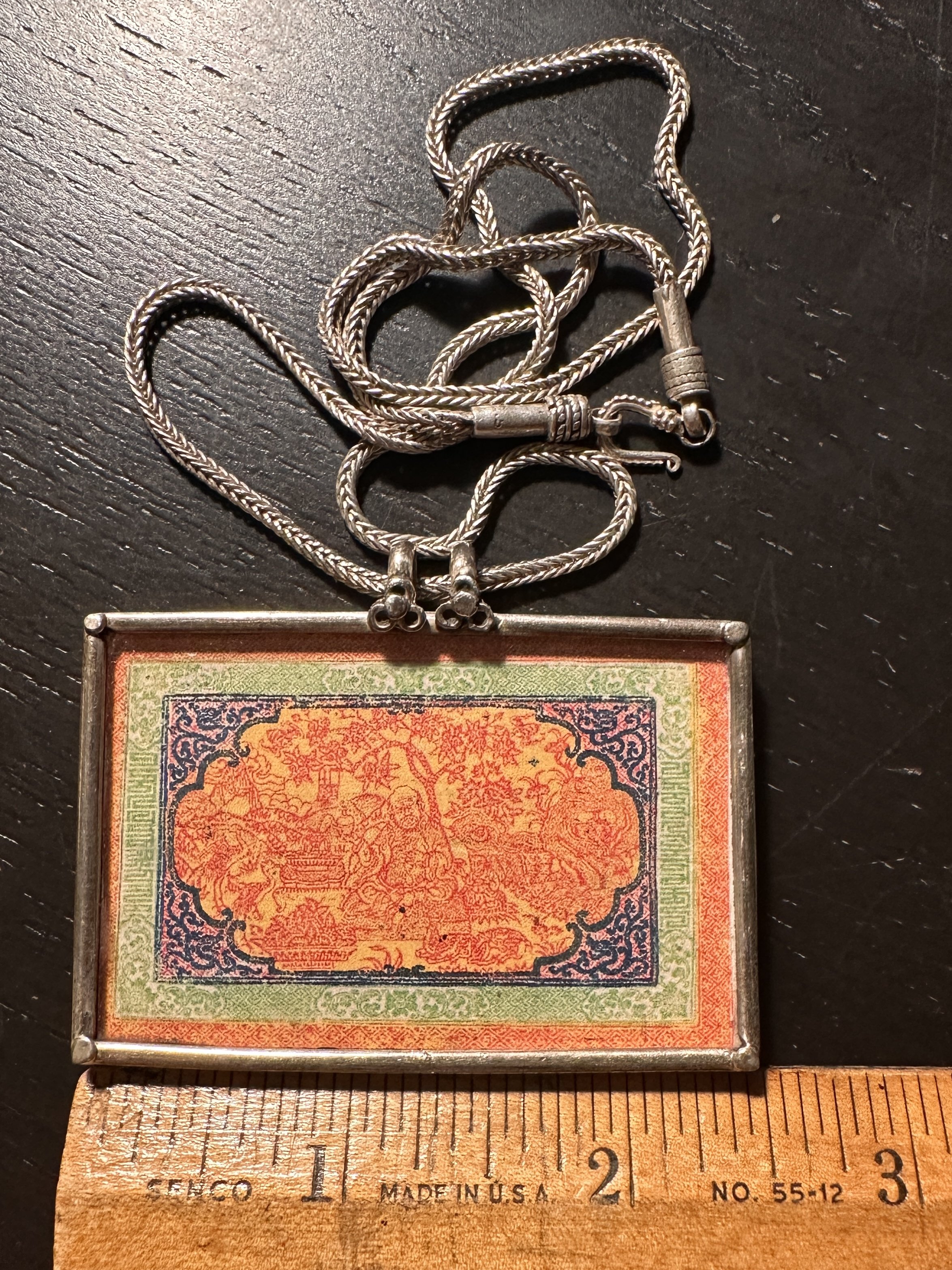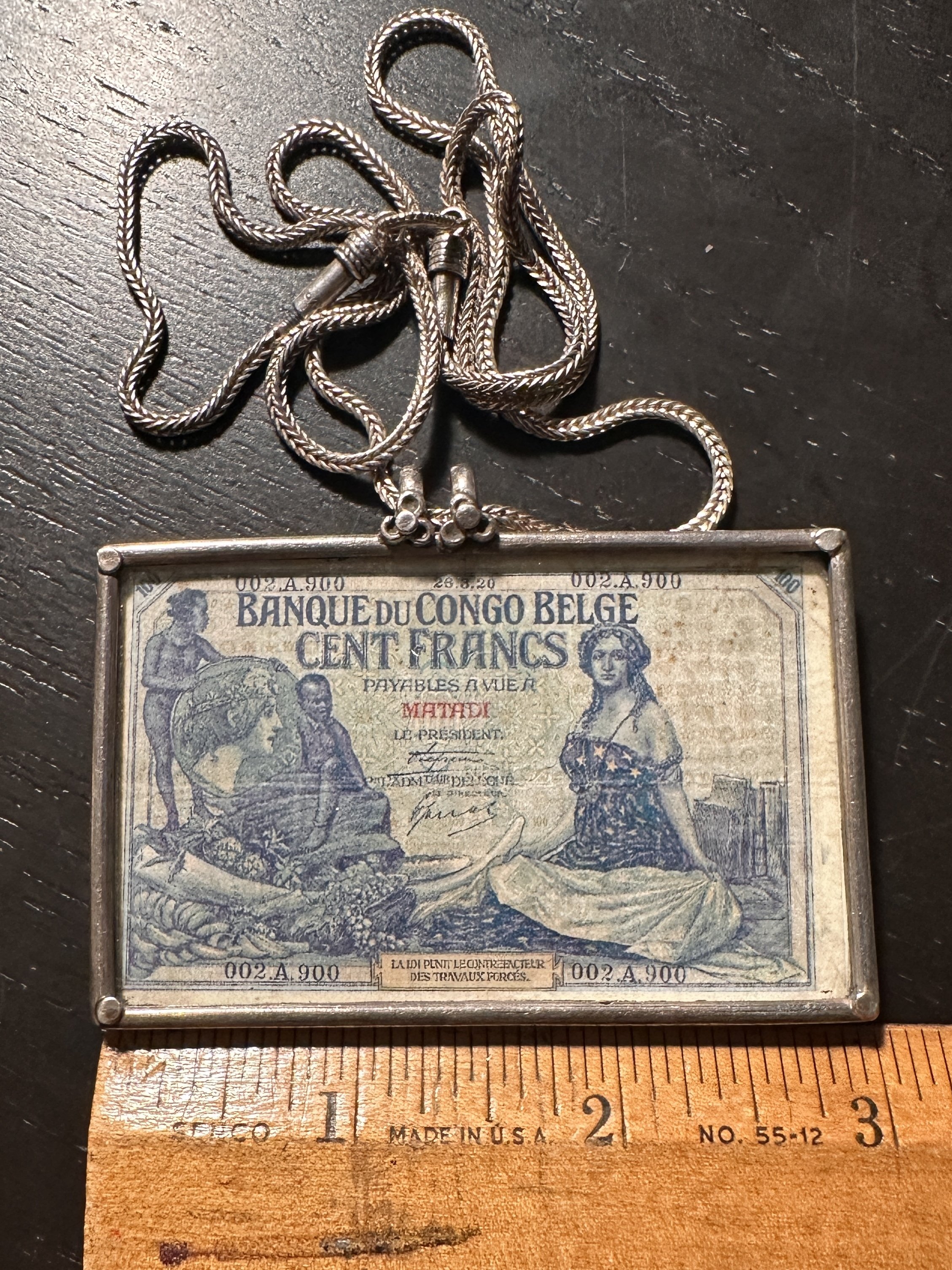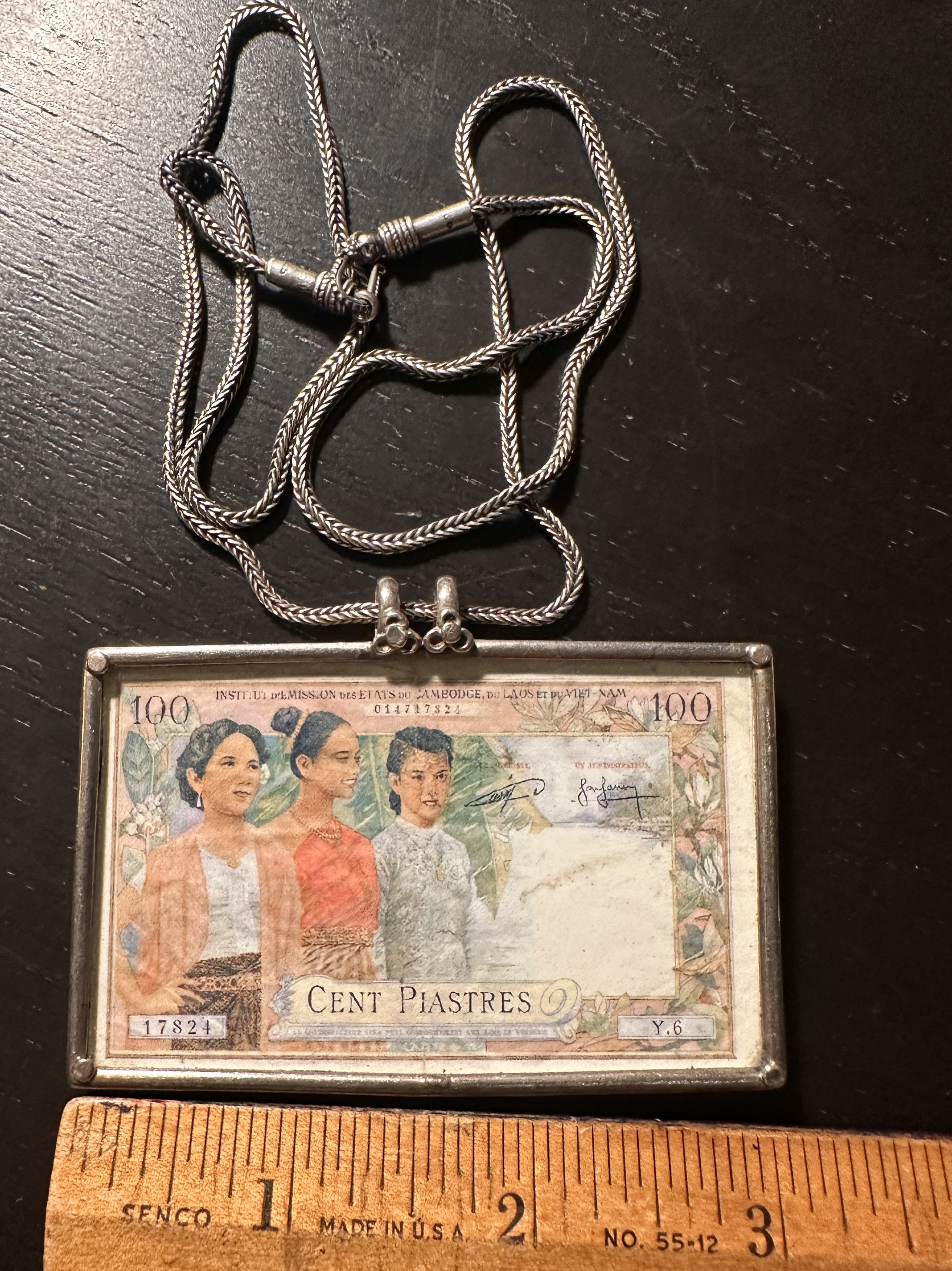Cleaning out, I came across these 5 vintage necklaces. Each is a facsimile of currency in what I believe is an unmarked sterling silver frame. “Currency” is held between two panes of glass. The chains are .925 silver and marked as such.