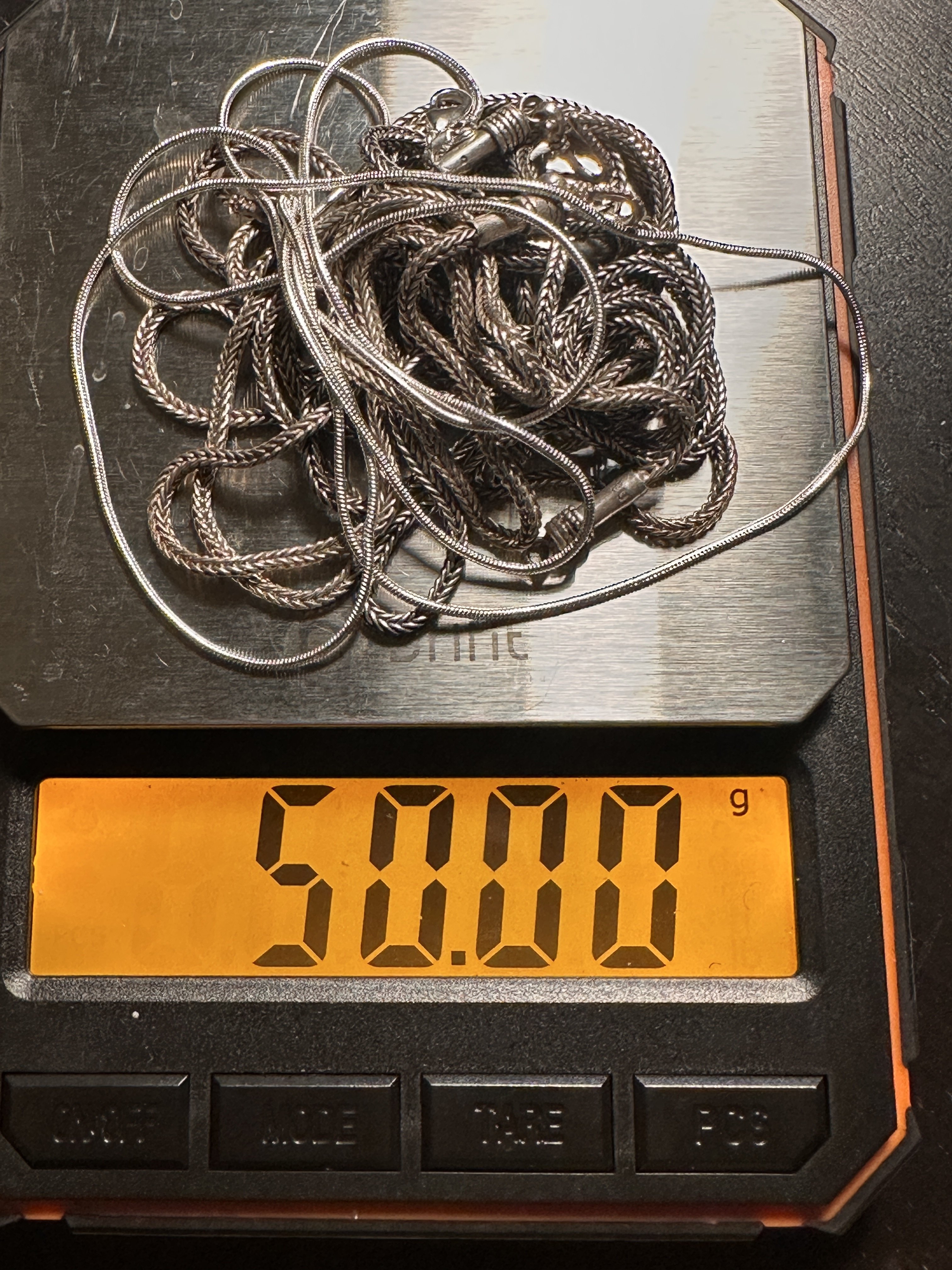 One that is 2.5 inches wide comes on a long silver chain about 27 inches long. 6.4 grams. $28