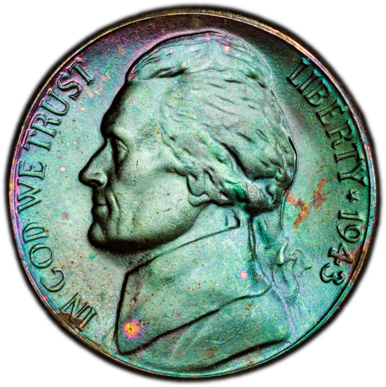 pretty much a solid jade/emerald green toned obverse 1943-s ms65