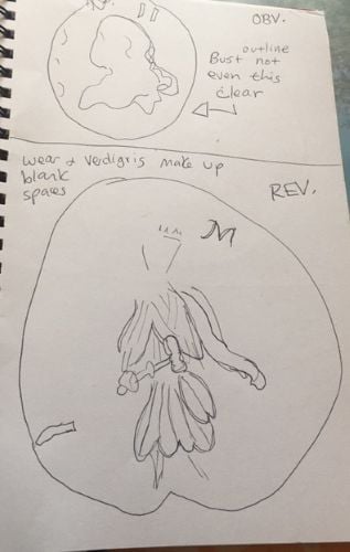 Have had this dug coin (I believe NY area) for about 12 years. Slightly bent, copper, chipped at top (or bottom) and seems to be the diameter and sturdiness of a typical Connecticut copper. Left facing bust is super worn but even the trace of shadow seems to be George II (even has what looks like I I at 1 o clock). But it's the REVERSE that is driving me crazy. Appears to be a standing figure, cloaked in robe or Native American garb, Appears to have one arm outstretched, somewhat downward. Right crooked and holding a hatchet at about waist level. I know of NO other US Colonial/Federal coin OR Indian Peace medal with such a design-- though several kinda dance around this design. You can't really see the head of this figure, but there might be some kind of triangular shape where the head would be. ANYWAY.... anybody ever see a design like this. I have provided a drawing to show what I see as the surface of coin itself is dark, bumpy, not easy to photograph (though I do have a picture).