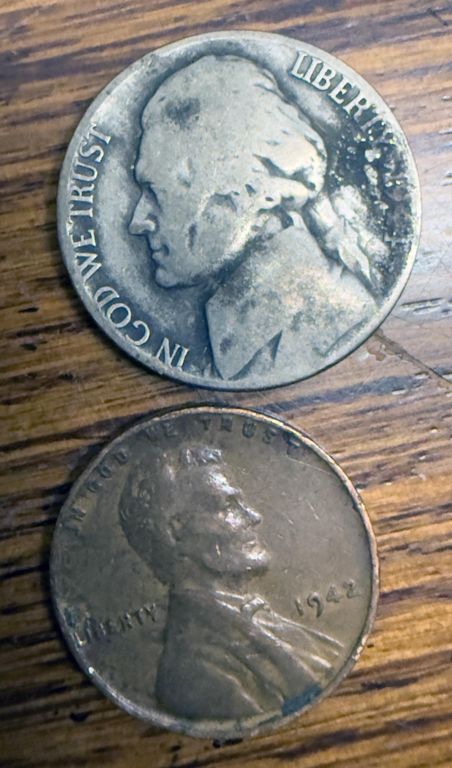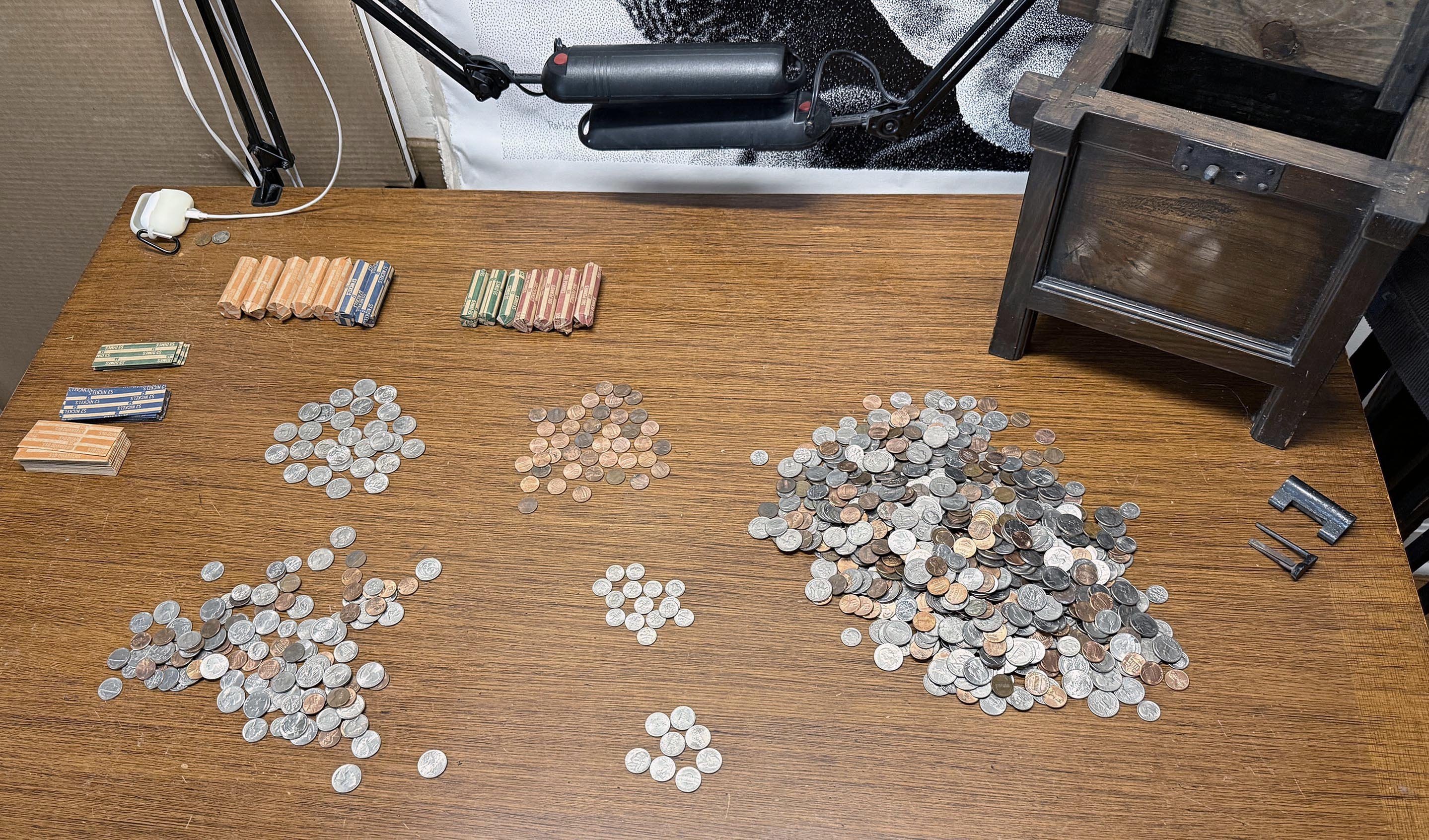Every five years or so, my wife and I empty our coin box, roll them up, and then swap them for currency at our bank, splitting the proceeds. This year's haul totaled $189.50, plus a '42-P wheat cent and a '44-P silver nickel, both of which I gave to the bank's teller explaining their significance.