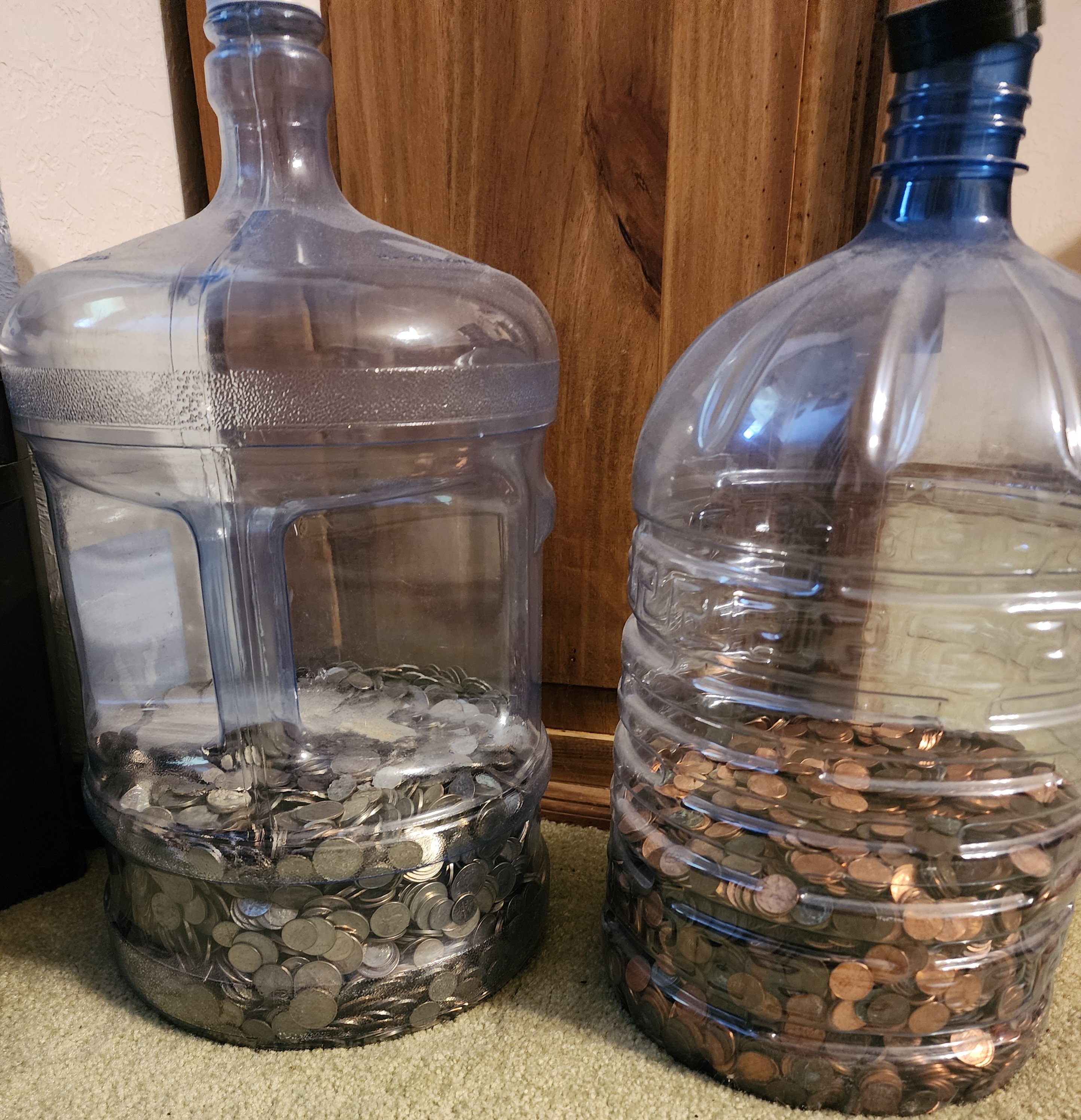 Always lift those glass jugs full of change from the bottom! I had about $400 in loose change in one, picked it up by the ring handle on top, the bottom then sheared cleanly off on a seam from the weight and dropped out, had shattered glass and change everywhere… ugh, lucky it didn’t break my foot!