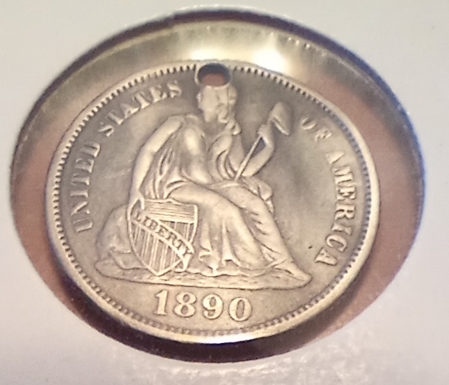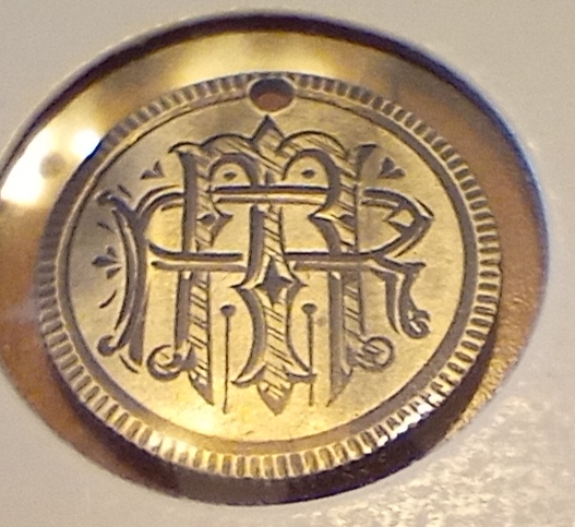 SOLD 1890 10c Love Token. Slightly bent but barely noticeable. Initials "MR"; ""RM". $12.00