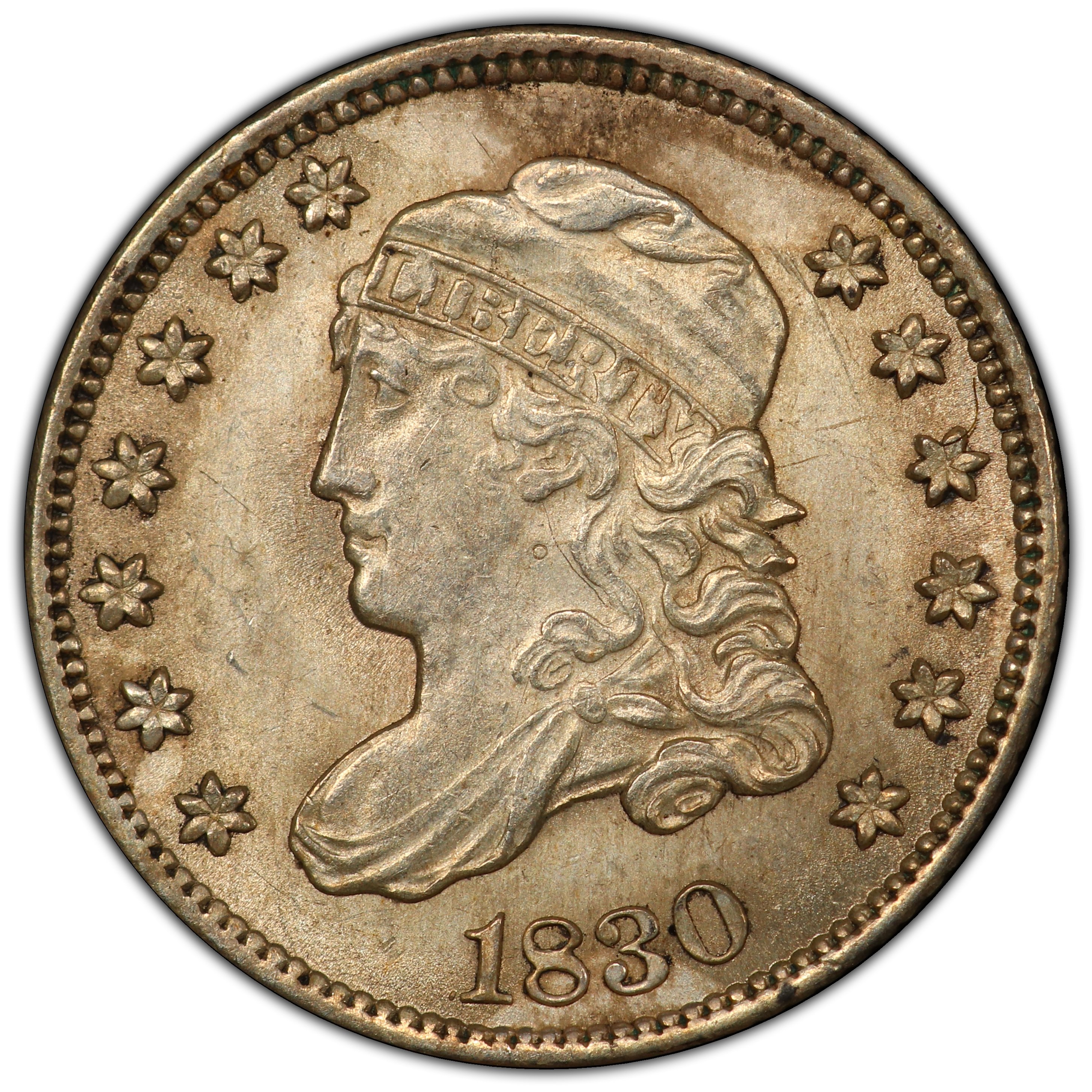 1830 Obverse #3 in the Capped Bust half dimes has what authors Logan and McCloskey call a "prominent center dot" (in an obverse they primarily describe as "dotted date" due to the little dot right before the serif of the 1 in 1830). That obverse was used in die marriages LM-6 (image below, from PCGS but not my coin) and LM-8.