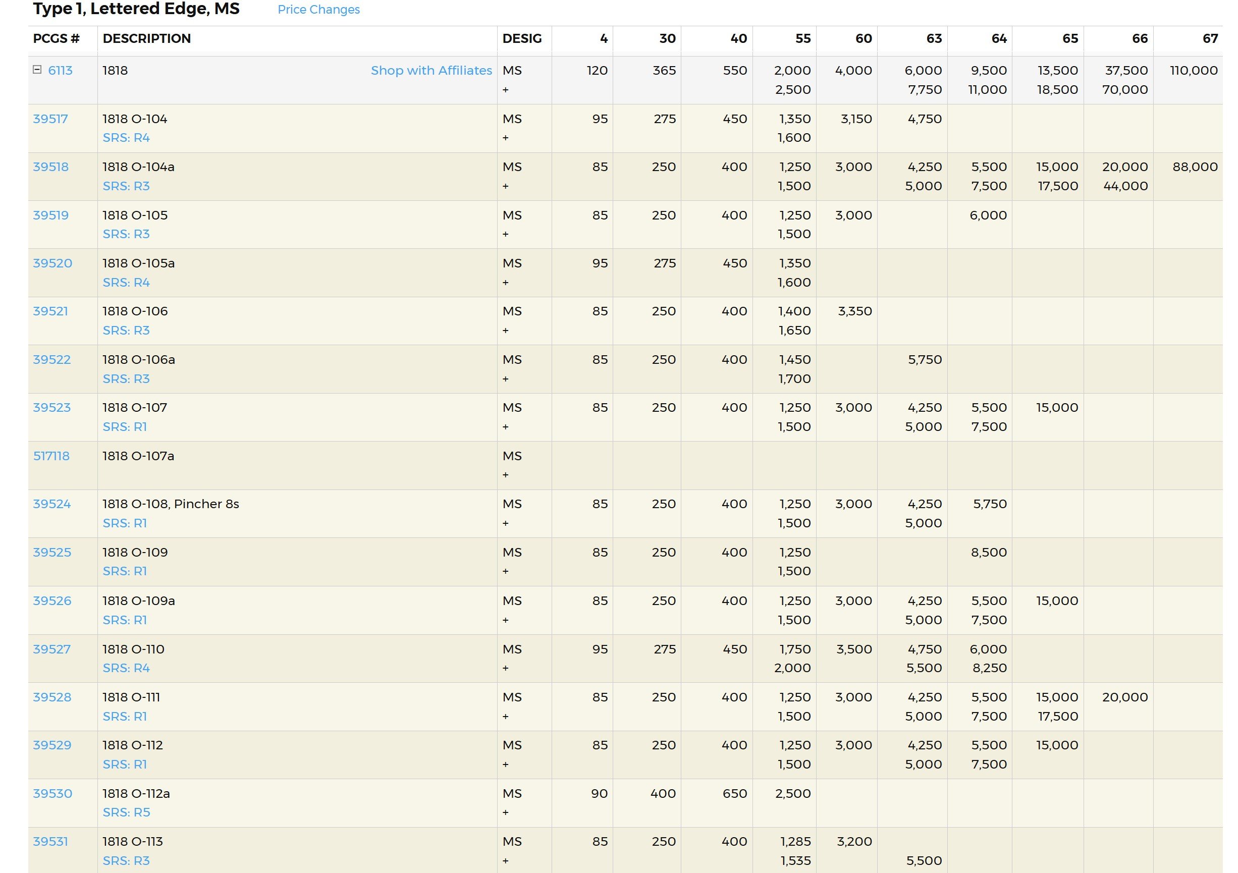As an example (see below), the "Base Price" shows the 1818 as $550. (EF40) / $2000. (AU55) / $4000. (MS60) coin, but in almost every case, if the coin is in an attributed holder (showing the Overton #), the coin will show up priced for less (typically $400/1250/3000).