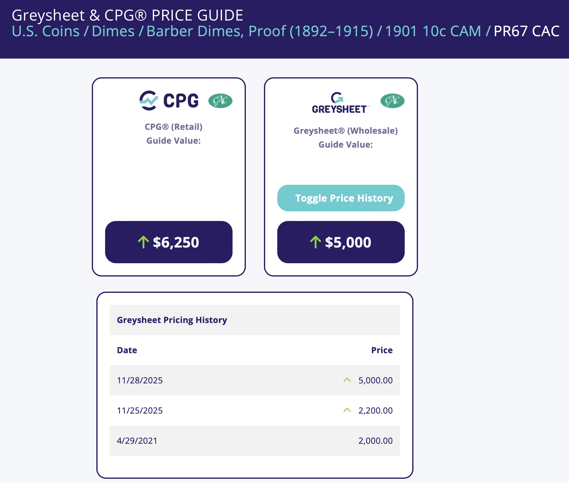On the CDN webpage and app I now (11/28/2025) see a greysheet of $5000. (wholesale) or $6250. (retail).