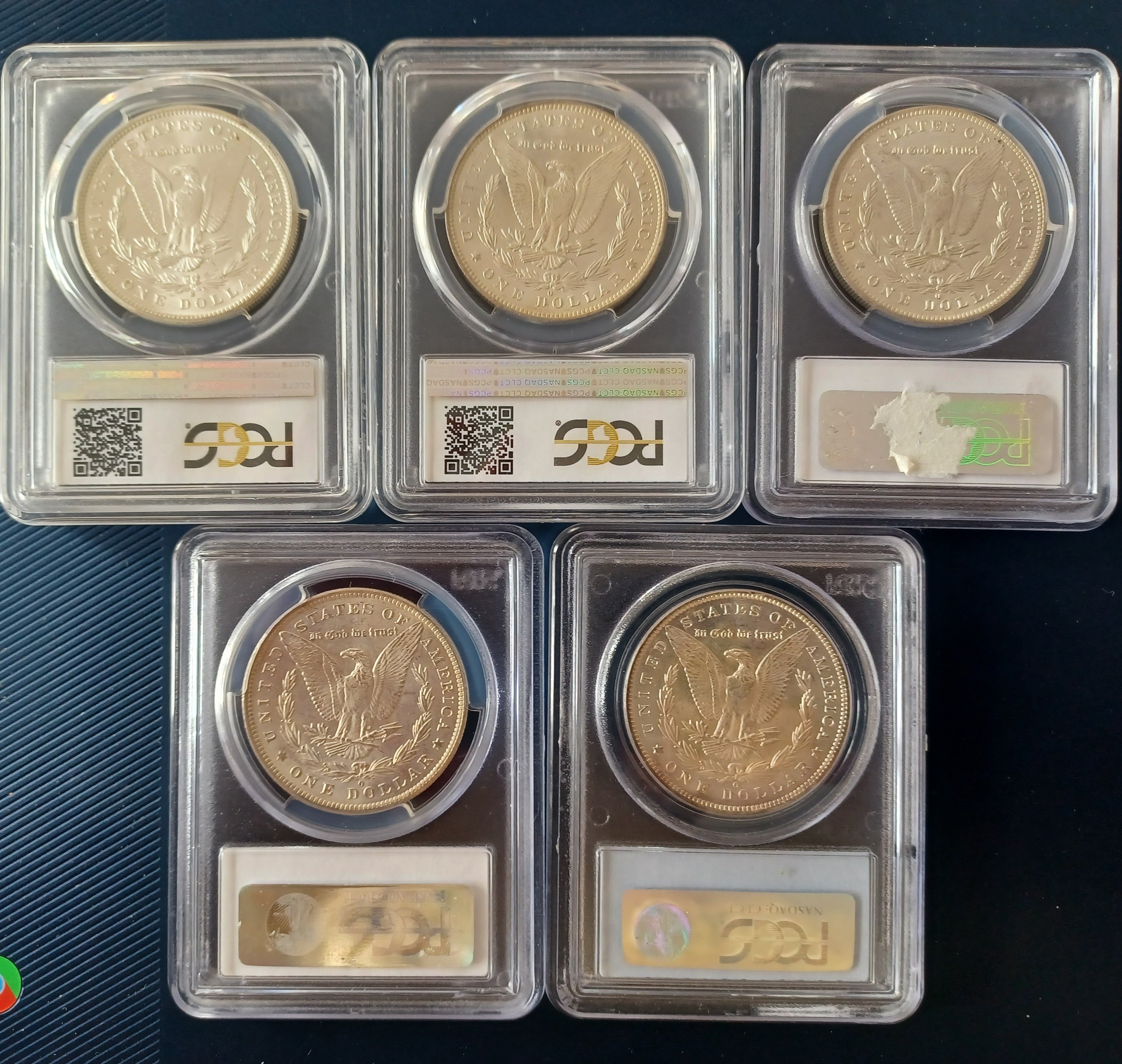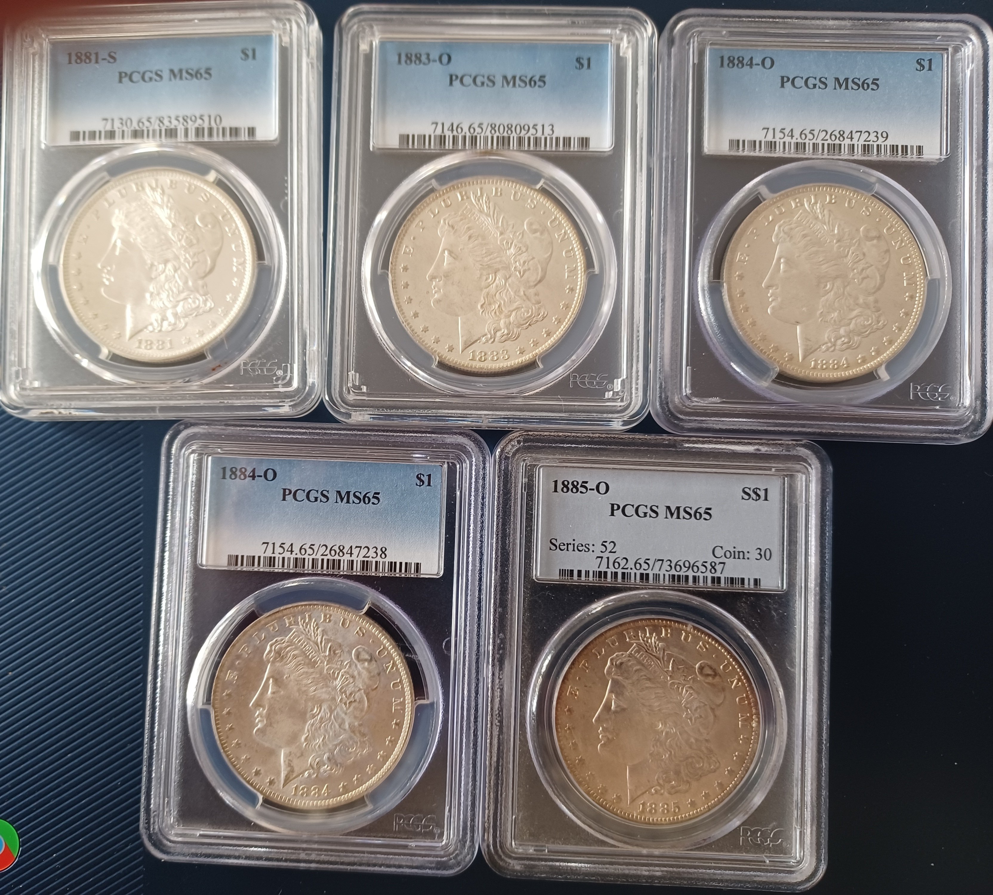 Five MS65 Morgans as imaged. Sell for $640. net ppd. SOLD