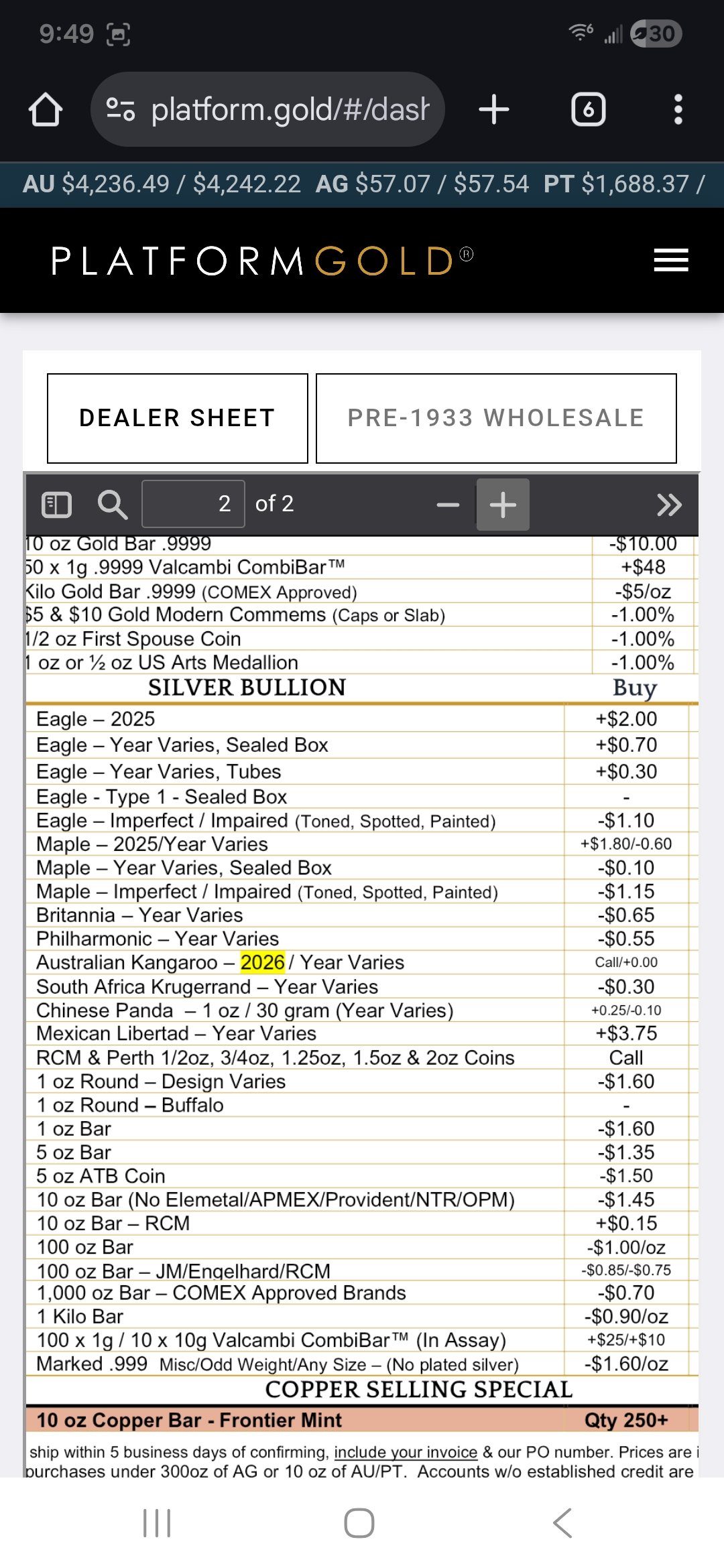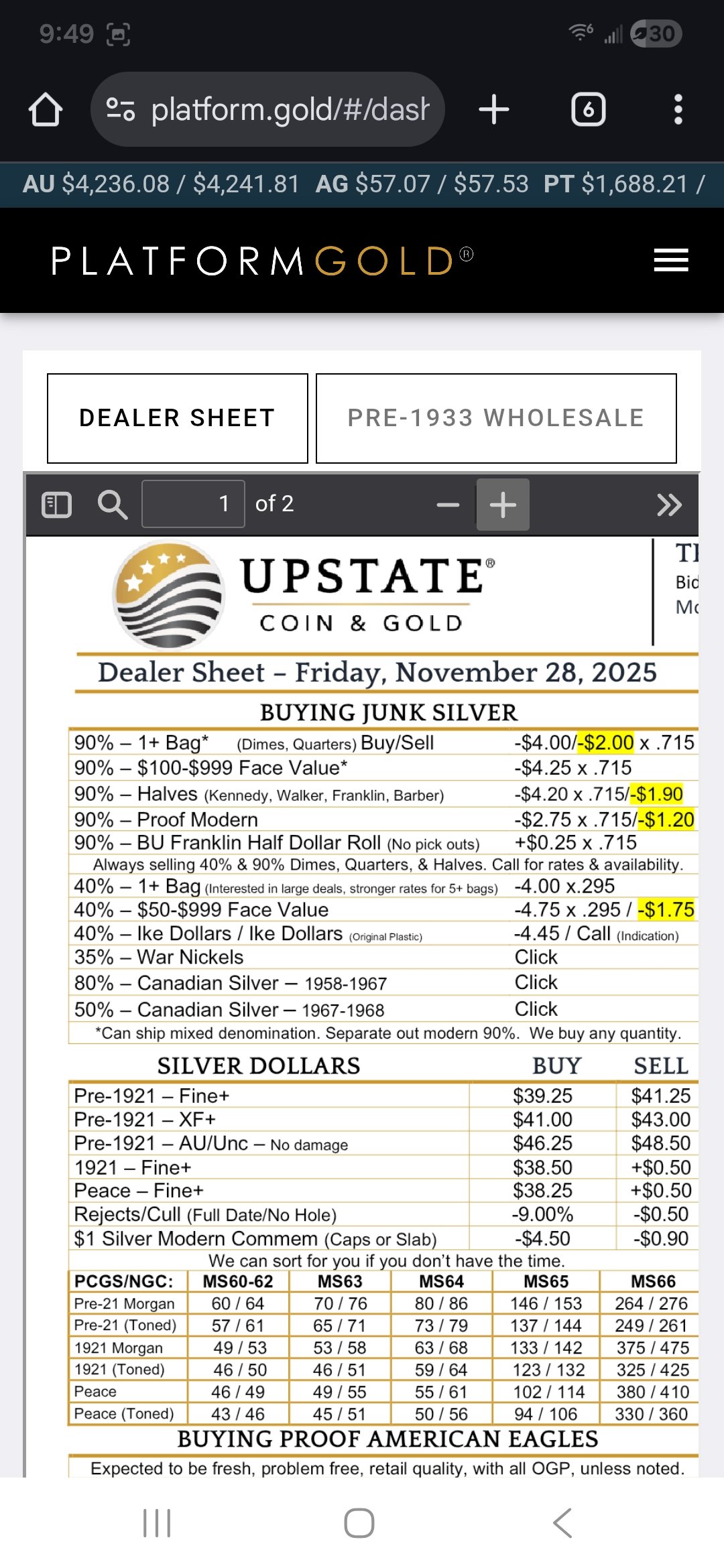 Paper price is $56 but dealers are only offering $45-50 in the physical world. Stuff like 90% and less the refiners don't even want it. RGDS!
