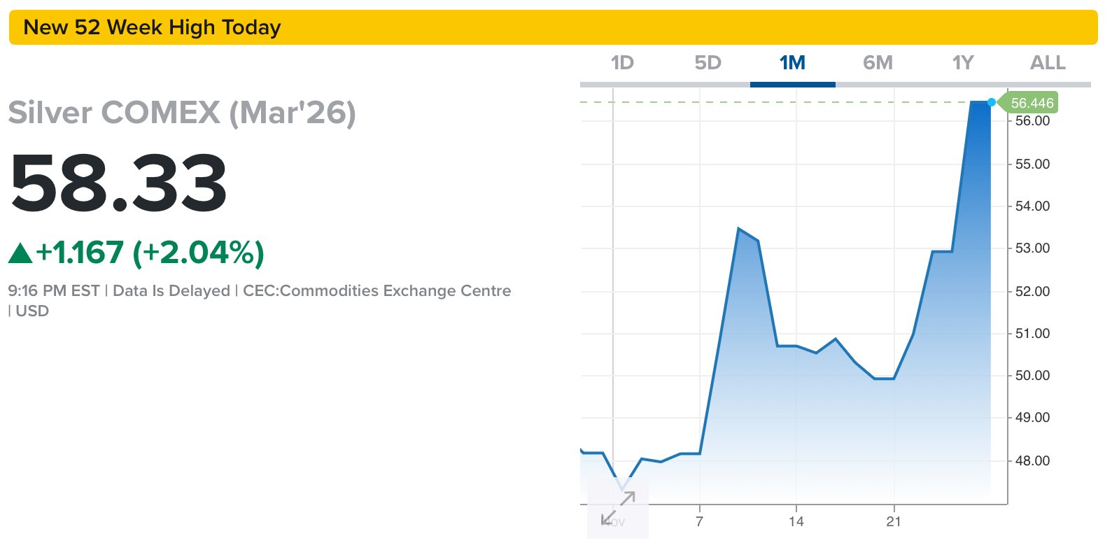 According to my interweb, right now, as I post this on Sunday morning, closing futures on Friday were $57.03. Spot, according to Apmex, right now, is $55.33 Bid, $56.67 Ask.