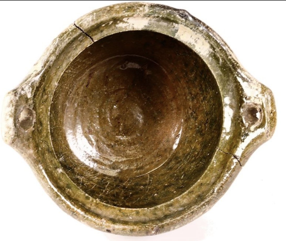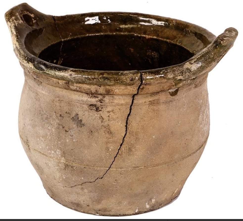 Large, green-glazed stoneware hanging pot with small handles in rim, ex-pirate ship Golden Fleece (1686). 1024 grams. 6½" in diameter at top, 5" tall . Thick-walled, flat-bottomed piece with round-holed handles on either side of top, unglazed on the outside, dark green glaze on the inside, some wormy encrustation, intact but with two large vertical cracks. From the pirate ship Golden Fleece (1686), with original certificate from Captain Tracy Bowden through his contract with the Dominican Republic