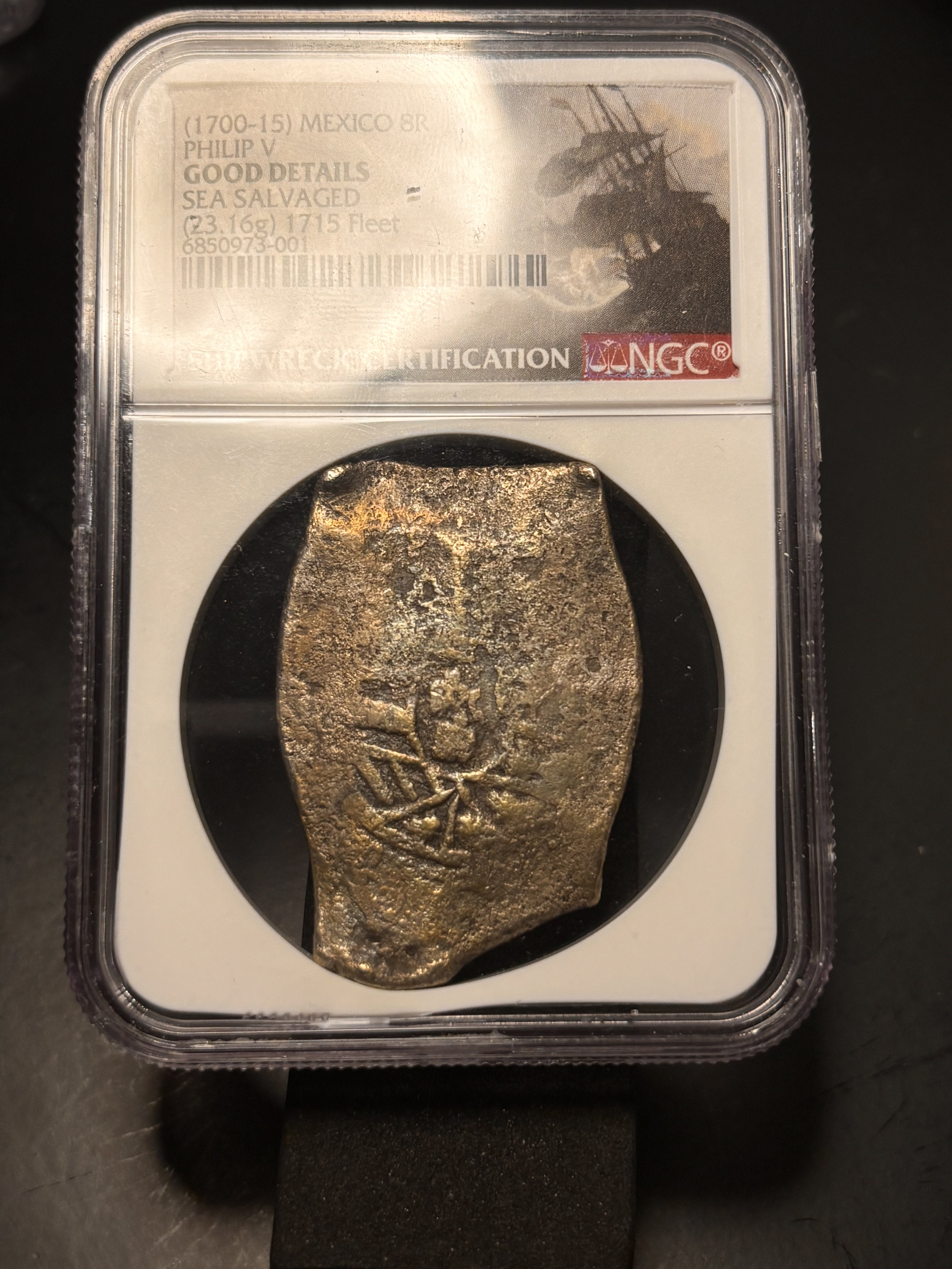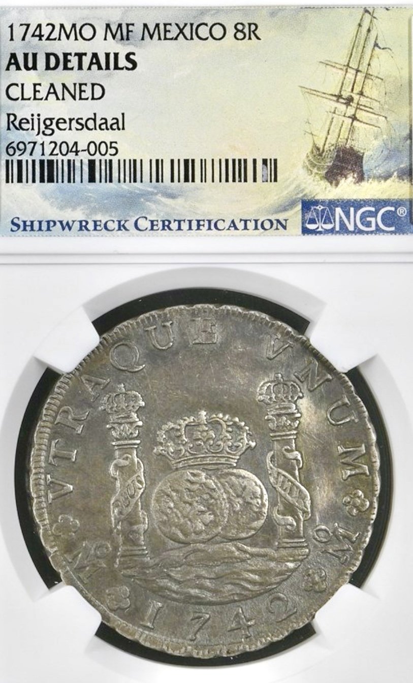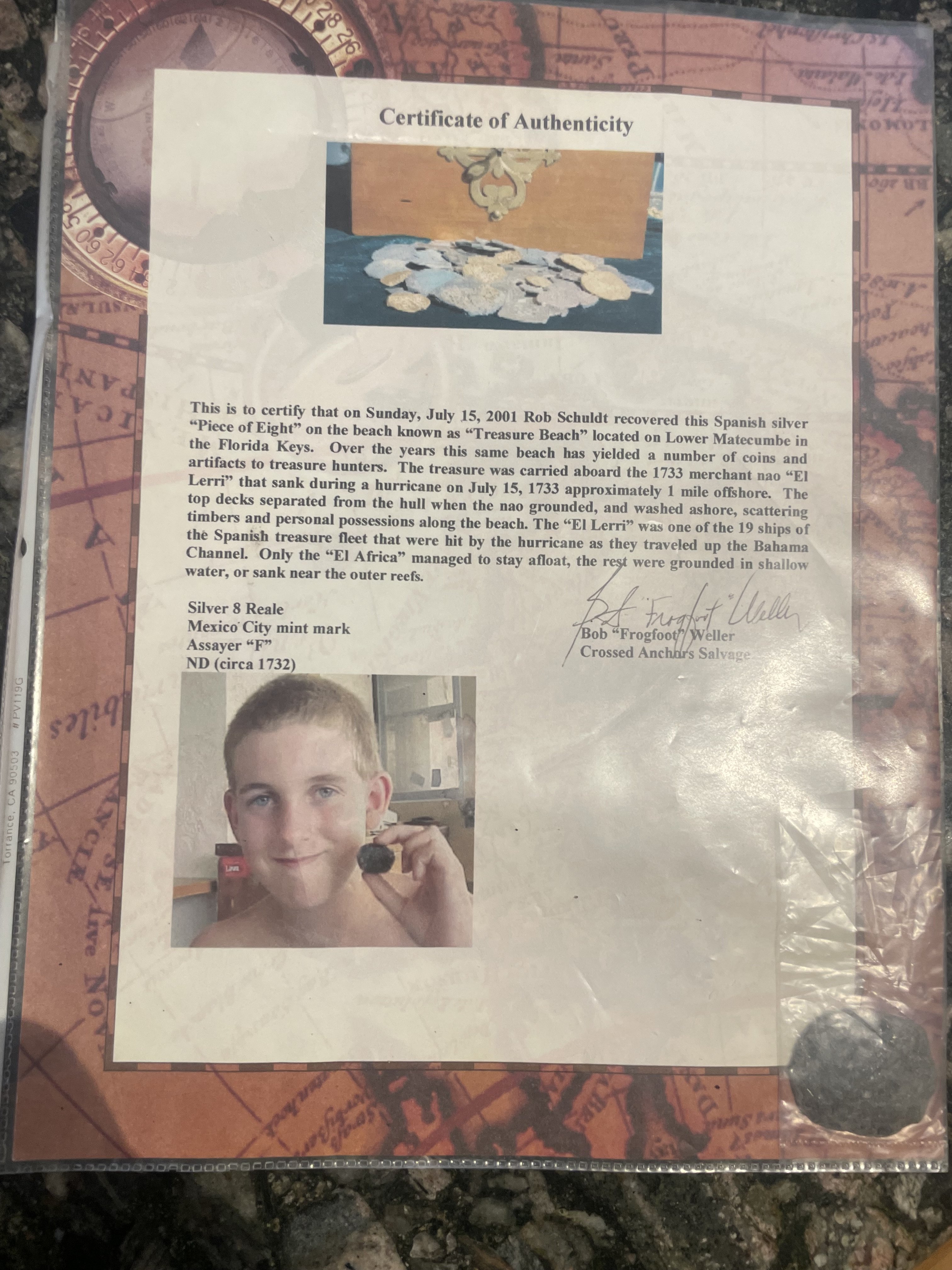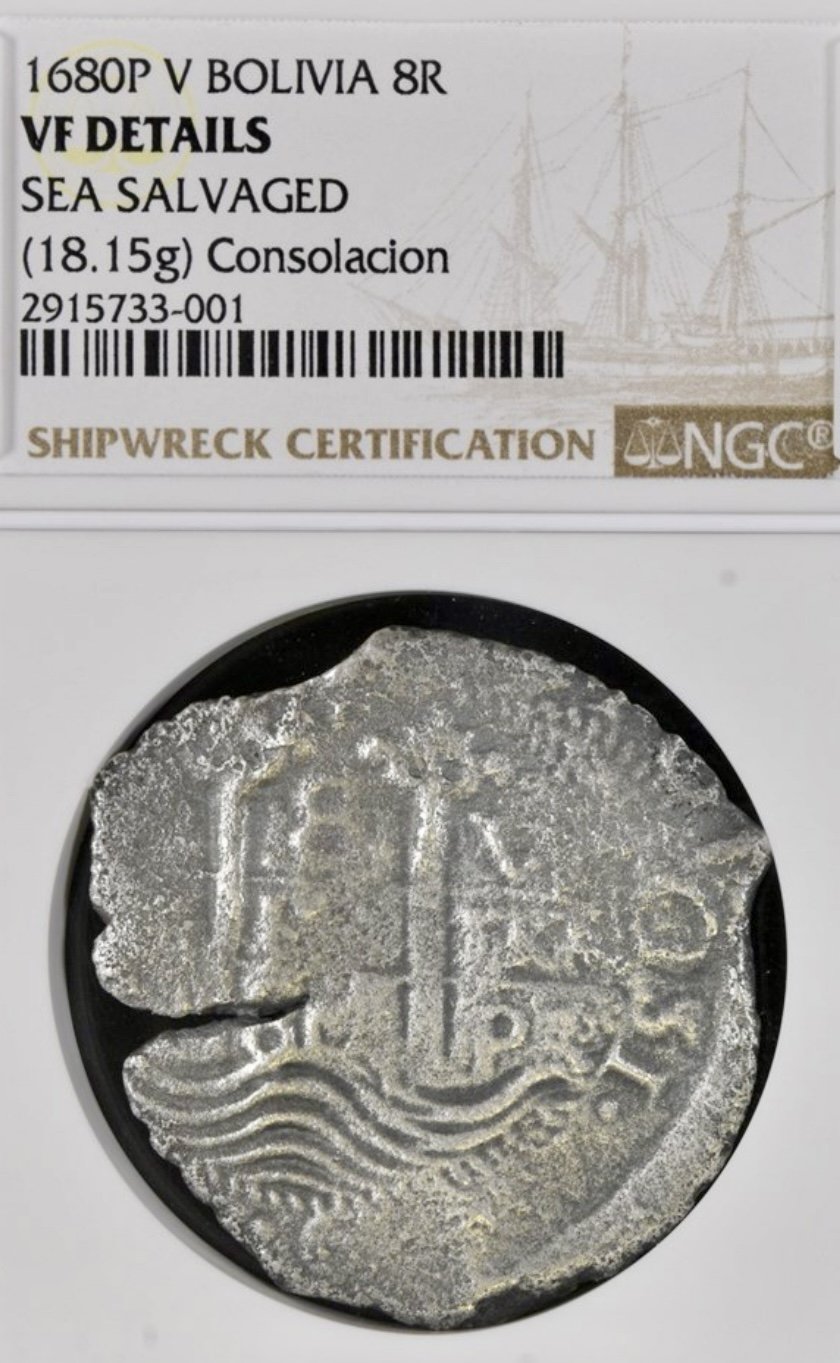 My son’s first treasure find from the 1733 fleet disaster off Florida. Very few “El Lerri” coins with certs exist.
