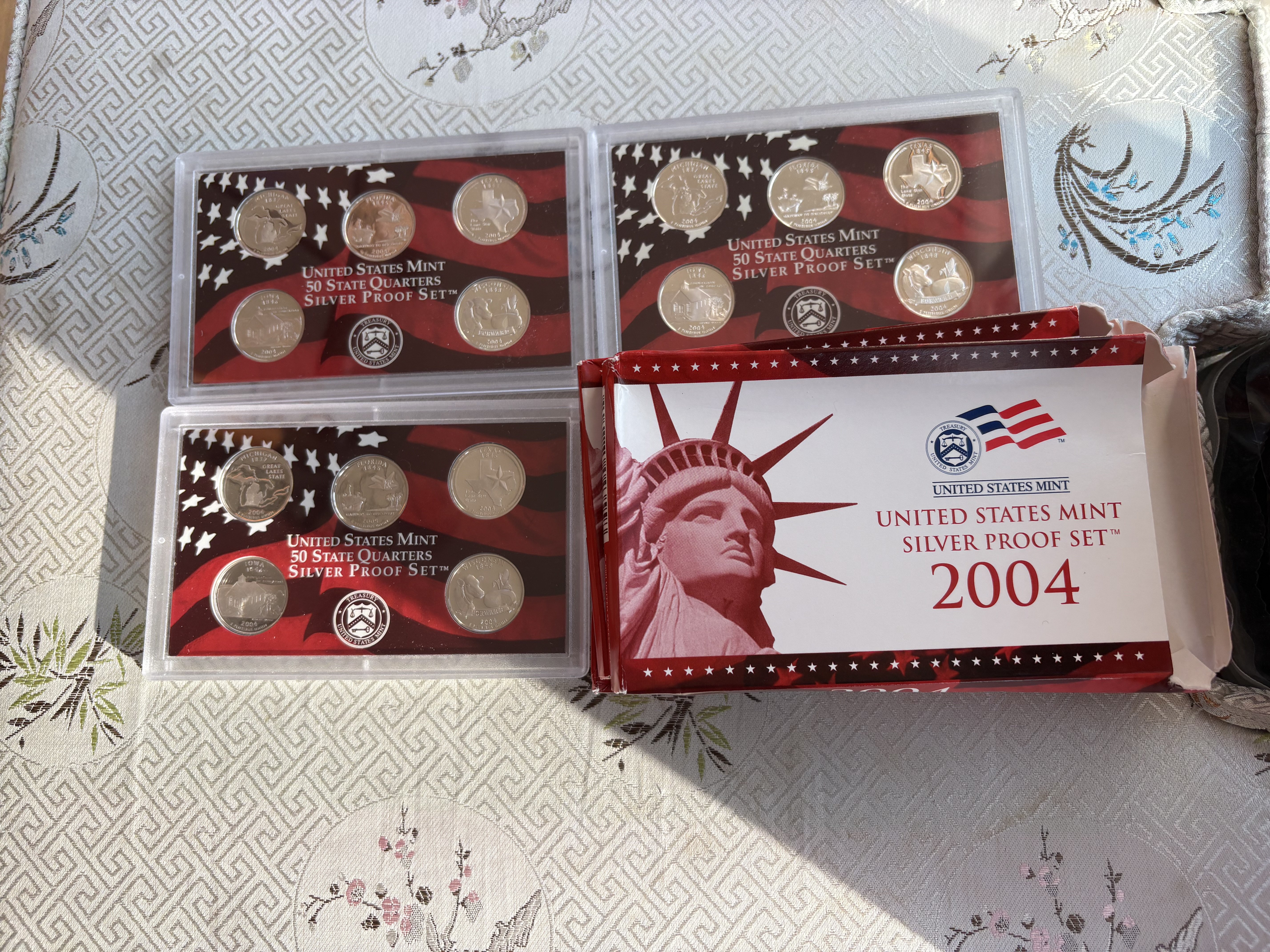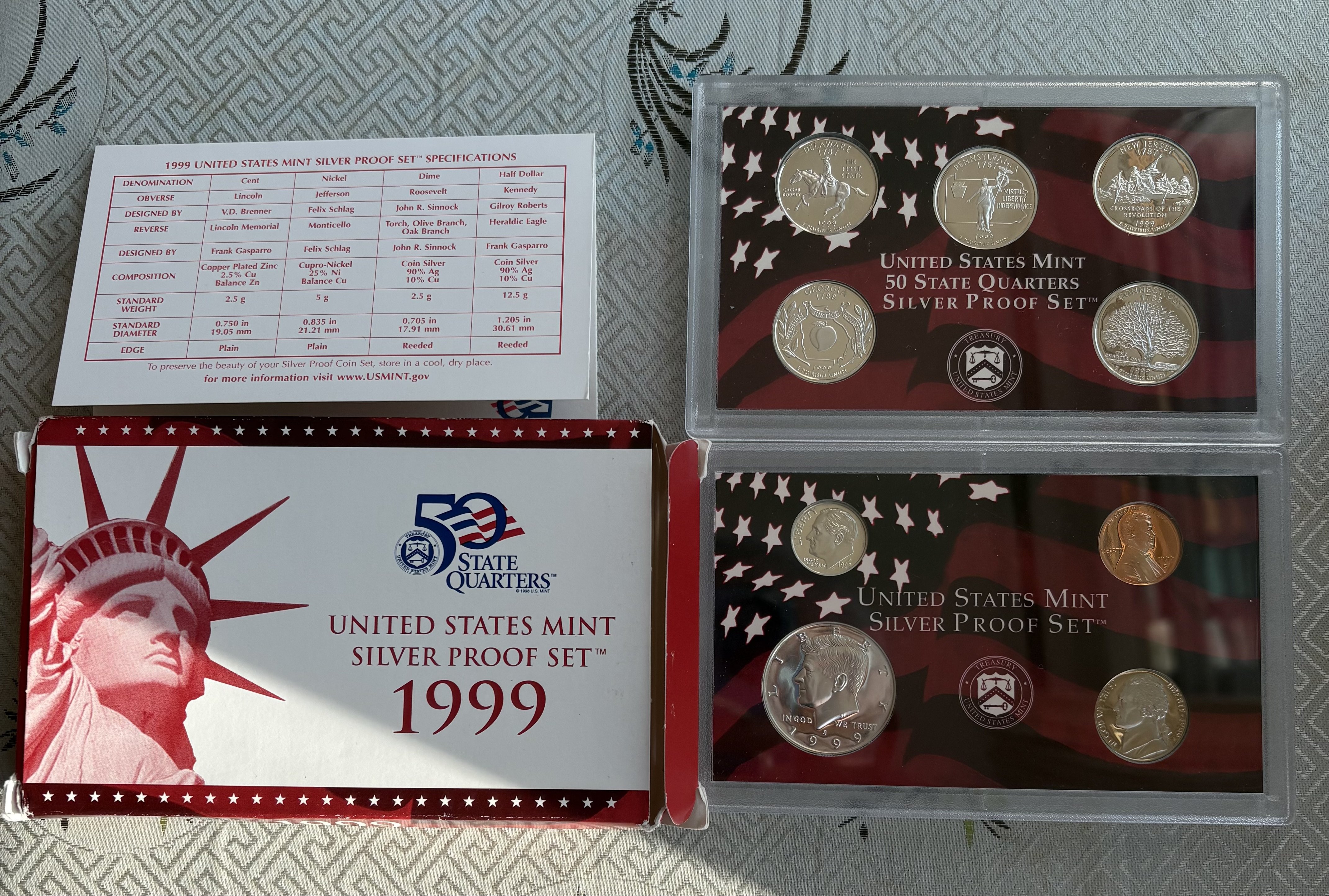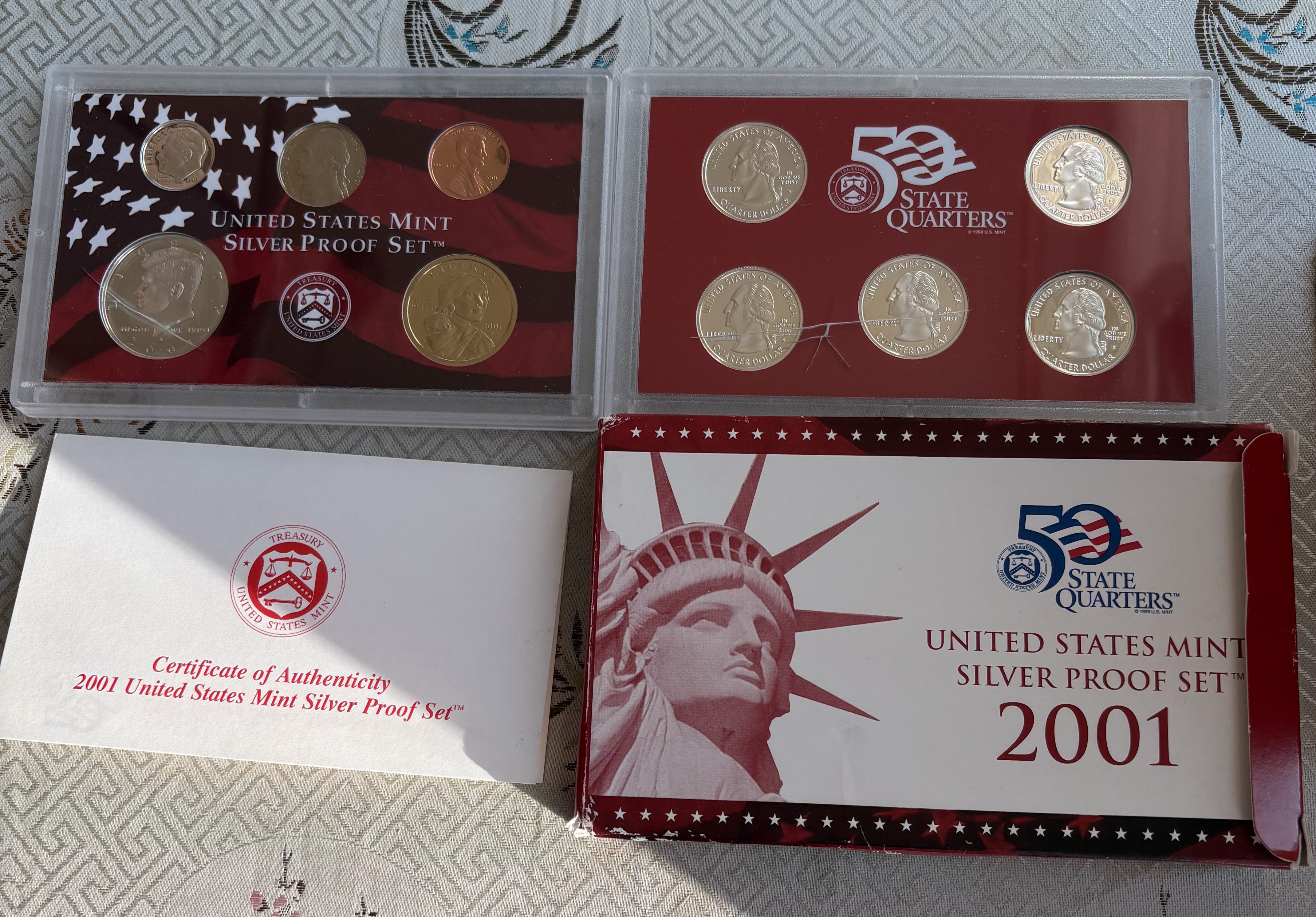 one 2001 complete silver proof set, minor cracks on the plastics.
