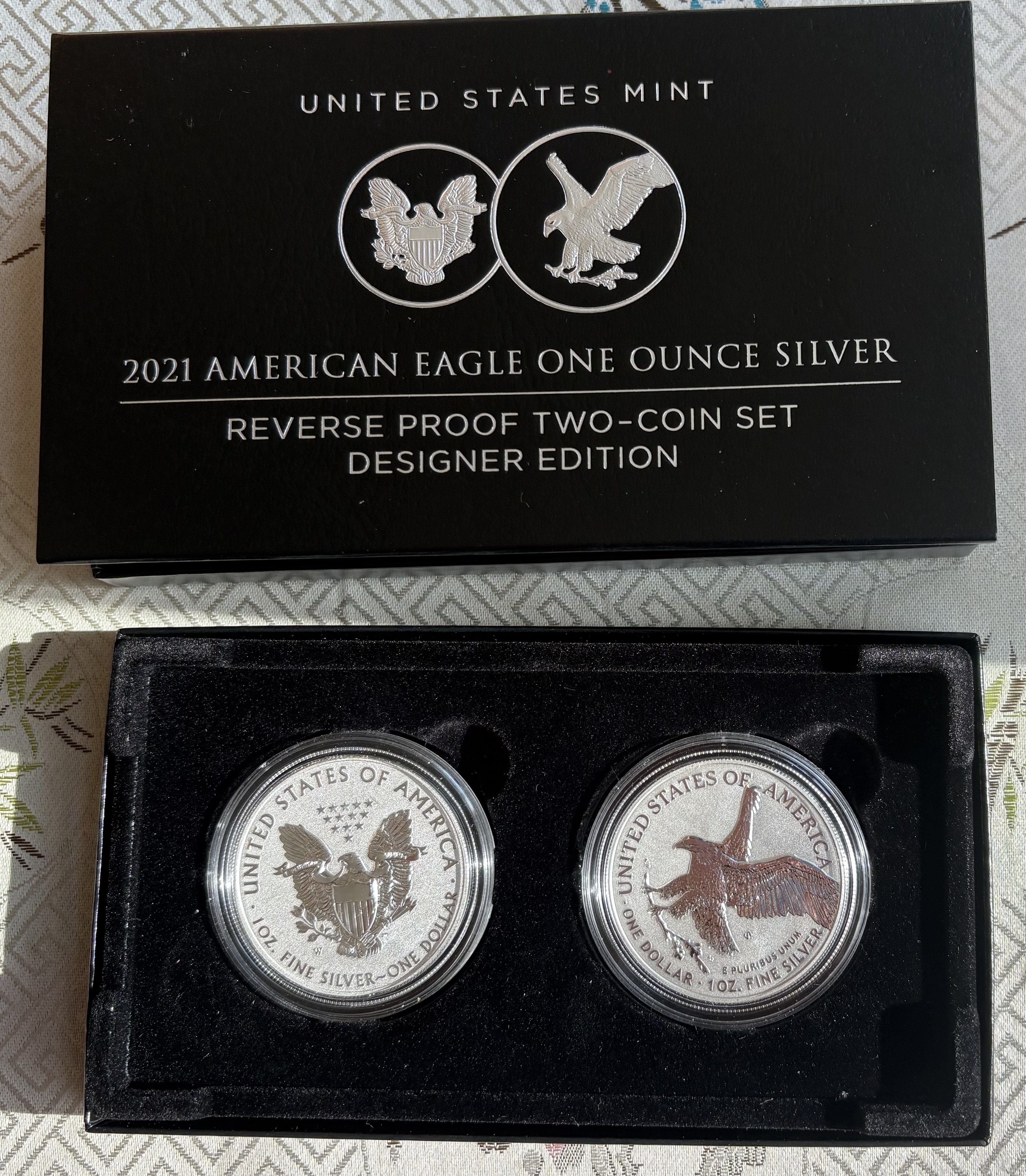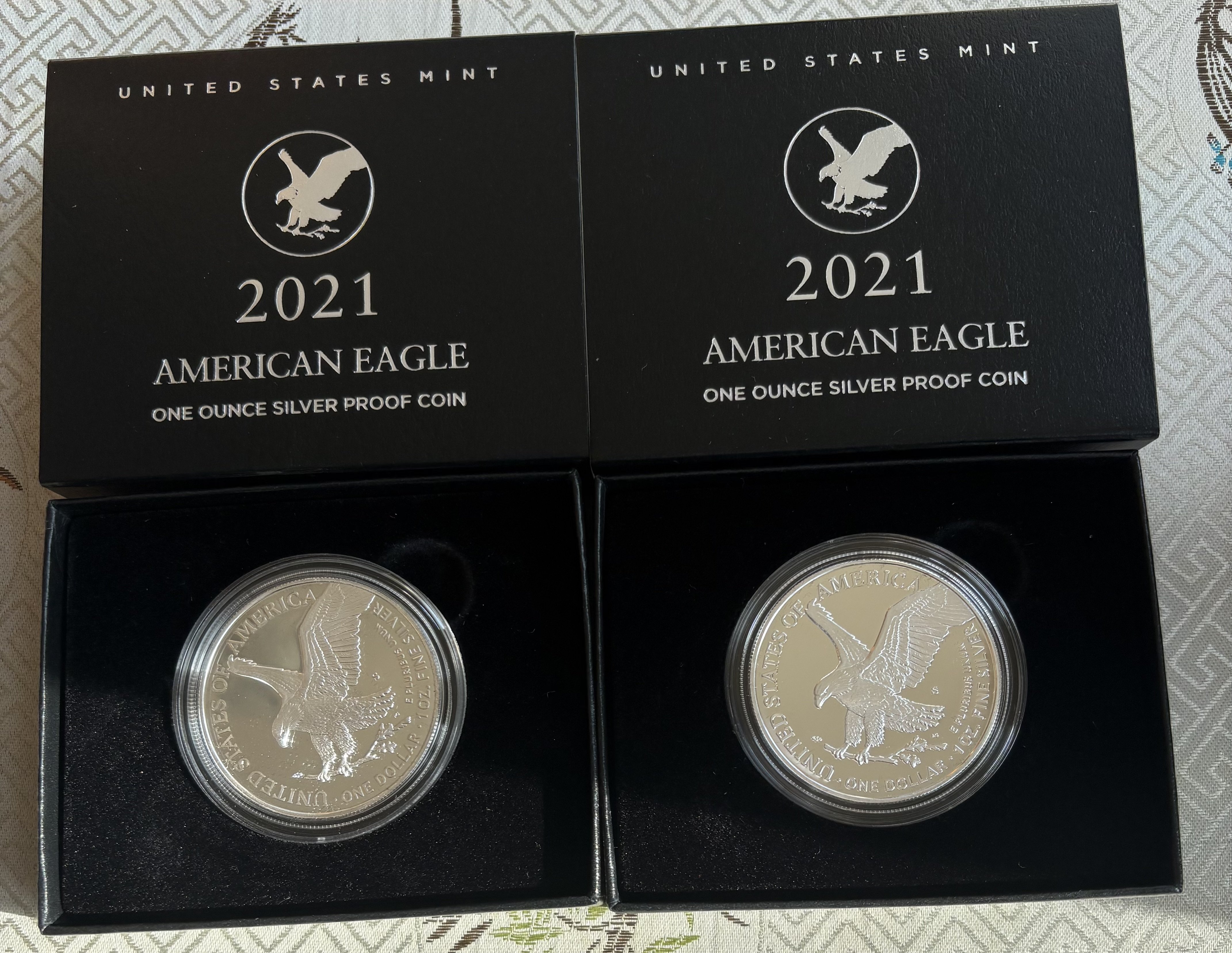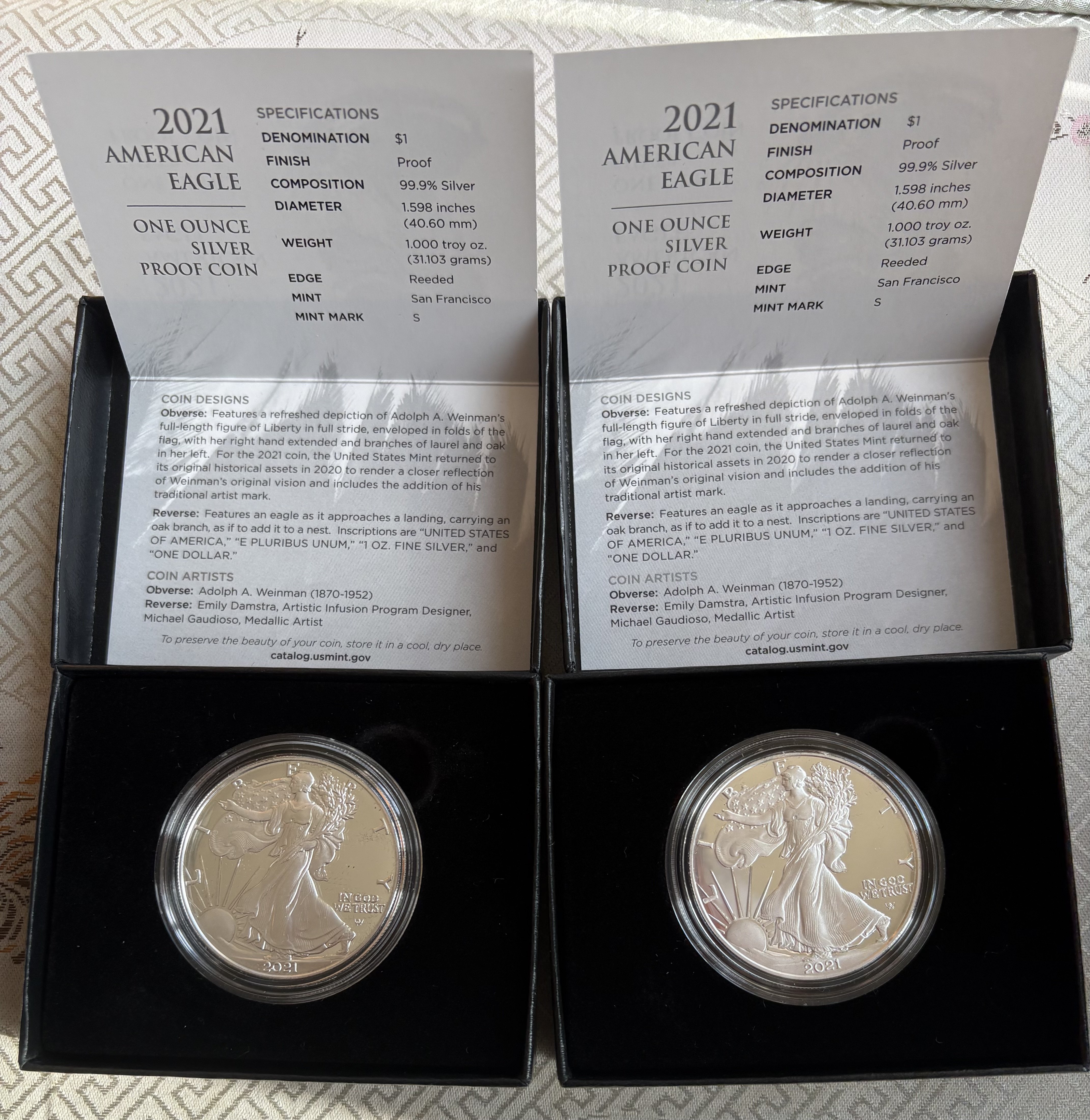 Silver Coins/Proof Below Melt and 2021 Reverse Proof American EagleTwo Coins Set, 2 American Eagle