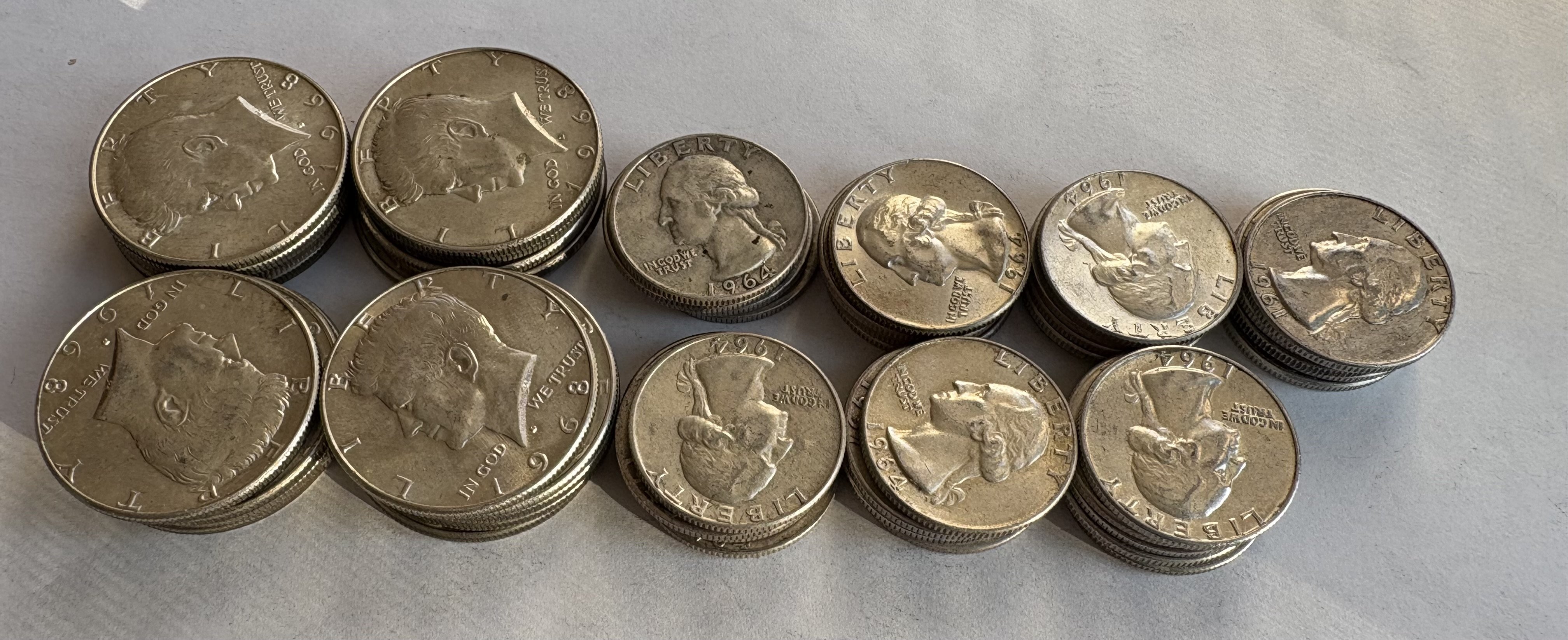 Total: 5+5+35 =25 silver quarters, one silver Kennedy, one silver dime.