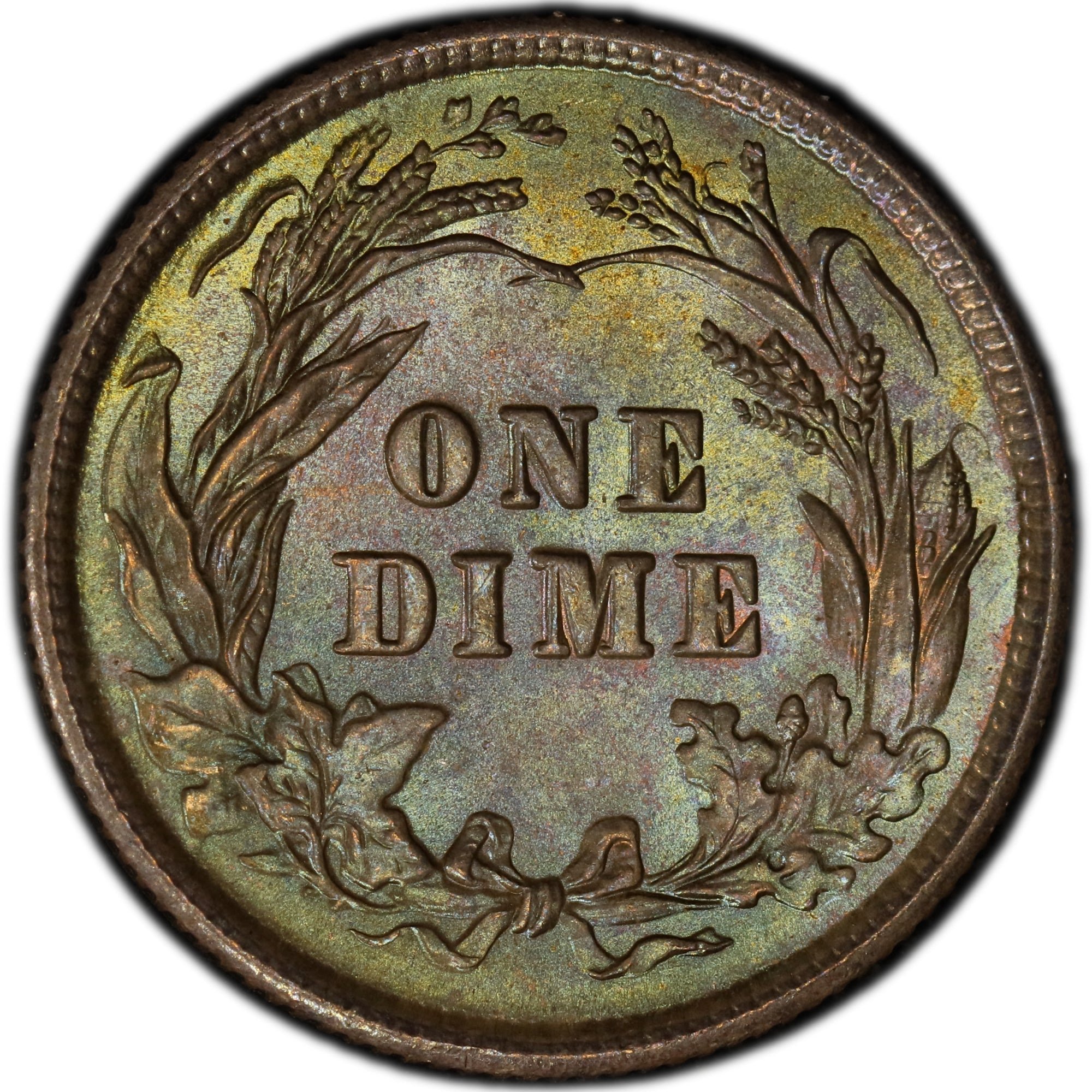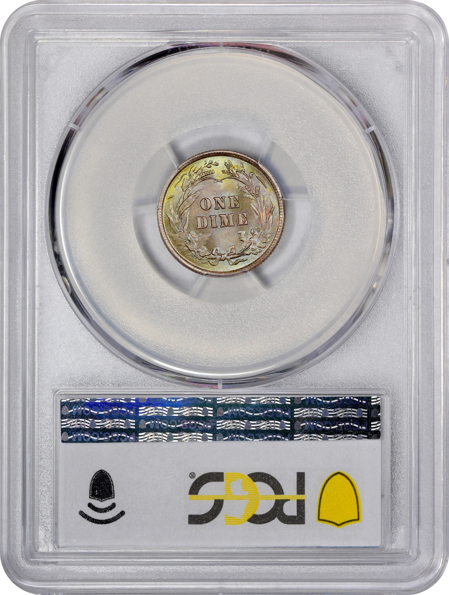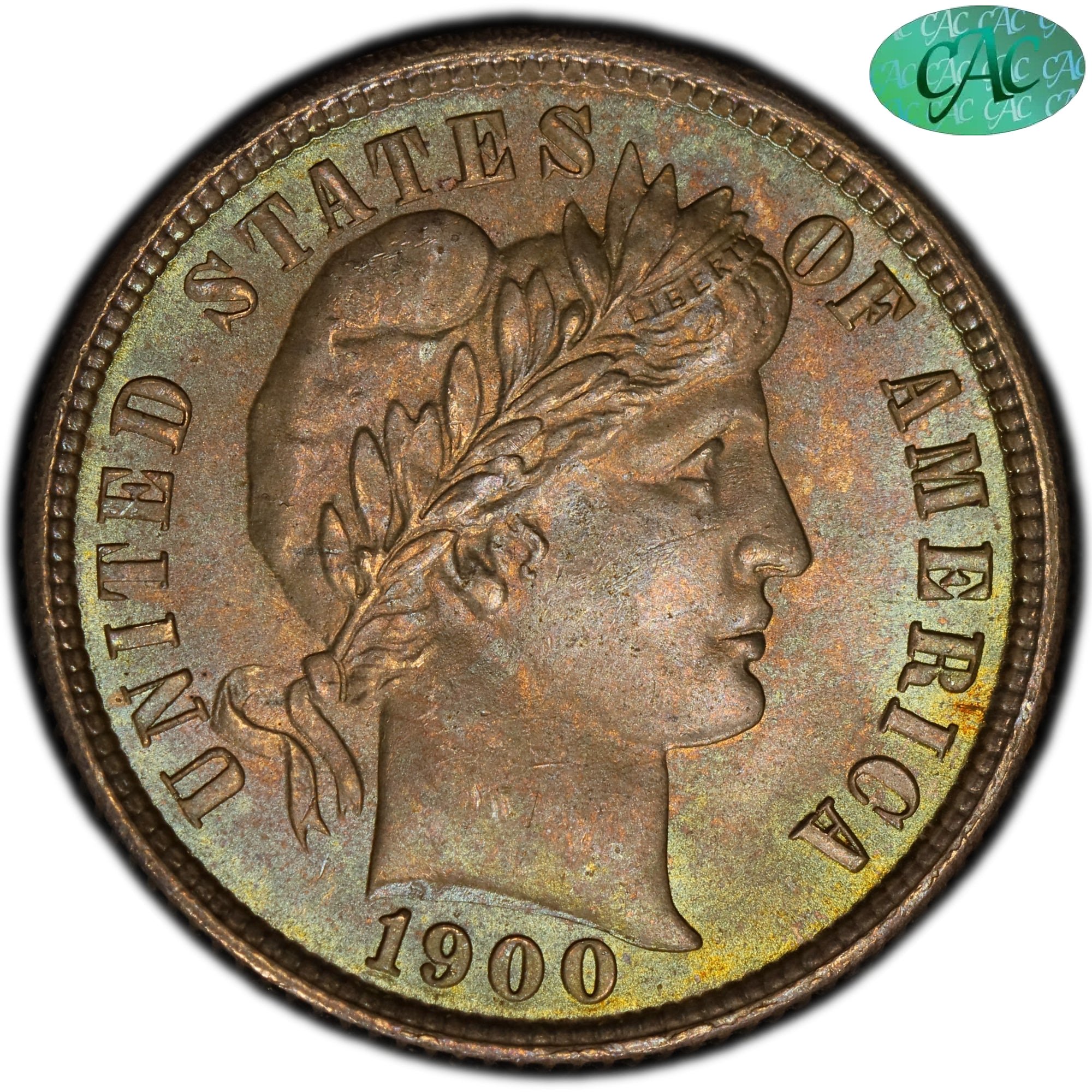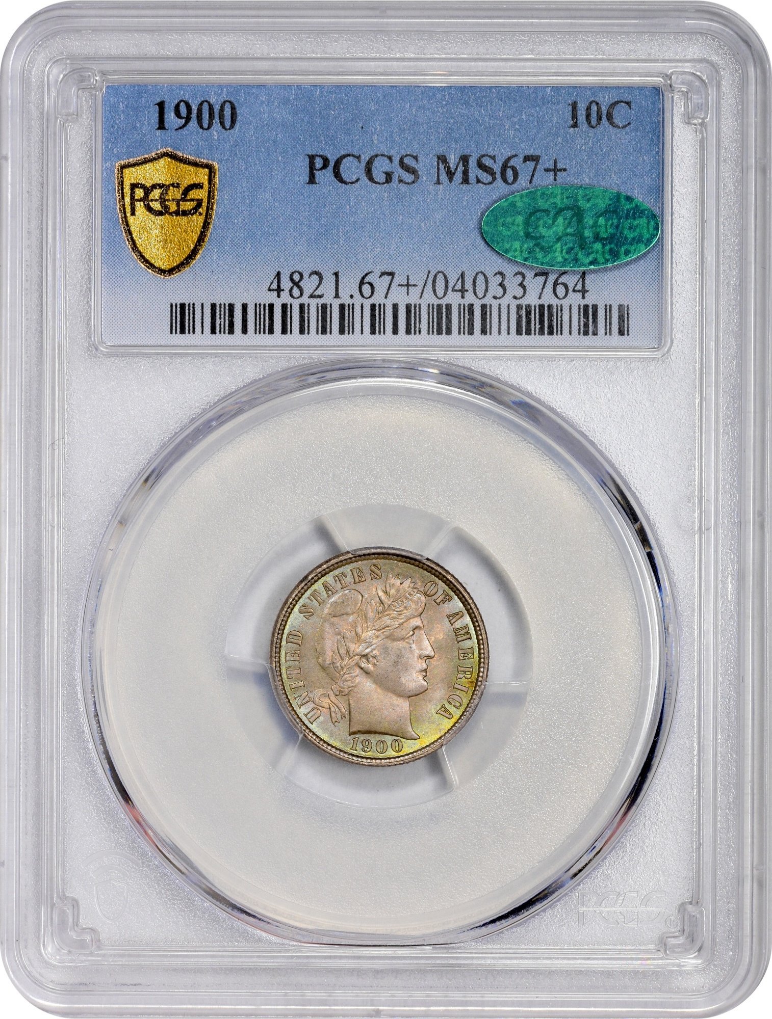 Pop 2/0, Tied For Finest. The 1900 Barber Dime, certified PCGS MS67+ and CAC-approved, stands as a true Superb Gem condition rarity, tied for finest known with none finer at either PCGS or CAC. Though modestly available in lower Mint State grades, this issue becomes exceptionally scarce at the MS67+ level, particularly with CAC endorsement. This piece offers a visual masterpiece of rich, multi-hued album toning, with the obverse showcasing vibrant cherry-red at the rims, flowing inward into amber, goldenrod, pale olive, and soft rose, all encircling areas of untouched silver brilliance. With no sales of an MS67+ CAC example and just one other certified at this level, which is the ex Lily Nicole Collection - clearly an inferior example which is permanently tied in the Hansen Collection, this extraordinary dime is not only a visual standout, but by all measurements is the single finest 1900 Barber dime.