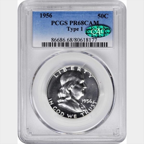 Available for sale is a 1956 Proof Franklin, Type 1, graded PR68CAM by PCGS with a CAC sticker. The Type 1 is the much tougher major variety in higher grades!