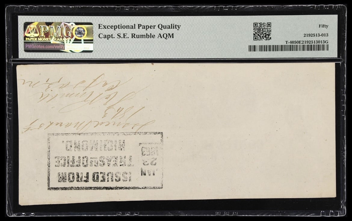 You have no doubt noticed the signature on the back of CSA Capt. Steven E. Rumble, AQM (along with the notation on the holder), indicating that this note is a military issue released by him, likely as pay for service in the CS army.