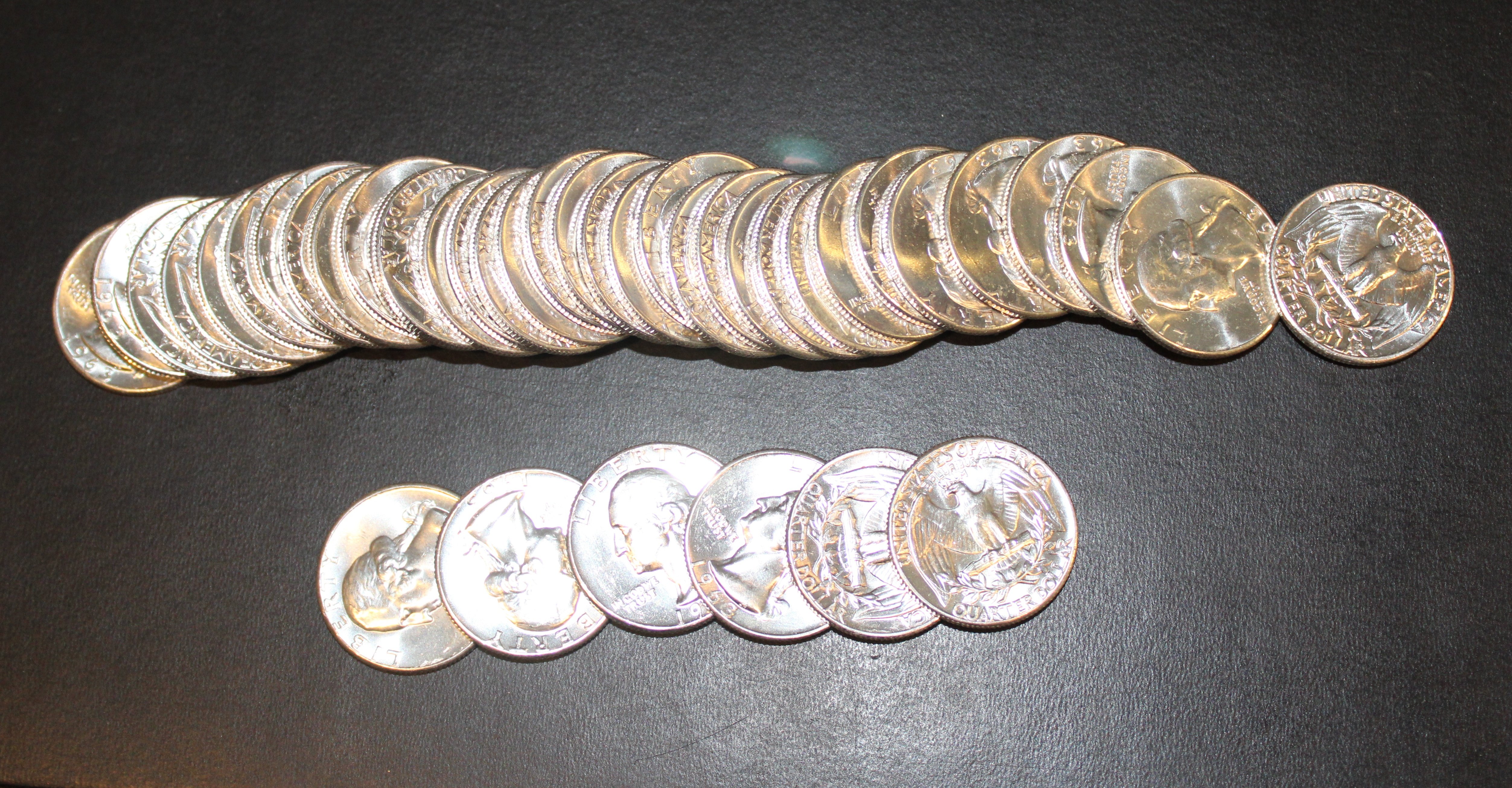 Picked from a hoard of 50 rolls of 1963 Washington's, this is a full roll of 40 uncirculated Type B coins. All uncirculated coins, most all are blast white. $700 plus $12 shipping.