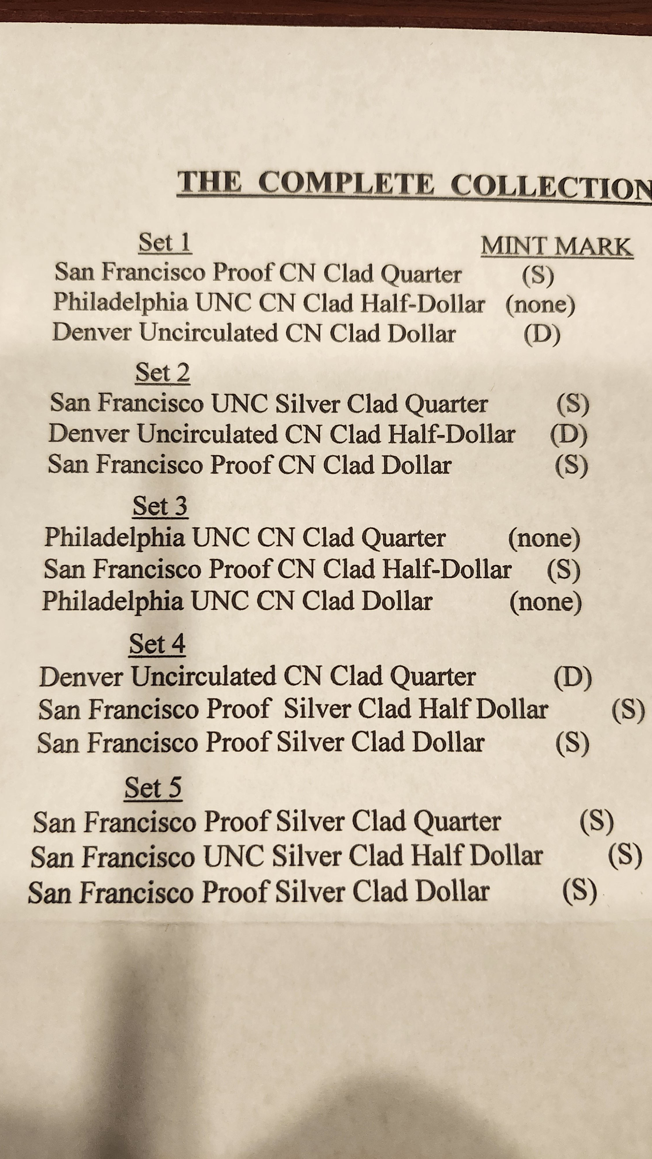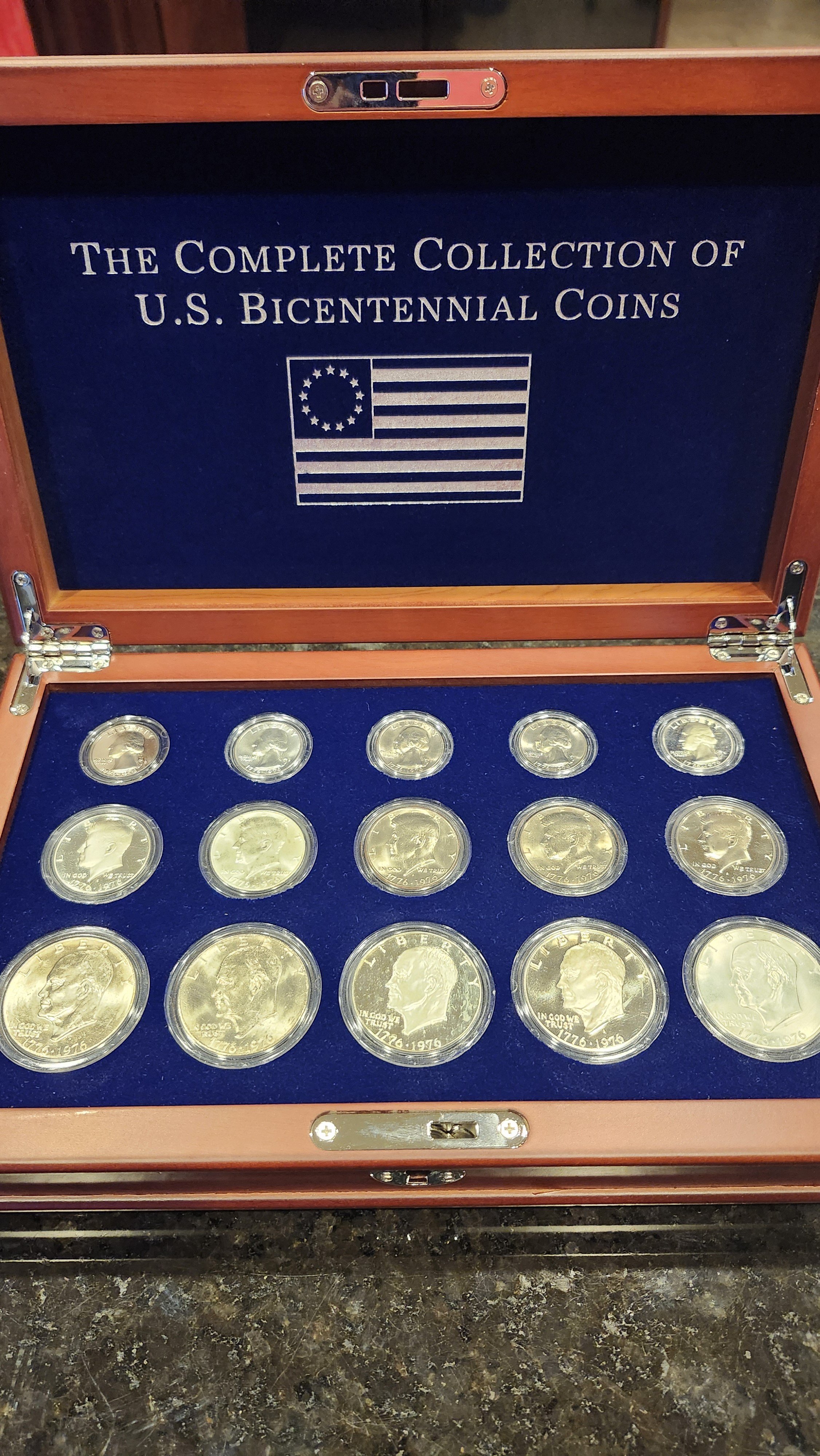 According to the description there is $3.50 in silver clad, but the bottom right dollar looks like an uncirculated silver clad dollar and it is not on the list. Roughly $60 for silver value. I imagine the set must be worth near $100 retail.