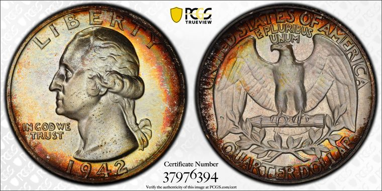 1942 Type 2 PR66. VERY colorful "manganese" toning on this one. You can get a sense of this from the picture of the reverse below, but MUCH more in hand.