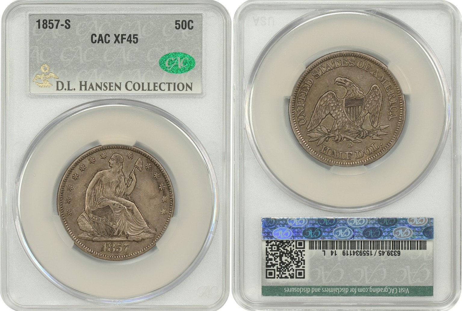 When his liberty seated quarters were sent to CACG, only 49% crossed. Included in the 51% that wouldn't cross, are very average circulated examples of the following dates: 1842, 1849-O, 1855-O, 1858-S, and 1859-S. His collection does include a great number of stunning top pop gems, which is a result of having unlimited funds.