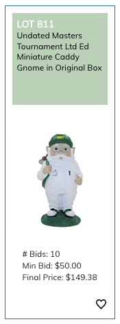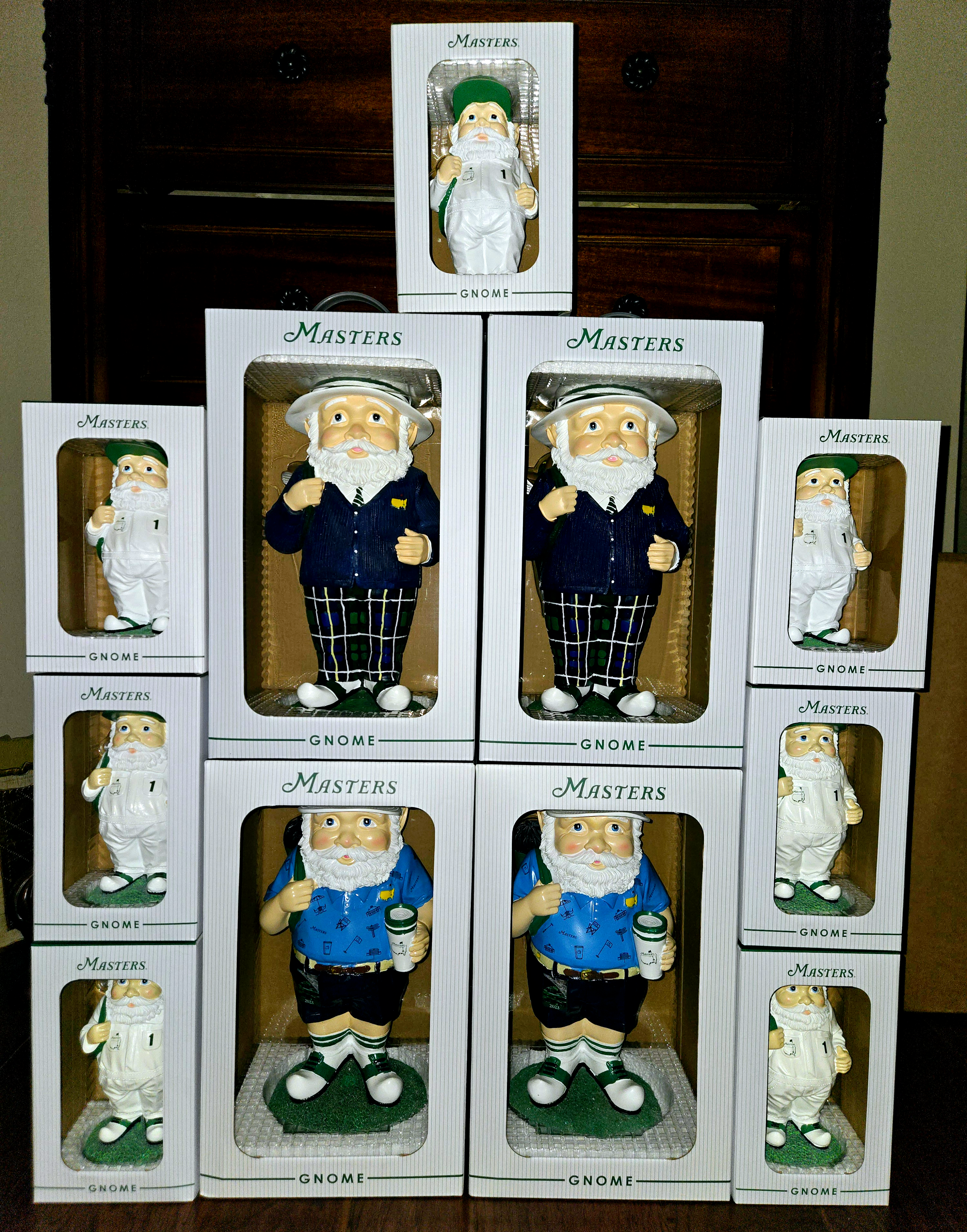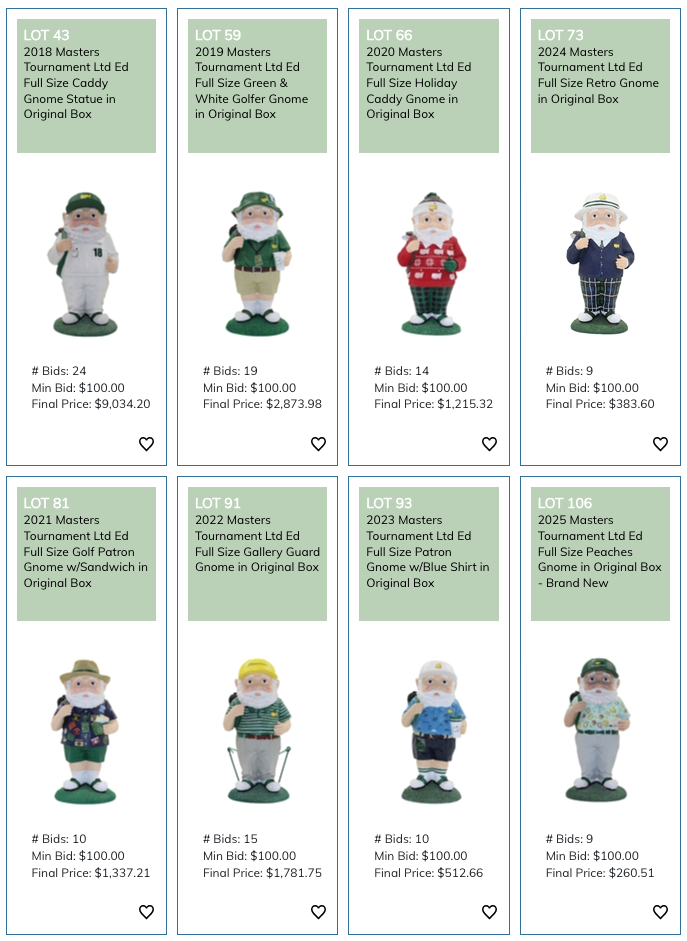 here are some interesting collectibles -- Masters gnomes. back in 2016, Augusta National started pumping these out for sale at the tournament. for some unknown reason, they didn't come out with one in 2017. but they picked back up in 2018 and produced a different gnome each year until 2025. they were available in the merch shop at (1) per person. and the reason they limited them to one per is because they sold out very quickly -- often times within an hour of the gates opening. the very first thing that the majority of patrons do when they set foot on those hallowed grounds is make a beeline to get one. and the reason i speak of them in past tense is because 2025 was the final year for the gnomes, by all accounts.