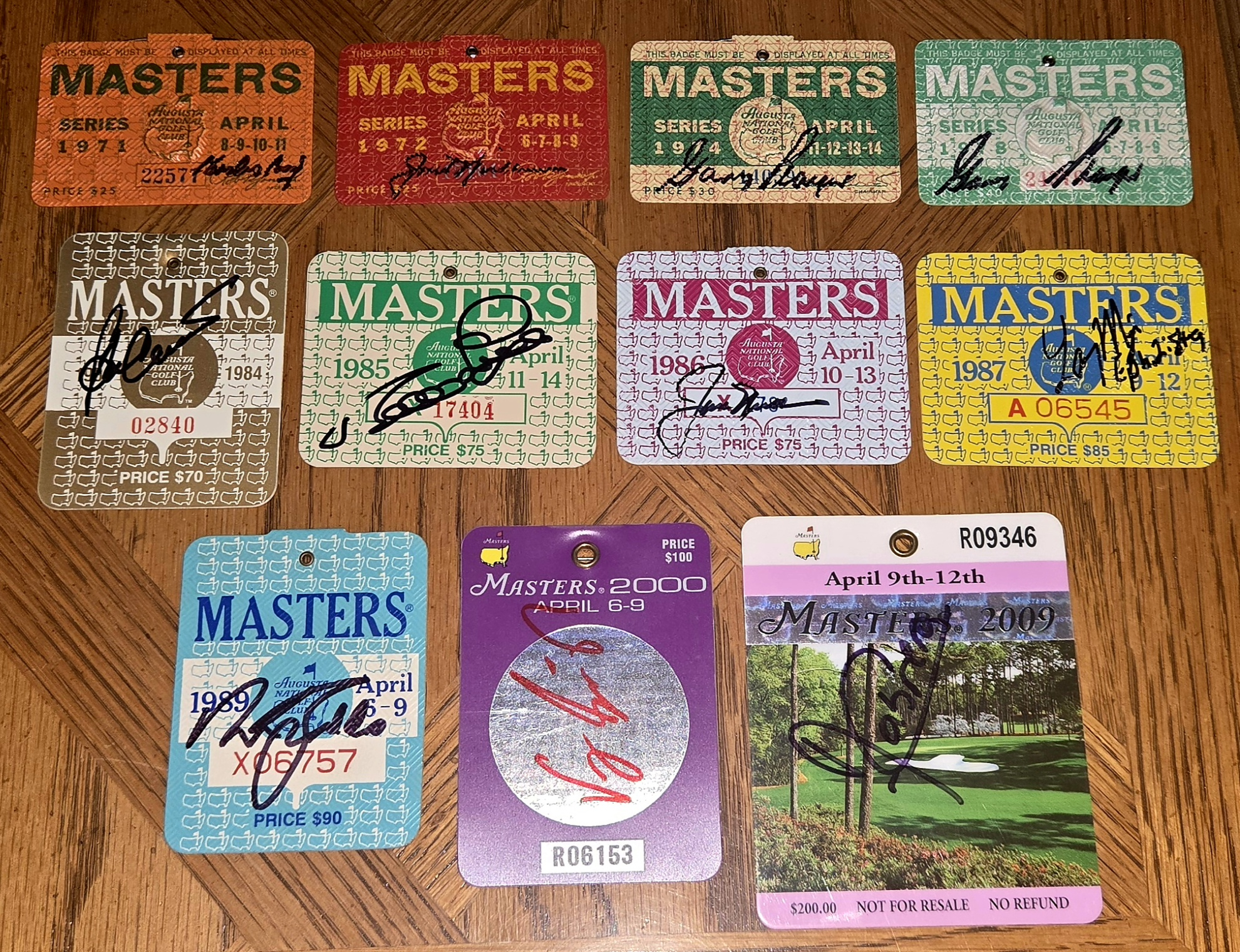 in terms of sports, it's my favorite week of the year. so no better time than the present to chew up a little bandwidth with some Masters badges. a few years ago i added them to the equation, and i wish it had been many years ago. i love these things, and i love getting them signed. hopefully there will be more in about a month. the Mickelson is currently at JSA, so it was unable to make the picture.