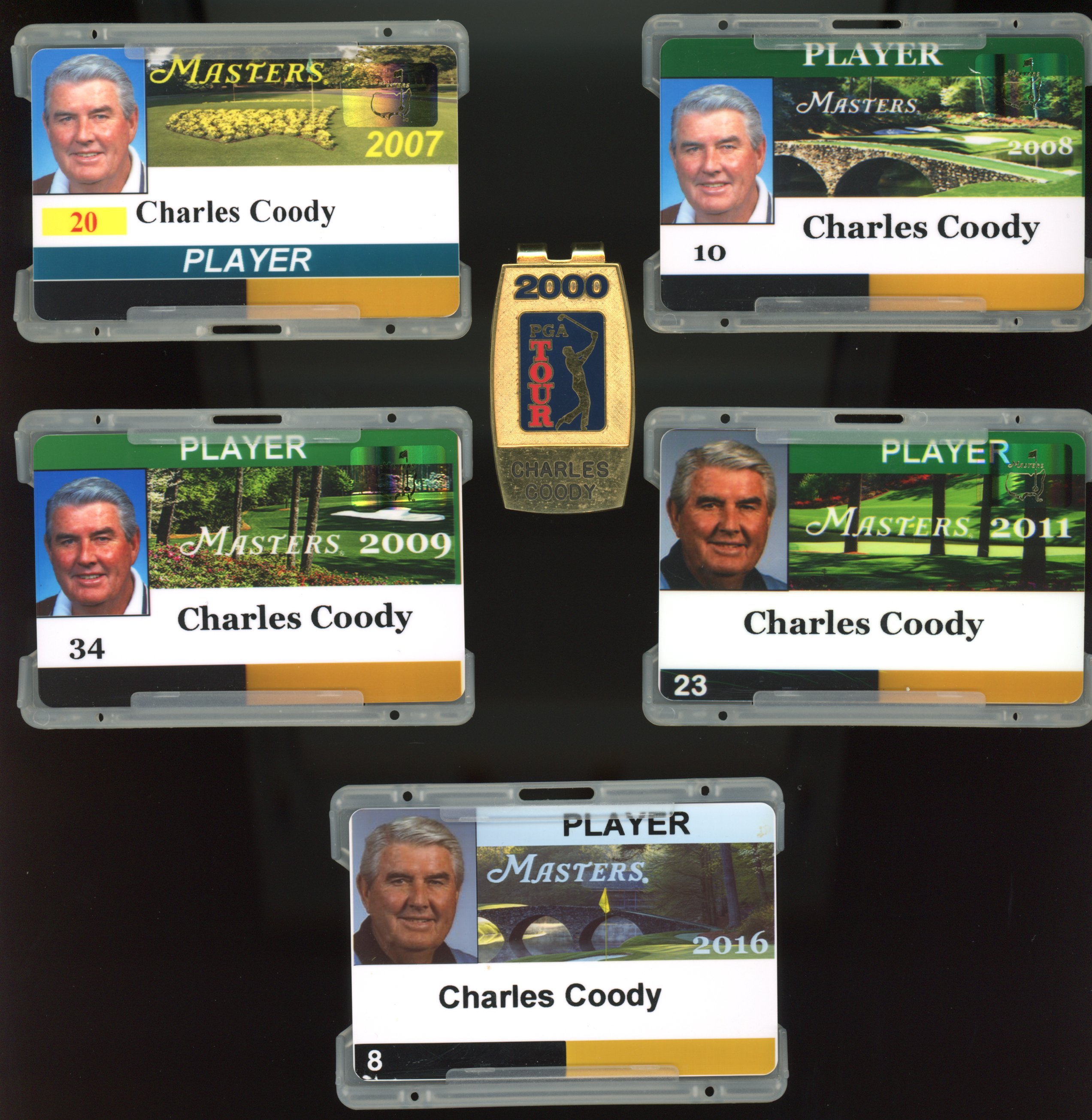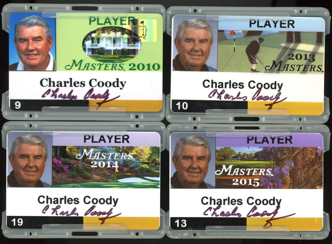 this man won the Masters back in 1971. Mr. Coody is from my hometown. he owned a course in Abilene for many years, but he sold it back in 2023. i sprayed balls around that track many times, and one time i showed up locked and loaded just in case he was there. every past champ is given a Masters badge for the week. they are very difficult to find, let alone obtain. a handful of years ago Mr. Coody sold off a large portion of his goodies via an online golf auction and these were included. i was bound and determined to win as many of them as i could. i find them inherently cool. i love not only the look, but also the fact that they are 1/1s. when i walked into his office and asked if he had time to slap his John Hancock on an item, he graciously obliged. in fact, he asked if i had more than one as he was signing. i had all 9 with me, but i told him i only had 3 more. i didn't want to be that guy. but believe you me, he would have willingly signed all of them. a very nice man he is. probably the best head of hair of any 88-year-old on the planet.