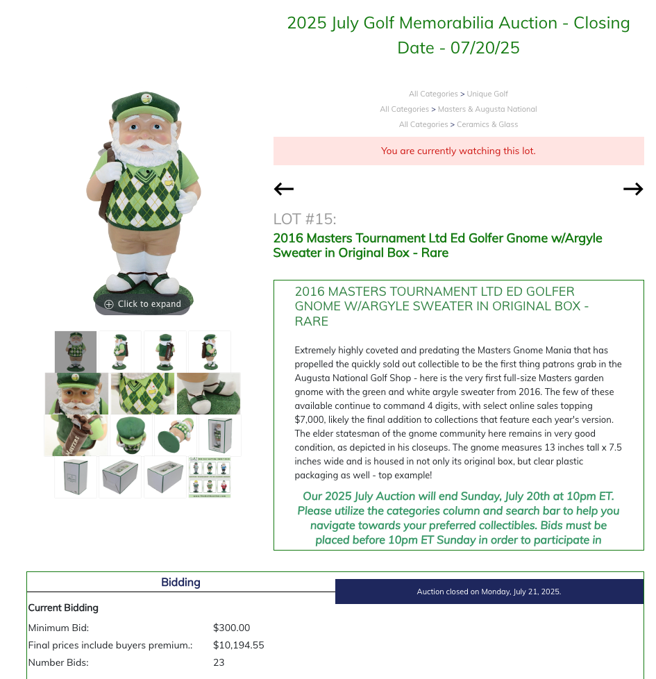 if you're wondering what they cost at the tournament, i took a look at mine (final picture below) just now. the mini gnome was $29.50. the full-size gnomes were $49.50 in '23 and '24. so i'm guessing that the first gnome back in 2016 cost around $25 in the merch shop. fast forward to July of last year and one hammered for $10,194.55 in an auction (first pic below). that's an ROI of almost 40,000%, with an annualized ROI of almost 85%. that makes a share of Tesla blush.