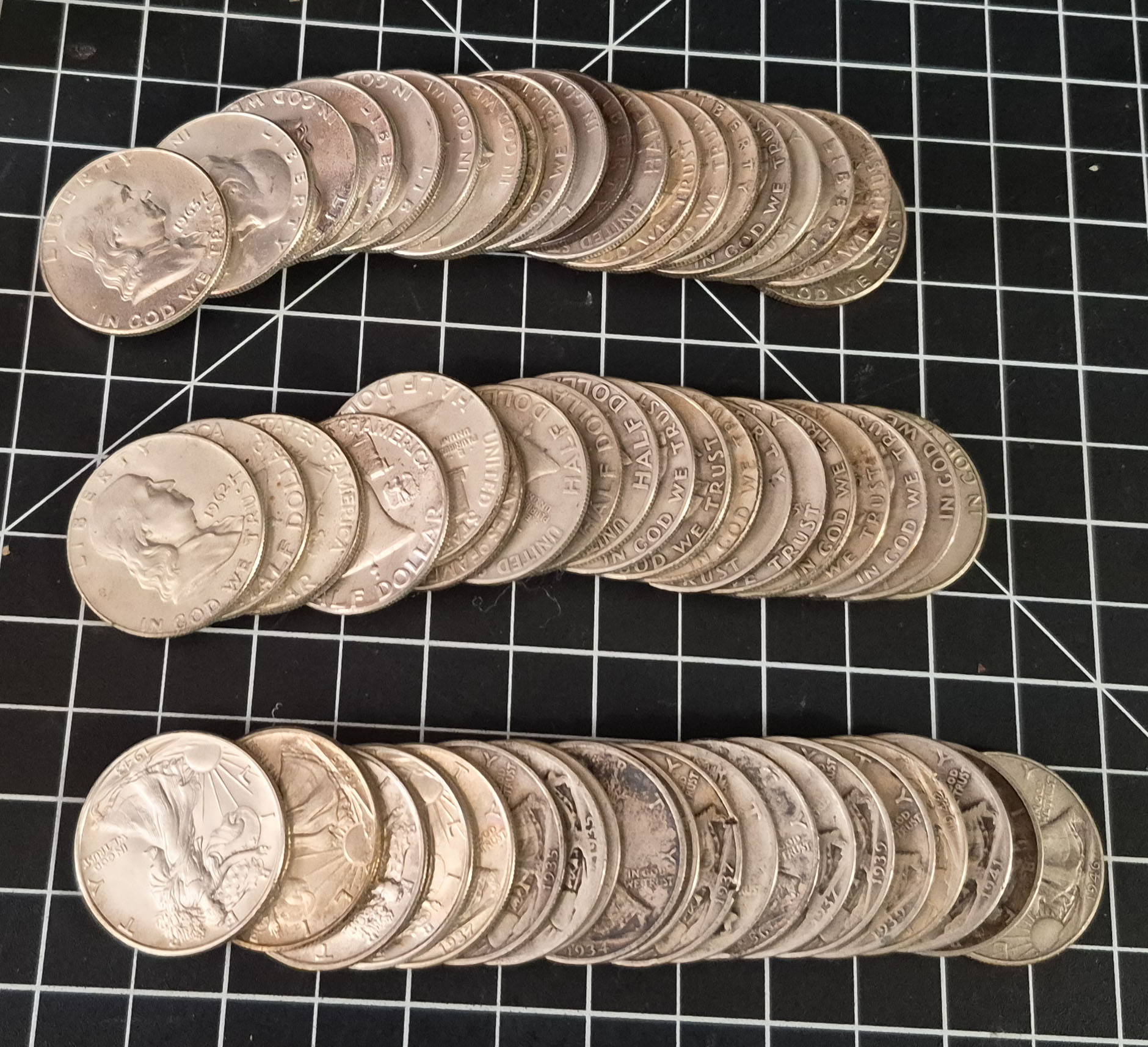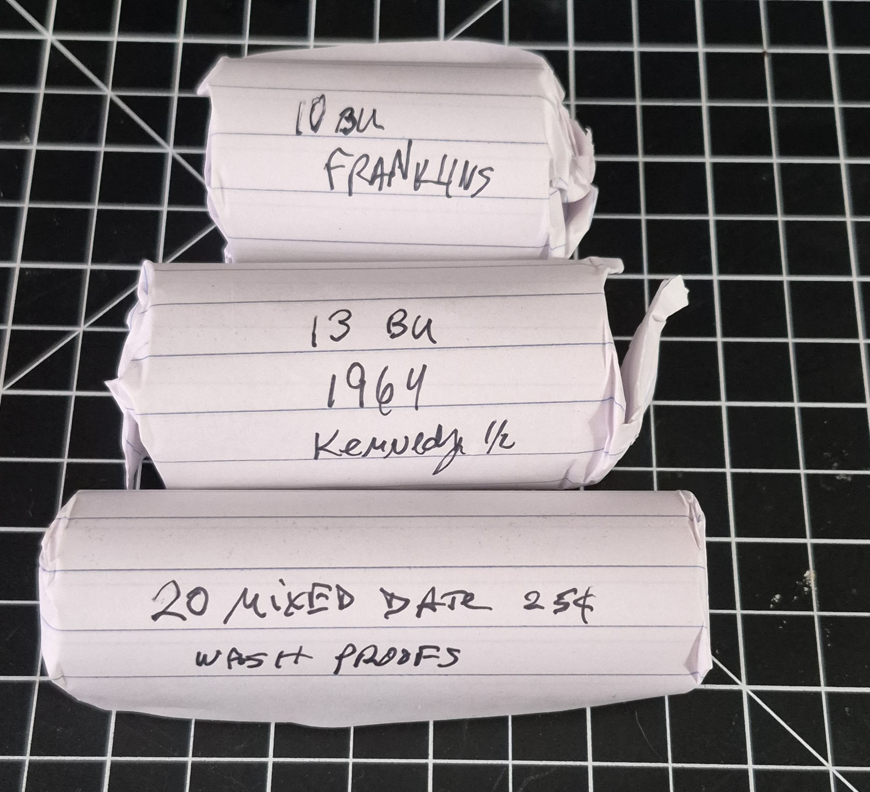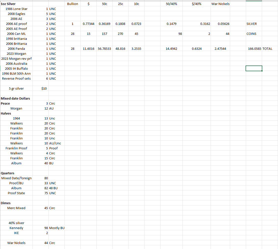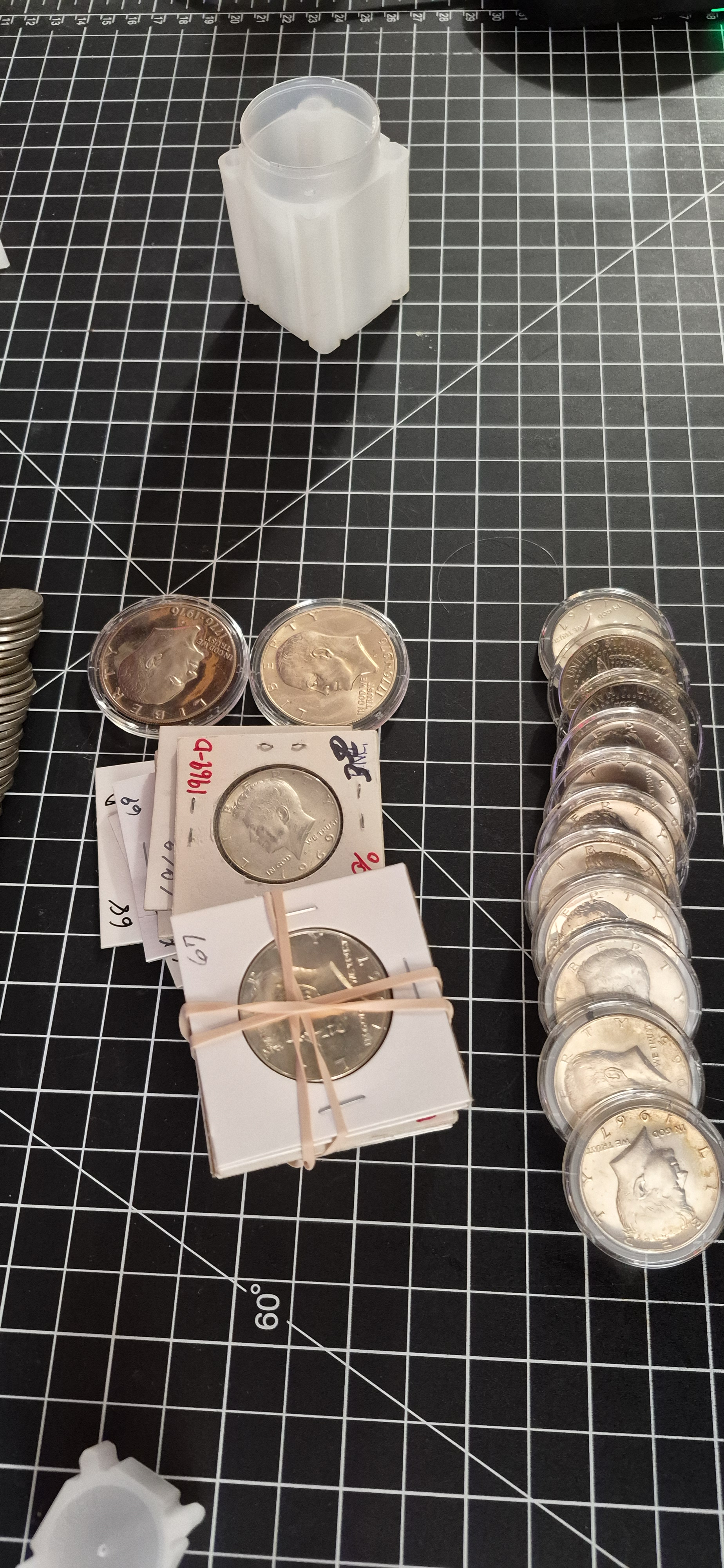 Among the coins are two pristine BU rolls of 40% silver Kennedy halves. My personal uncirculated Franklin collection. Mixed date BU and Proof quarters and a dozen or so AE silver coins, A roll of circulated liberty halves, some AU/BU. I can take pictures and or provide a detailed list if there is any interest here. I am asking for spot bid minus $4 which is great for you and better than I can get at the local coin shop.
