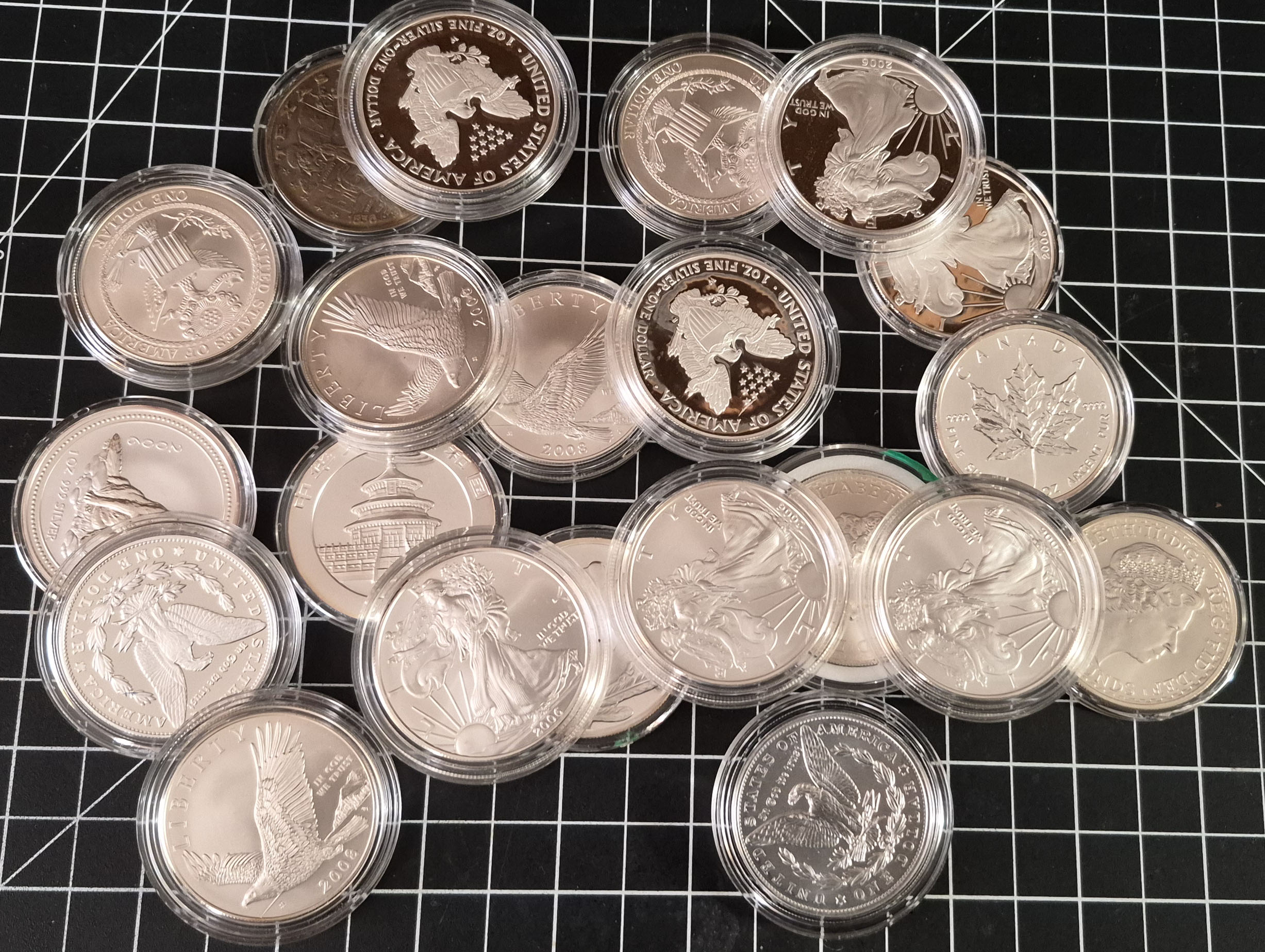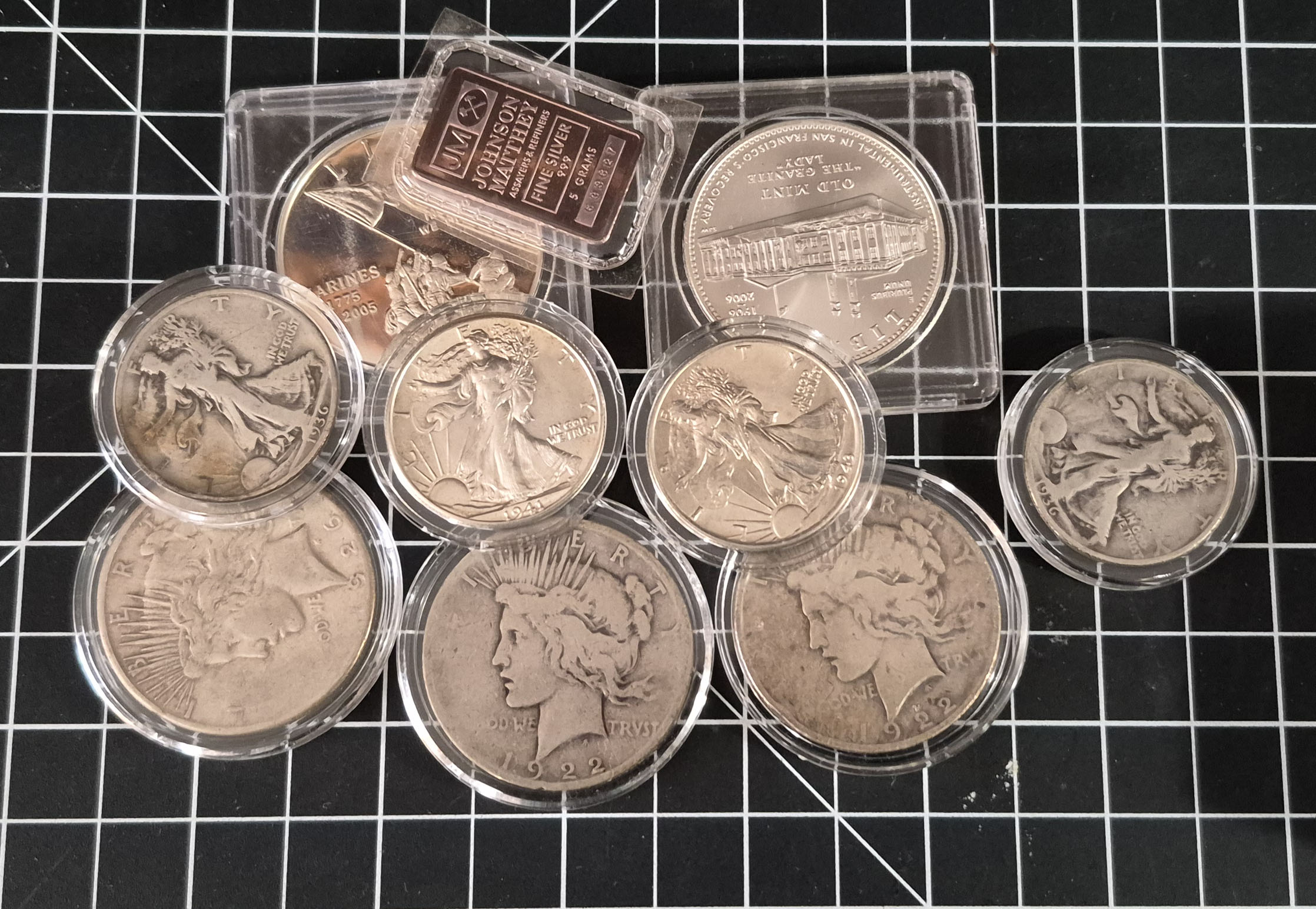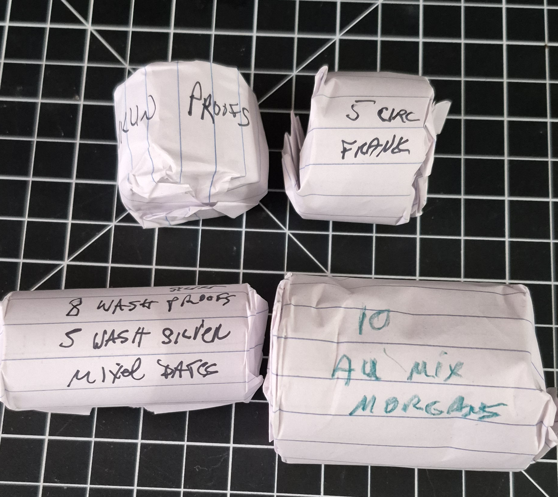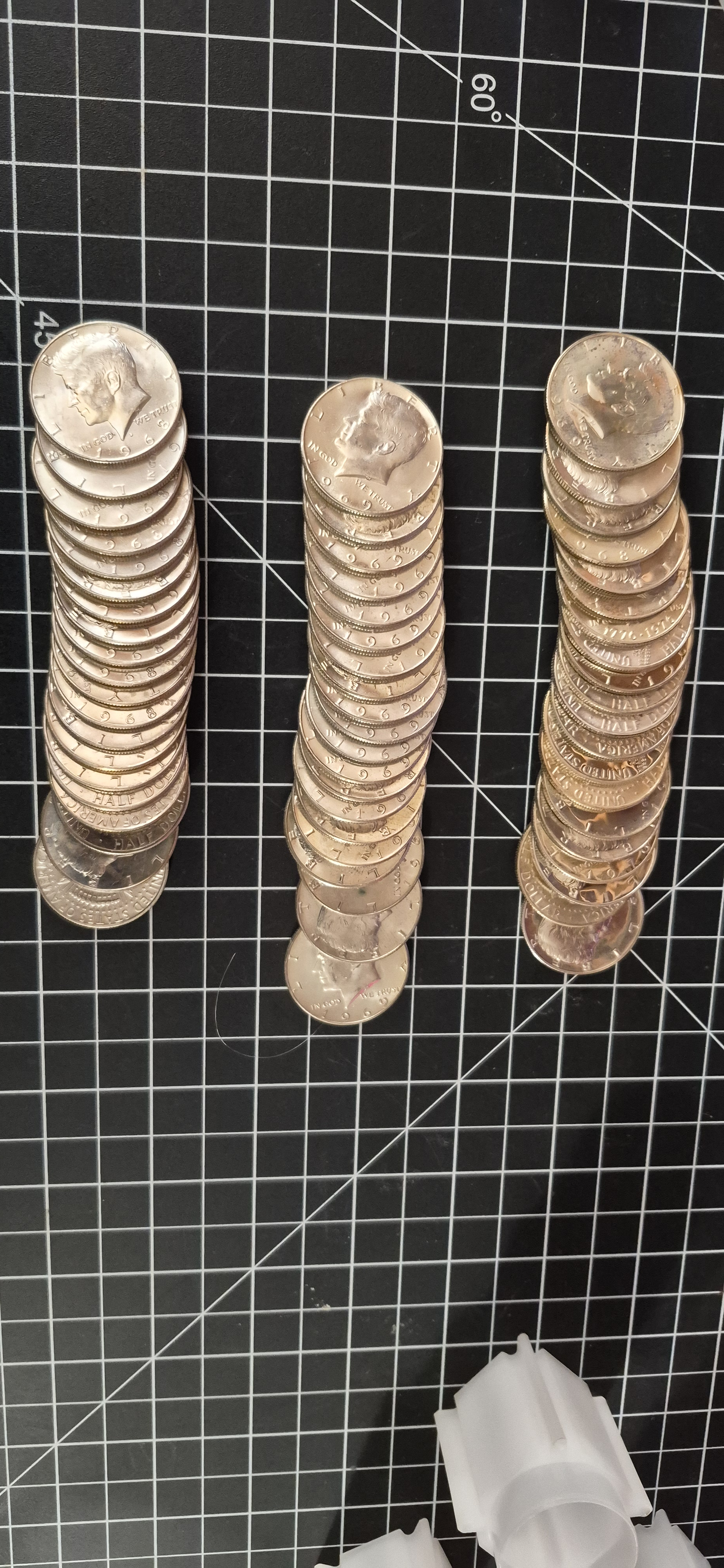 Among the coins are two pristine BU rolls of 40% silver Kennedy halves. My personal uncirculated Franklin collection. Mixed date BU and Proof quarters and a dozen or so AE silver coins, A roll of circulated liberty halves, some AU/BU. I can take pictures and or provide a detailed list if there is any interest here. I am asking for spot bid minus $4 which is great for you and better than I can get at the local coin shop.