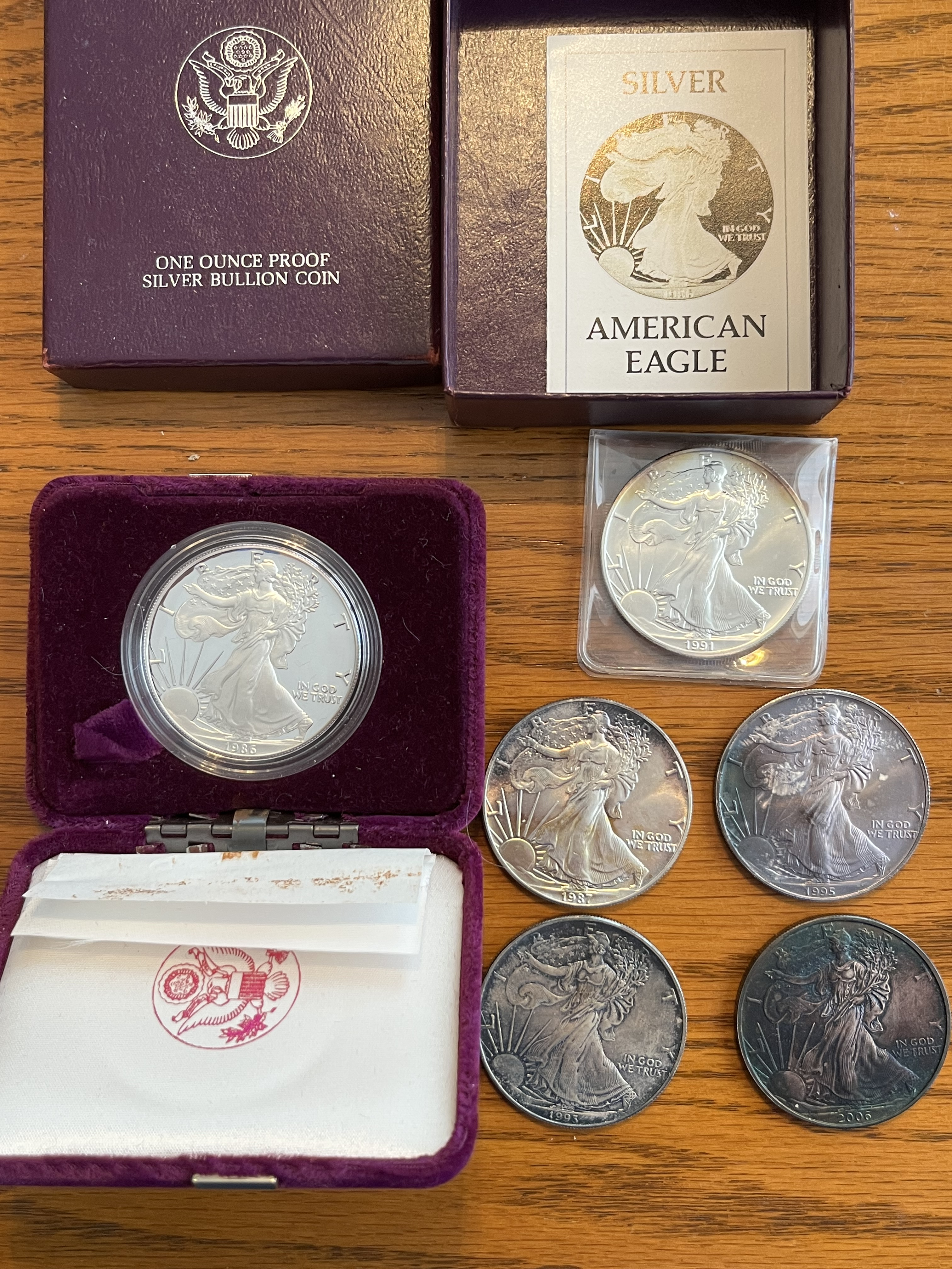 5 mixed/better dates of Unc ASE's, most showing toning, plus one 1986 Proof with original box and COA, $440 delivered.