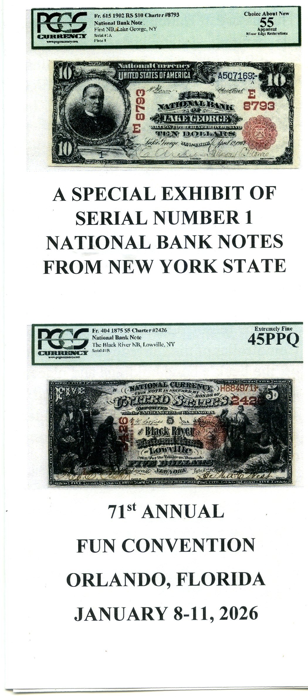 While not round-metal-disc related, one of the highlights of this year's FUN show will be all the paper money on display in the Exhibit area. There will be two HUGE Non-Competitive exhibits - Tony Swicer, the FUN President and a former resident of Kentucky, will be showing off FIFTY cases of Kentucky National Bank Notes from his personal collection and, yours truly, will have, on display, THIRTY cases of New York Nationals featuring over One Hundred and Twenty serial number #1 notes, both large and small. along with some Unique or other very rare notes. I put together a little brochure which will be available in the Exhibit area to explain to the non-paper money folks exactly where they're looking at. If you are attending the show, please stop by.